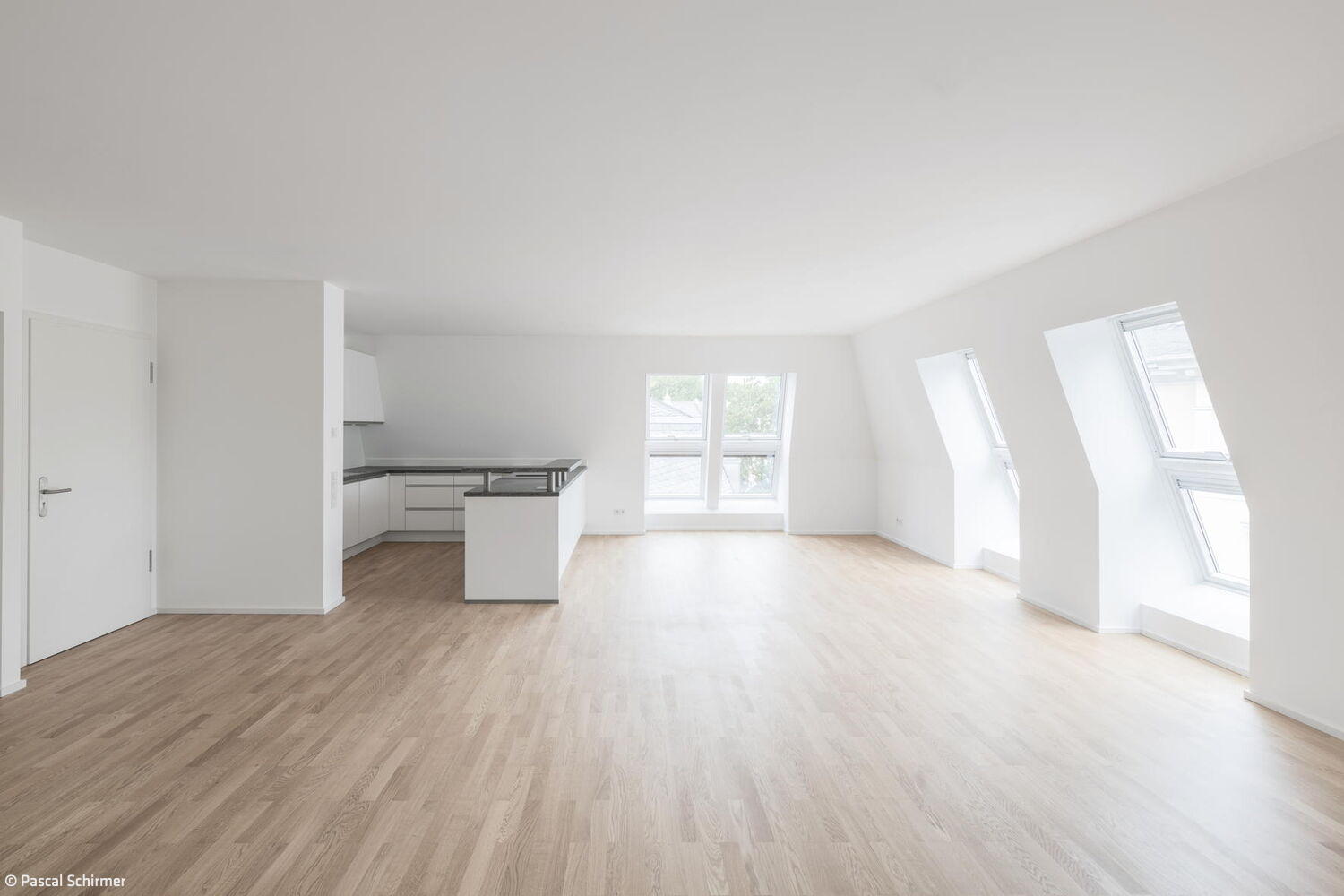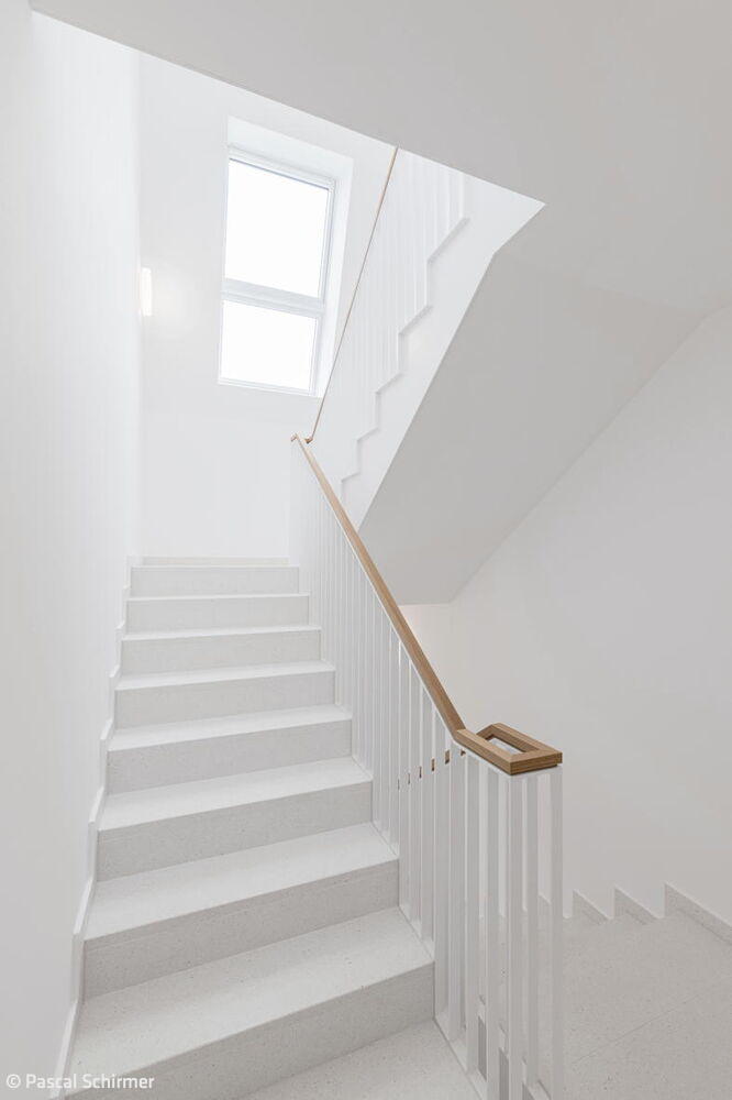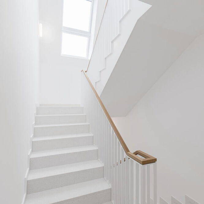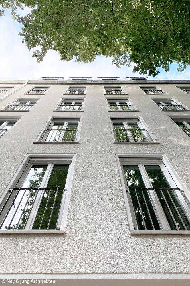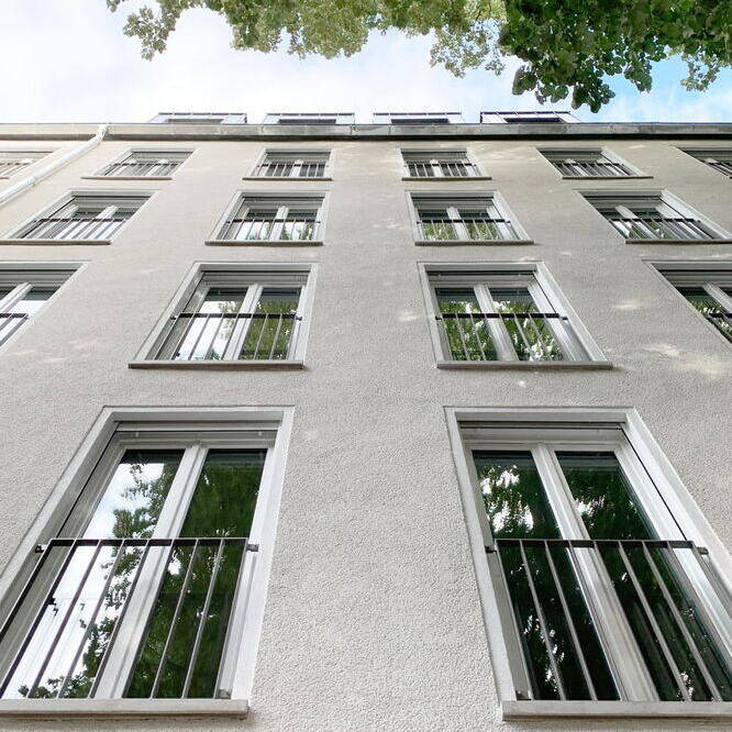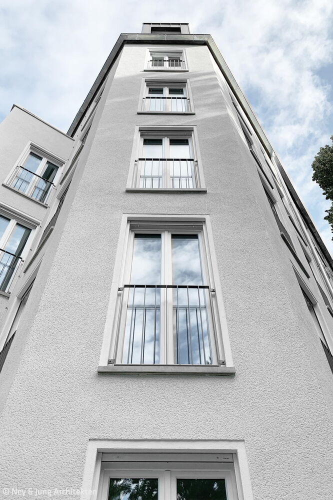 Der Neubau ist auch ein Beispiel dafür, wie Architektur sozialen und kulturellen Mehrwert schafft, wenn sie auf Haltung und Handwerk statt auf Rendite setzt. Denn hier wurde nicht spekuliert, sondern mit dem Ziel gestaltet: hochwertigen Wohnraum zur Miete zu schaffen – wirtschaftlich, aber nicht gewinnmaximierend. Acht Wohneinheiten, zwei davon als Maisonetten, sind entstanden. Insgesamt 946 m² Wohnfläche, verteilt auf fünf Vollgeschosse und ein Dachgeschoss. Darunter: eine Tiefgarage mit acht Stellplätzen.