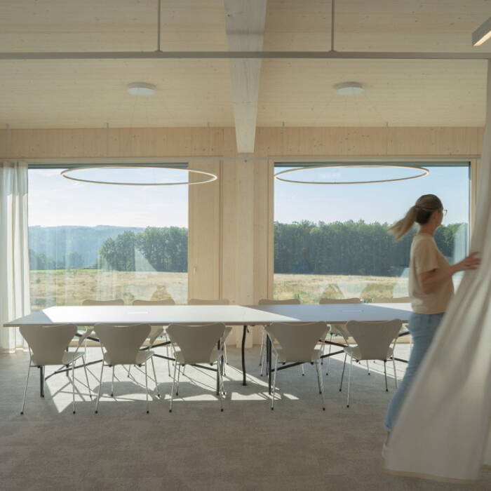 Der Einfluss der gesammelten Erfahrungen der verschiedenen Geschäftstätigkeiten des Gesamtunternehmens im Möbel- und Innenausbau, der Objekteinrichtung und als Generalunternehmer zeigt sich auch im durchdachten Gesamtkonzept des Neubaus, in dem mit- und vorgedacht wurde. Denn der freie Grundriss im Obergeschoss und die gleiche vorinstallierte Gebäudetechnik bilden auch hier den Grundstein einer Erweiterung der Bürofläche und die Tribüne im ersten Obergeschoss beispielsweise ist nicht nur Sitzgelegenheit, sondern zudem auch cleverer Stauraum. Innerhalb der offenen Architektur korrespondieren die linearen Leuchten der Serie Paladio von Sattler mit den runden Slim-Leuchten und sind prägende Elemente des Lichtkonzepts der beiden Gebäudeetagen. Speziell über den einzelnen Arbeitsplätzen überzeugen die Vorteile der Leuchten Paladio 35 Prism. So bewirkt der prismatische Reflektor der Leuchten ein blend- und spiegelfreies Licht auf der Arbeitsfläche und ermöglicht so ein ermüdungsfreies, angenehmes Arbeiten. Acht der schlanken Leuchten mit der Länge 3,37 Meter erstrecken sich über den Bürotischen. Weitere Paladios der Längen 1,41, 2,25 und 2,81 Meter finden ihren Platz in anderen Bereichen. Ihre schlichte Optik in gebürstetem und eloxierten Aluminium harmoniert perfekt mit den warmen Holzfarben des Interieurs und passen sich unaufdringlich in die Räume ein.