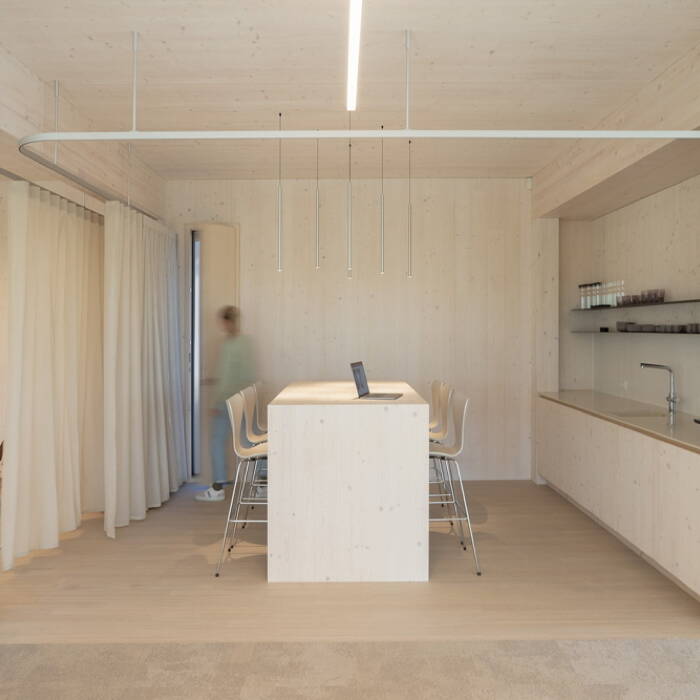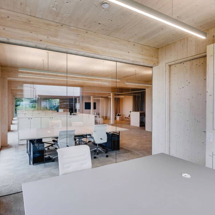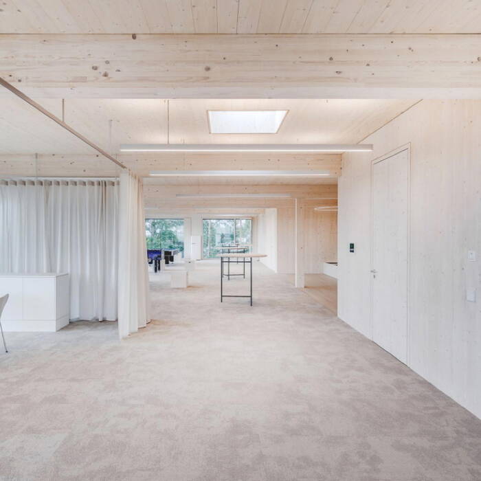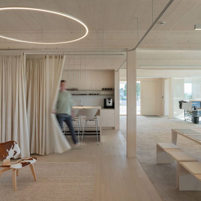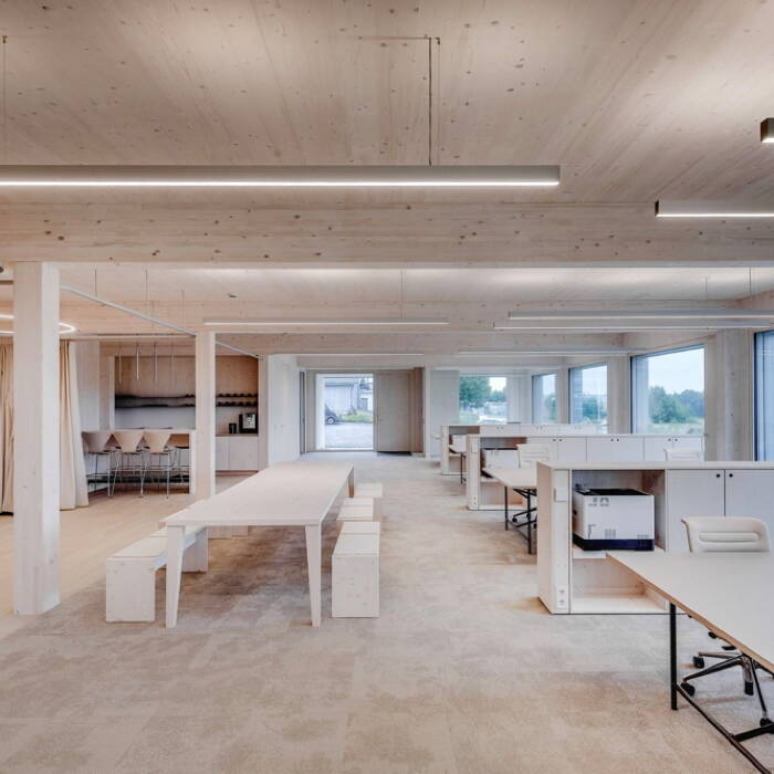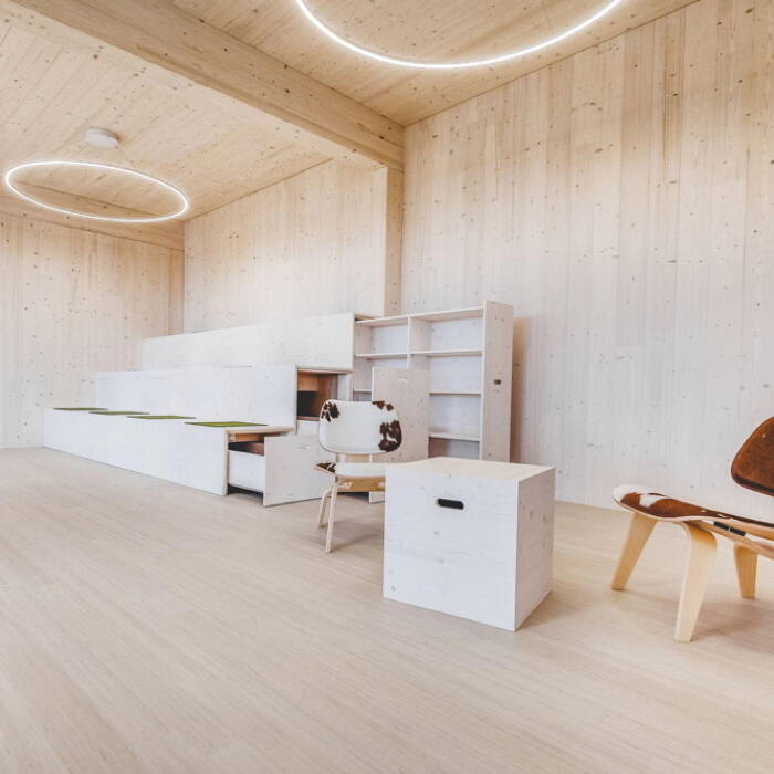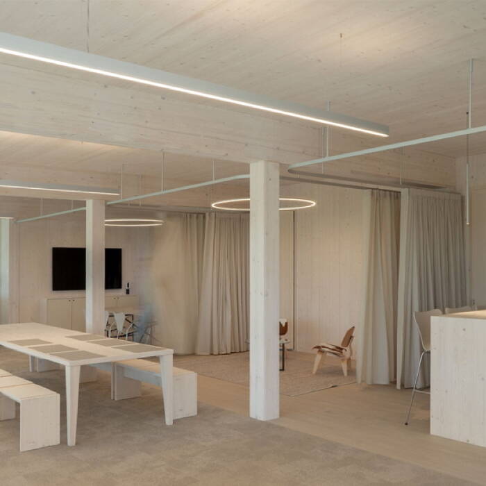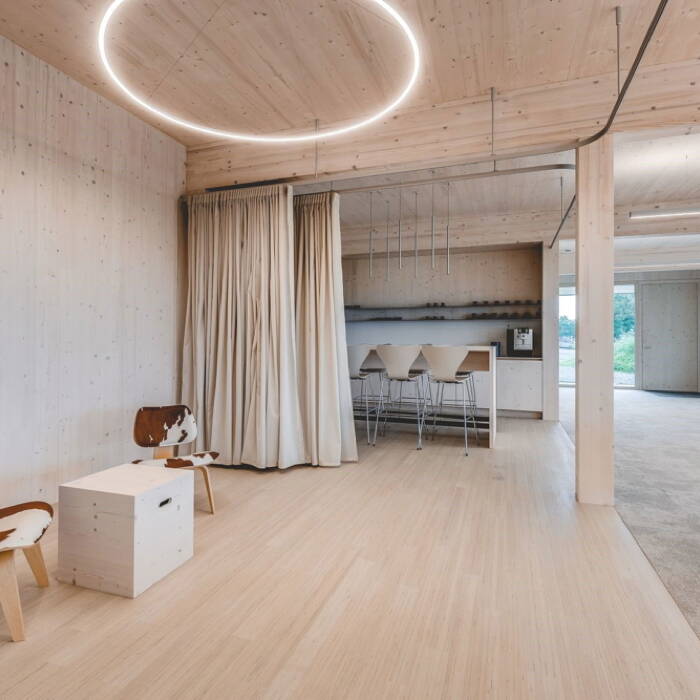 Ein neues Bürogebäude bietet der Schumann Gruppe ein innovatives und kreatives Zuhause. Auf zwei Geschossen mit insgesamt 600 Quadratmetern präsentieren sich neue, multifunktionale Arbeits- und Kreativflächen sowie ein perfekt integriertes Lichtkonzept. Der freie Grundriss und die großen Spannweiten der Holzbauweise schaffen ein lichtes und freundliches Großraumbüro, das sich durch leichte Vorhänge in getrennte Nutzungsbereiche zonieren lässt. So entstehen neben den gemeinschaftlichen Tischtafeln auch kreative Rückzugsorte sowie Besprechungsräume und eine Lounge mit Küche. Im Obergeschoss befindet sich eine großzügige Ausstellungs- und Eventfläche, die durch eine integrierte Tribüne aktiviert wird.
