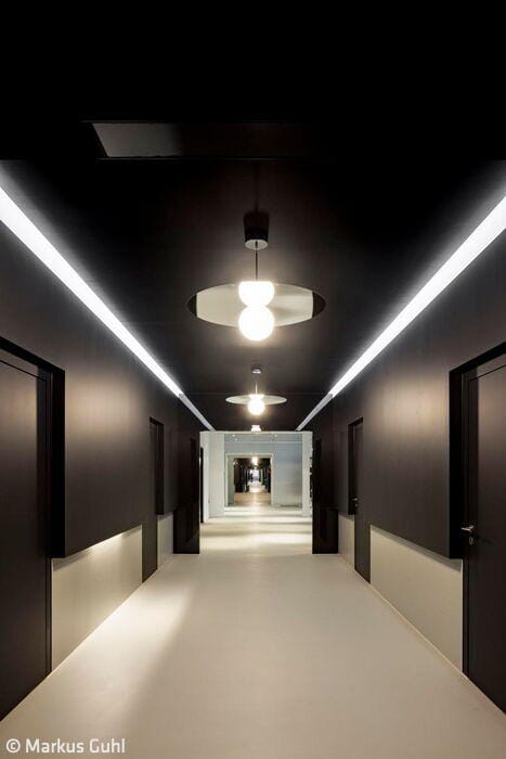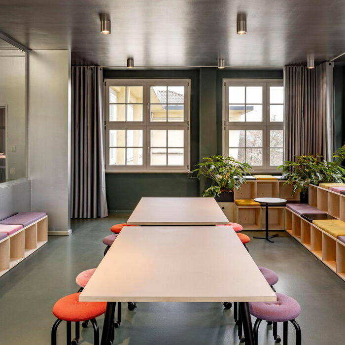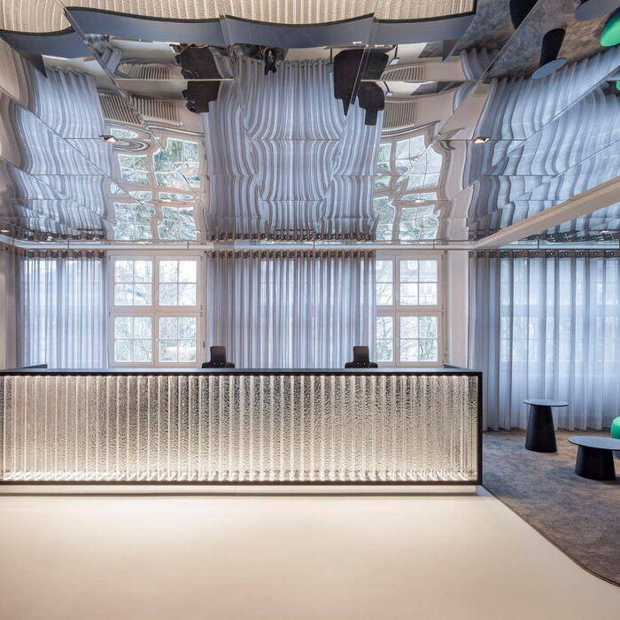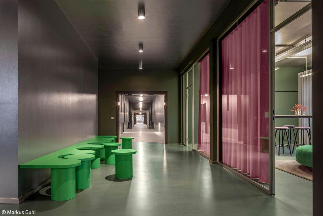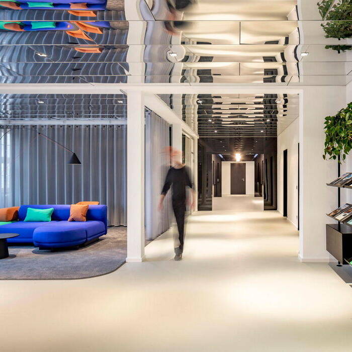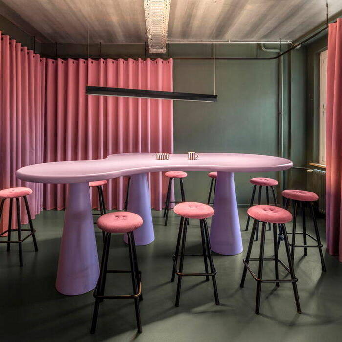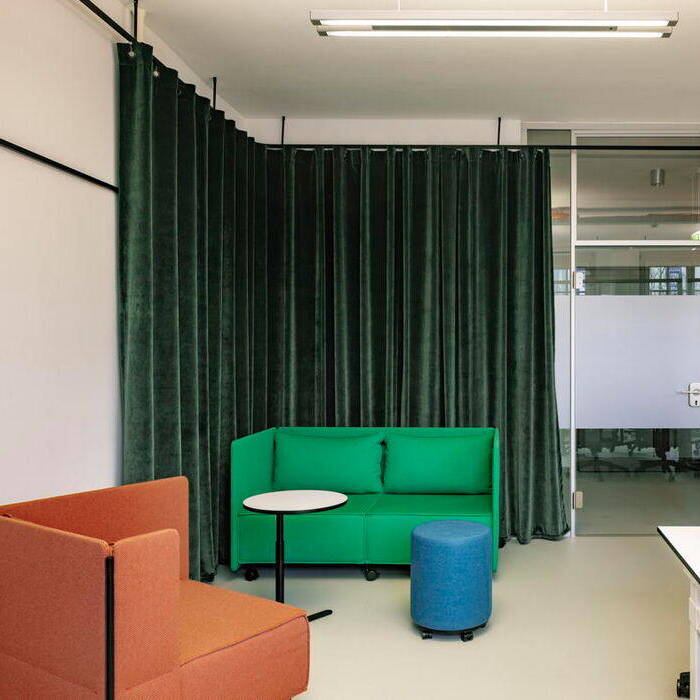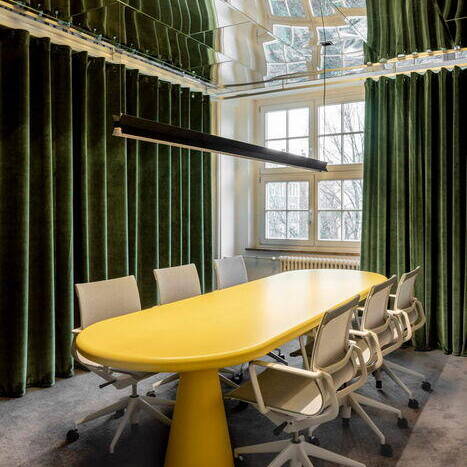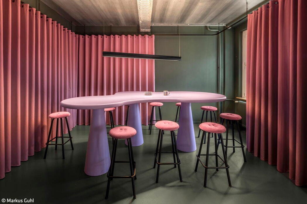Es ist auffallend farbenfroh in diesen neu gestalteten Räumen einer Stuttgarter Kreativagentur. Statt Schwarz und Weiß leuchten hier Gelb und Grün, Pink und Violett sowie Orange und Blau um die Wette. Auch die vielfältigen Formen, Materialien und Oberflächen des Mobiliars und Ausbaus springen direkt ins Auge. Vorhänge aus Samt, Filz oder halbtransparentem Voile schwingen zu spiegelnden Raumdecken und chromlackierten Wandflächen. Holz trifft auf Schlagmetall, Teppich auf PU-Lackboden. Organisch geformte Tische und Sitzelemente gesellen sich zu modularen Möbeln. Etliche davon sind mit Rollen ausgestattet, sodass sie sich je nach Bedarf an unterschiedliche Nutzungsszenarien anpassen lassen.