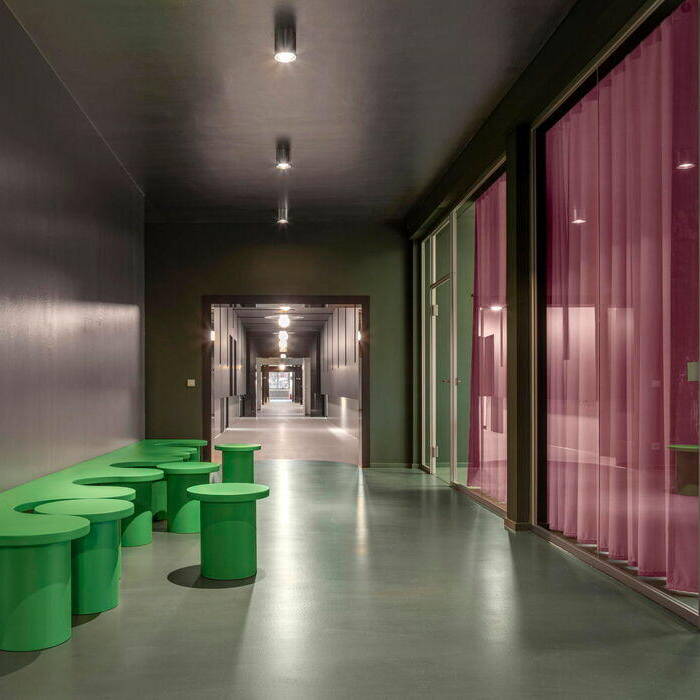 Die zahlreichen Grünpflanzen sind das I-Tüpfelchen des ungewöhnlichen Einrichtungskonzepts, das in seiner lebendigen Ausstrahlung alle Sinne ansprechen soll: „Sensorik und Haptik waren zentrale Themen bei der Neugestaltung“, erklärt Alexander Seifried, Gründer und Geschäftsführer von UnternehmenForm, der für die Ausführung des Projektes den Schreiner und Innenarchitekten Florian Siegel mit ins Boot holte. In der dritten Etage des ehemaligen Stuttgarter Arbeitsamtes vereint ein zentraler und ganze 110 Meter langer schwarzer Gang alle Kreativ-Disziplinen der auftraggebenden Agentur, die Filmproduktion, Kreativ- und Digital-Agentur sowie PR zu einem ganzheitlichem Kommunikationsangebot. Für die rund 90 Mitarbeitenden entwickelte UnternehmenForm eine inspirierende Arbeitsatmosphäre, die Emotionen wecken und nach Phasen im Homeoffice wieder Lust aufs Arbeiten im Büro machen soll. Neben klassischen Büroräumen entstanden unterschiedlich gestaltete „Marktplätze“, auf denen sich die Teams untereinander austauschen können. Während die eigentlichen Arbeitsplätze für fokussiertes Arbeiten eher funktional und reduziert gestaltet sind, wirken der Empfangsbereich und die verschiedenen Community Spaces – die für Meetings, Präsentationen, Workshops oder auch gemeinsame Mahlzeiten oder Feiern genutzt werden – wie farbenfrohe „Energiespritzen“. Neben Sonderanfertigungen beispielsweise für Tresen und Tische kamen für die Einrichtung zahlreiche Möbel der neuen, eigenen UF Kollektion zum Einsatz – etwa die Hocker Super Heavy, das modulare Polstermöbel AddPad oder die würfelförmigen Studio Boxen. So bildet das neue Interieur exemplarisch ab, welche Potenziale in der umfangreichen UF Kollektion stecken: „Diese sind nicht aus der Form heraus gedacht, sondern aus der Perspektive derer, die damit leben und arbeiten“, so Alexander Seifried.