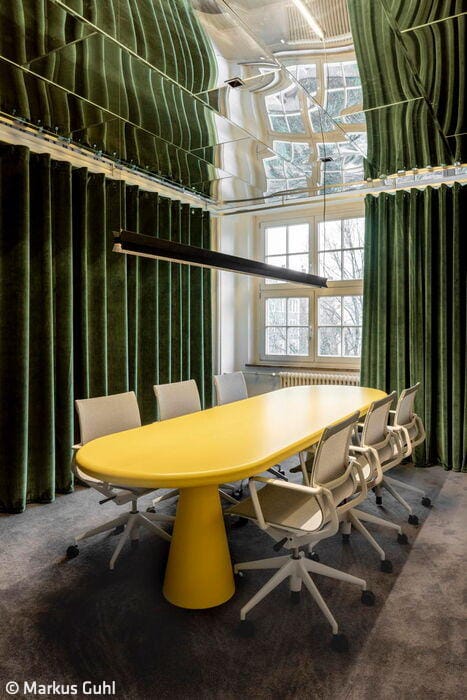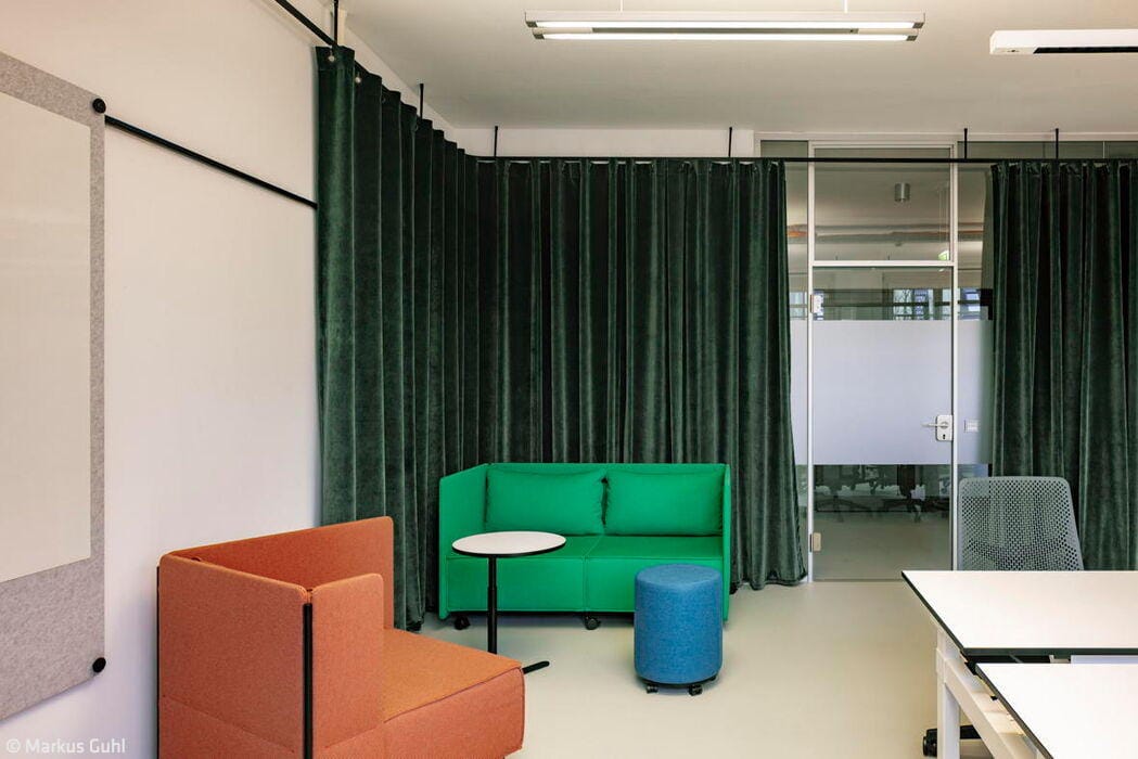 Es ist auffallend farbenfroh in diesen neu gestalteten Räumen einer Stuttgarter Kreativagentur. Statt Schwarz und Weiß leuchten hier Gelb und Grün, Pink und Violett sowie Orange und Blau um die Wette. Auch die vielfältigen Formen, Materialien und Oberflächen des Mobiliars und Ausbaus springen direkt ins Auge. Vorhänge aus Samt, Filz oder halbtransparentem Voile schwingen zu spiegelnden Raumdecken und chromlackierten Wandflächen. Holz trifft auf Schlagmetall, Teppich auf PU-Lackboden. Organisch geformte Tische und Sitzelemente gesellen sich zu modularen Möbeln. Etliche davon sind mit Rollen ausgestattet, sodass sie sich je nach Bedarf an unterschiedliche Nutzungsszenarien anpassen lassen.