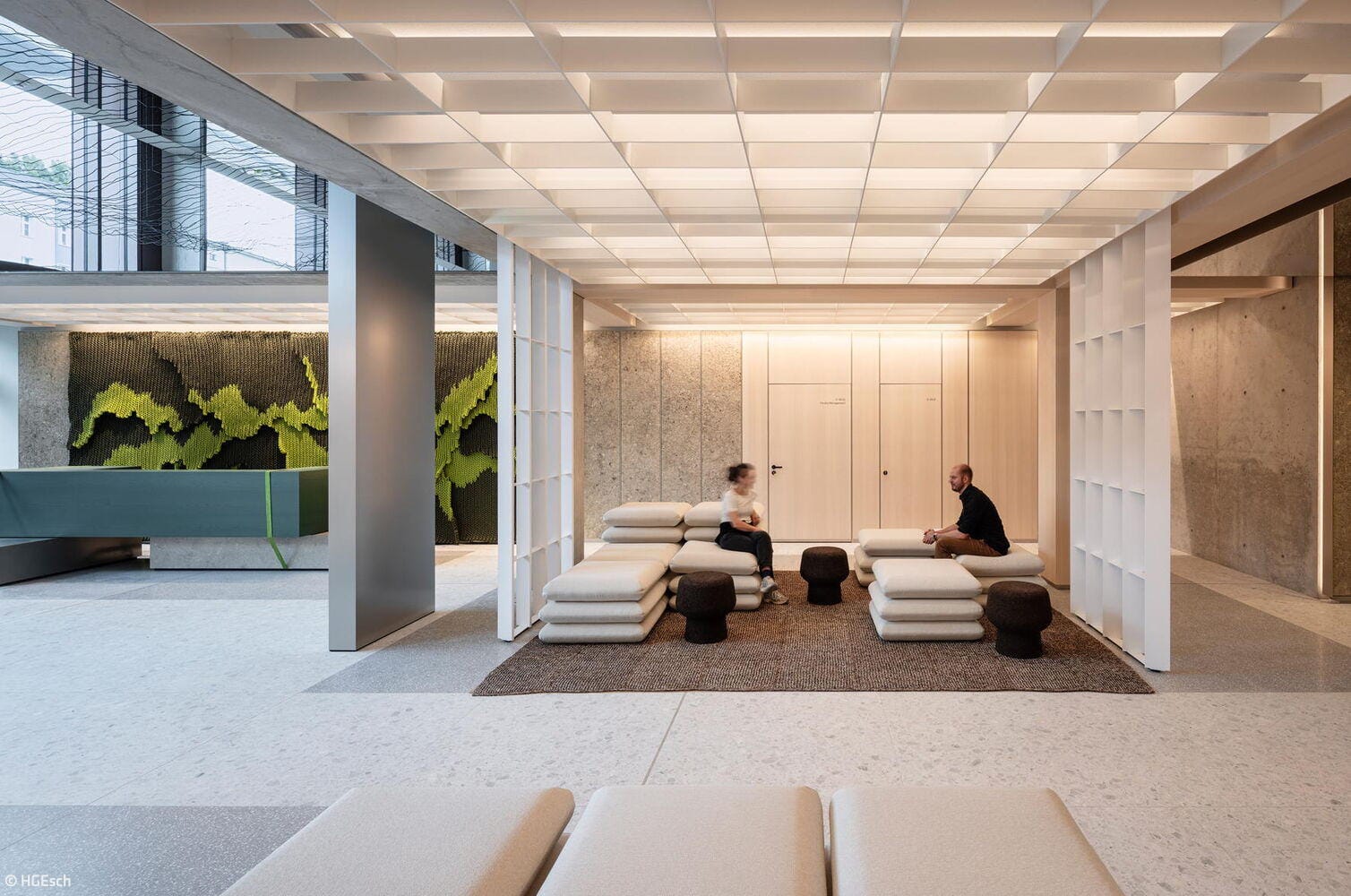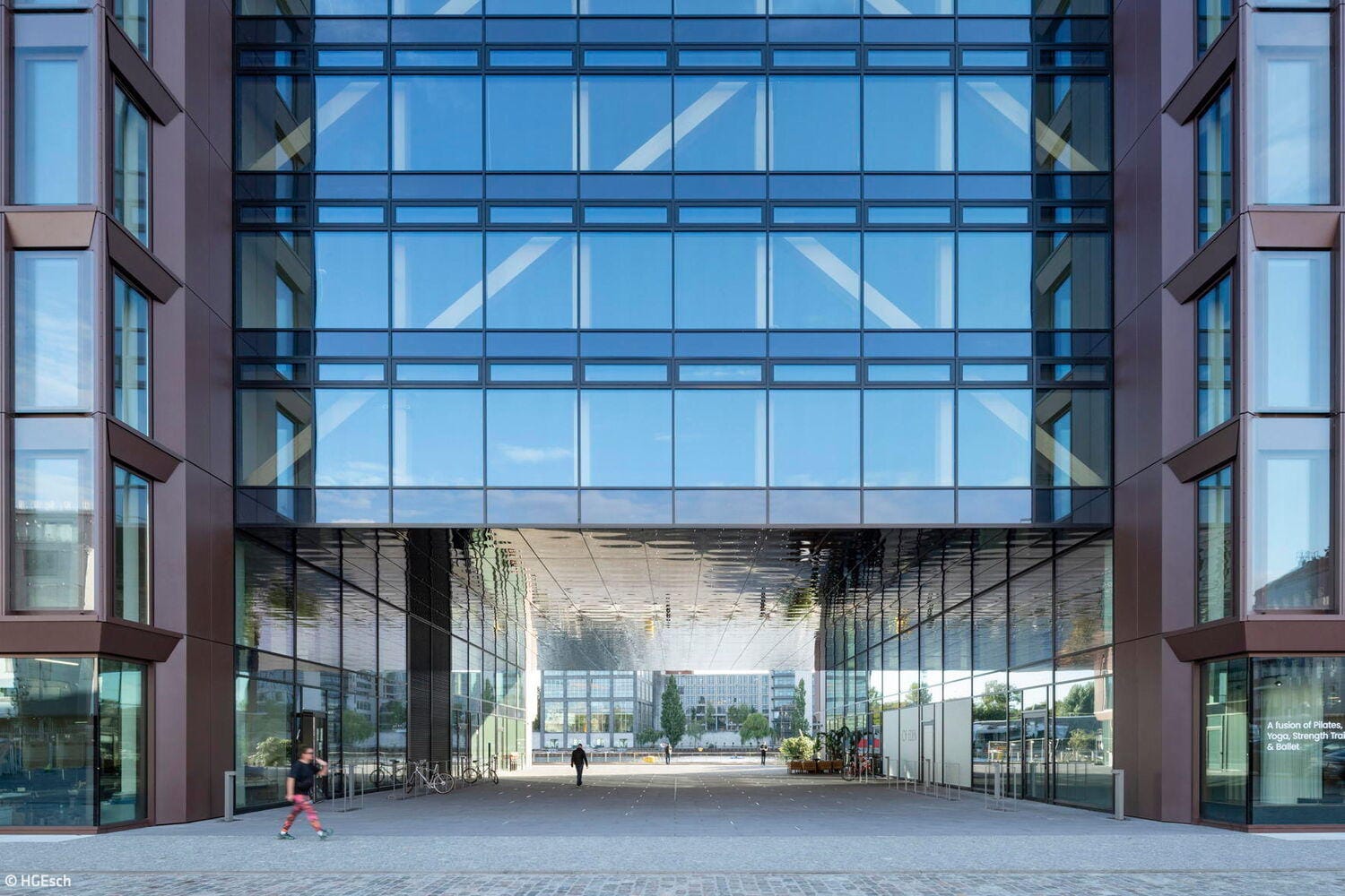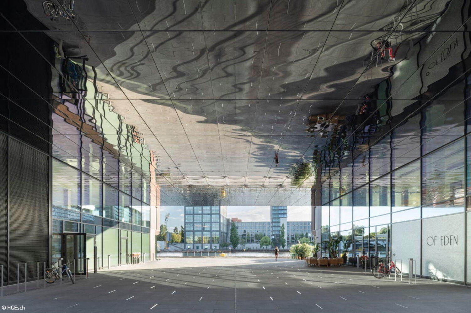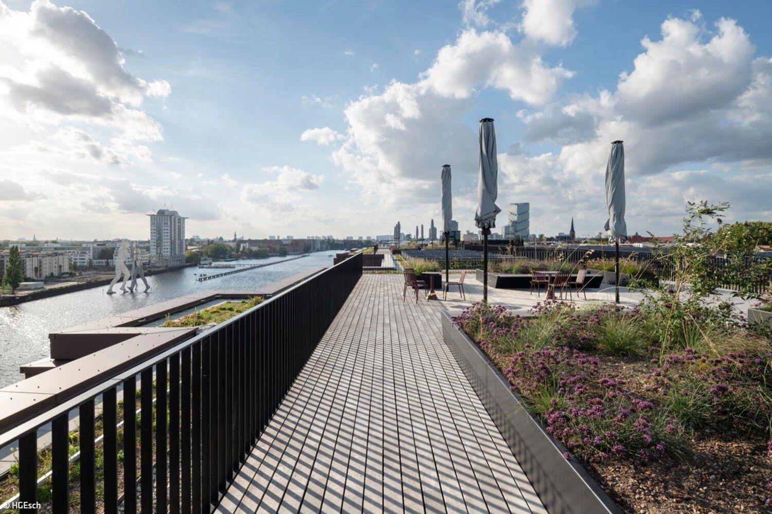 Der flüchtige optische Eindruck eines geschlossenen Riegels trügt: In Wirklichkeit handelt es sich um zwei Gebäude, um einen quadratischen und einen rechteckigen Baukörper – die Verbindung bildet ein Brückengebäude, das oben bündig abschließt, unten aber einen Durchgang freilässt. Die Decke des Durchgangs ist mit einem verspiegelten Edelstahlblech verkleidet, das das Wellenspiel der Spree aufgreift. Eine Tiefgarage mit Elektro-Ladestationen bietet Parkmöglichkeiten für die Belegschaft. In allen drei Gebäudeteilen ist das Verhältnis von Holz und Beton präzise ausgelotet. Ab dem 1. Obergeschoss wurden die Decken in HBV-Bauweise ausgeführt: Holz und Beton sind schubfest miteinander verbunden. Die Eigenschaften beider Materialien kommen zur Wirkung: Das Holz trägt die Zugkräfte, der Beton nimmt die Druckkräfte auf. Unter- und Erdgeschosse erhielten Betondecken. Jedes der beiden Hauptgebäude ist über einen eigenen Eingang erreichbar, der in einer großzügigen Lobby mit einer respektablen Höhe von knapp sieben Metern mündet. Von dort aus führen Treppen und Aufzüge in die oberen Stockwerke. Ein besonderes Highlight sind die extensiv begrünten Dächer und die Dachterrassen mit Sitzgelegenheiten, von denen aus sich die Spree und das gegenüberliegende Ufer überblicken lassen. Die Fassaden bestehen aus Glasfensterelementen, die bis zum sechsten Obergeschoss reichen und alle zwei Stockwerke durch Gesimse und Lisenen gegliedert werden. An der Südfassade zur Spree hin kommen als zusätzliche Elemente versetzte, vorspringende quadratische Erker mit Balkonen an der Oberseite hinzu. An den übrigen Gebäudeseiten hingegen lockern eingeschnittene, rückspringende Loggien die Fassaden auf. Sechs von sieben Stockwerken sind für Büronutzung konzipiert. Offene Grundrisse ermöglichen den Mietern, die Flächen so zu zonieren, wie es ihren Bedürfnissen entspricht. Die Erdgeschosse sind zum Teil für kommerzielle Nutzung, wie Läden oder Gastronomie, vorgesehen. Gestalterisch wurden alle Möglichkeiten ausgeschöpft: Die Gestaltung der Außenanlagen übernahmen Topotek 1 Landschaftsarchitekten. Kunst am Bau ist im Außenbereich, in den Lobbys und auf den einzelnen Stockwerken integriert. Bei der Planung des Projekts standen Nachhaltigkeit und Zukunftsfähigkeit von Anfang an im Mittelpunkt: So reduziert die Holz-Hybridkonstruktion den Energiebedarf bereits signifikant, aber auch die Energieversorgung für Heizung und Strom ist von vornherein auf Zero-Emission ausgelegt und ausschließlich emissionsfreie Energielieferanten kommen zum Einsatz – Sonnenenergie, Geothermie und Umgebungsluft. Zusätzlich verfügt das Objekt über einen Eisspeicher. Im Winter bedient sich dieser der Energie, die während des Gefrierprozesses freigesetzt wird. Im Sommer dient er als Zwischenspeicher für überschüssige Wärme. Die Kombination dieser Systeme ermöglicht einen nahezu CO₂-freien Gebäudebetrieb.