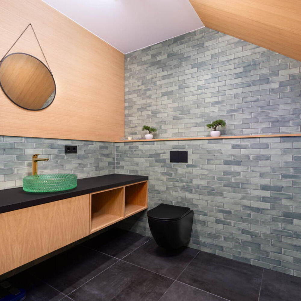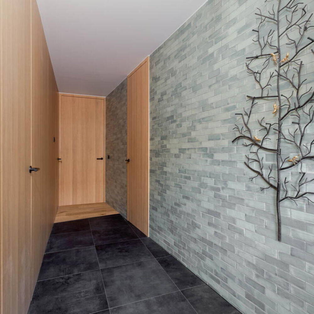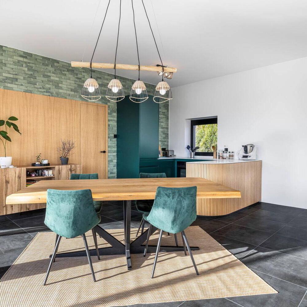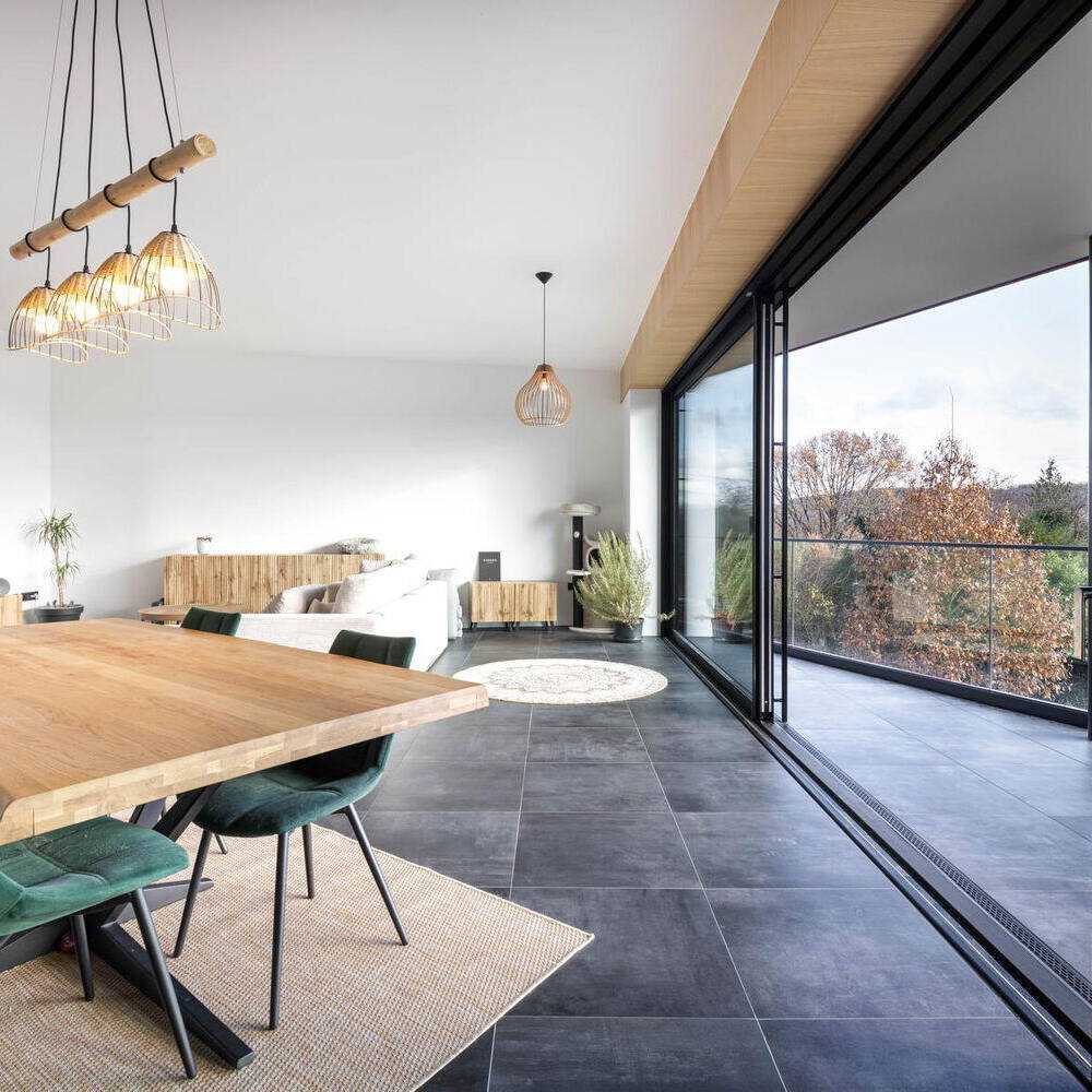 Das Haus besticht durch seinen ungewöhnlichen Grundriss, der sich nicht nur an funktionalen Anforderungen orientiert, sondern stark auf die Umgebung reagiert: Eine großzügige Terrasse beispielsweise ermöglicht einen uneingeschränkten Blick ins Grüne. Das Innere des Hauses setzt die Gestaltungsidee konsequent fort. Die große Fensterfront zur Terrasse verstärkt den fließenden Übergang zwischen Wohnraum und Natur. Materialien wie Eiche bei den Verkleidungen und und grün changierende Fliesen spiegeln die umgebende Landschaft wider und schaffen eine natürliche Verbindung zwischen innen und außen.