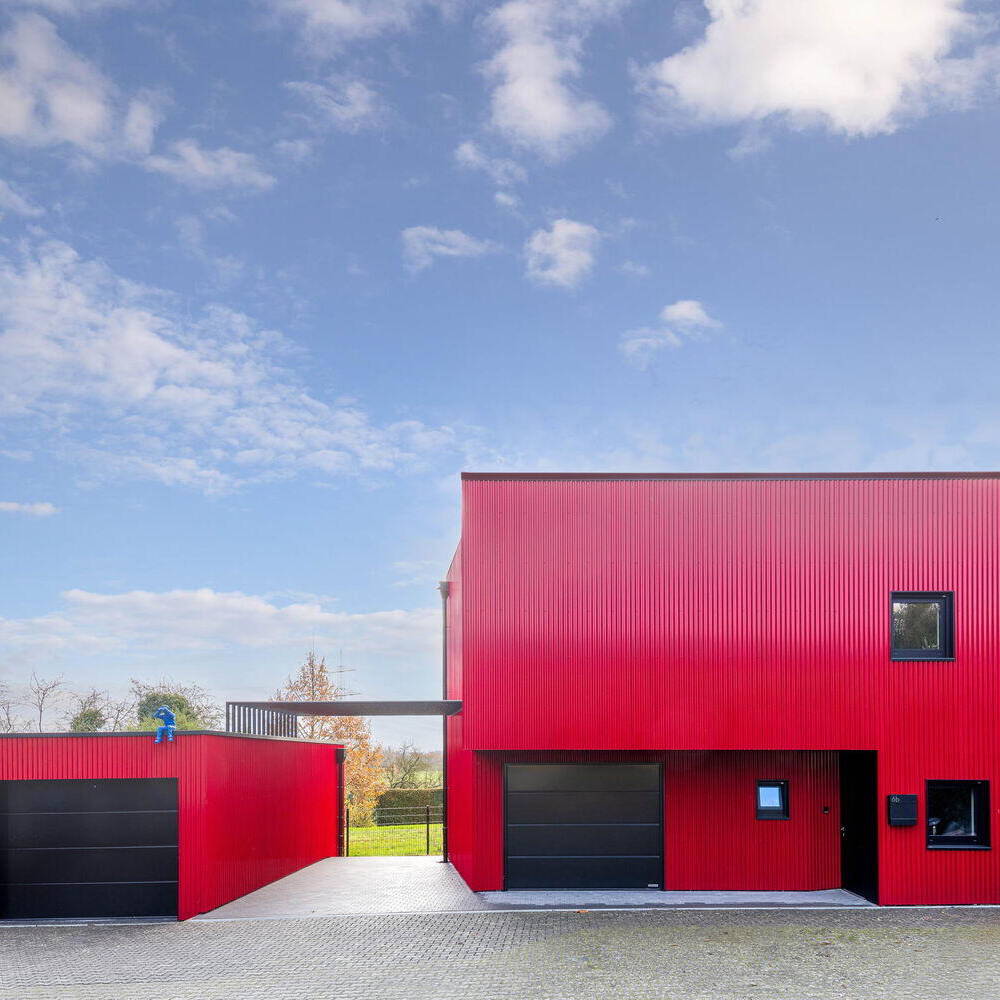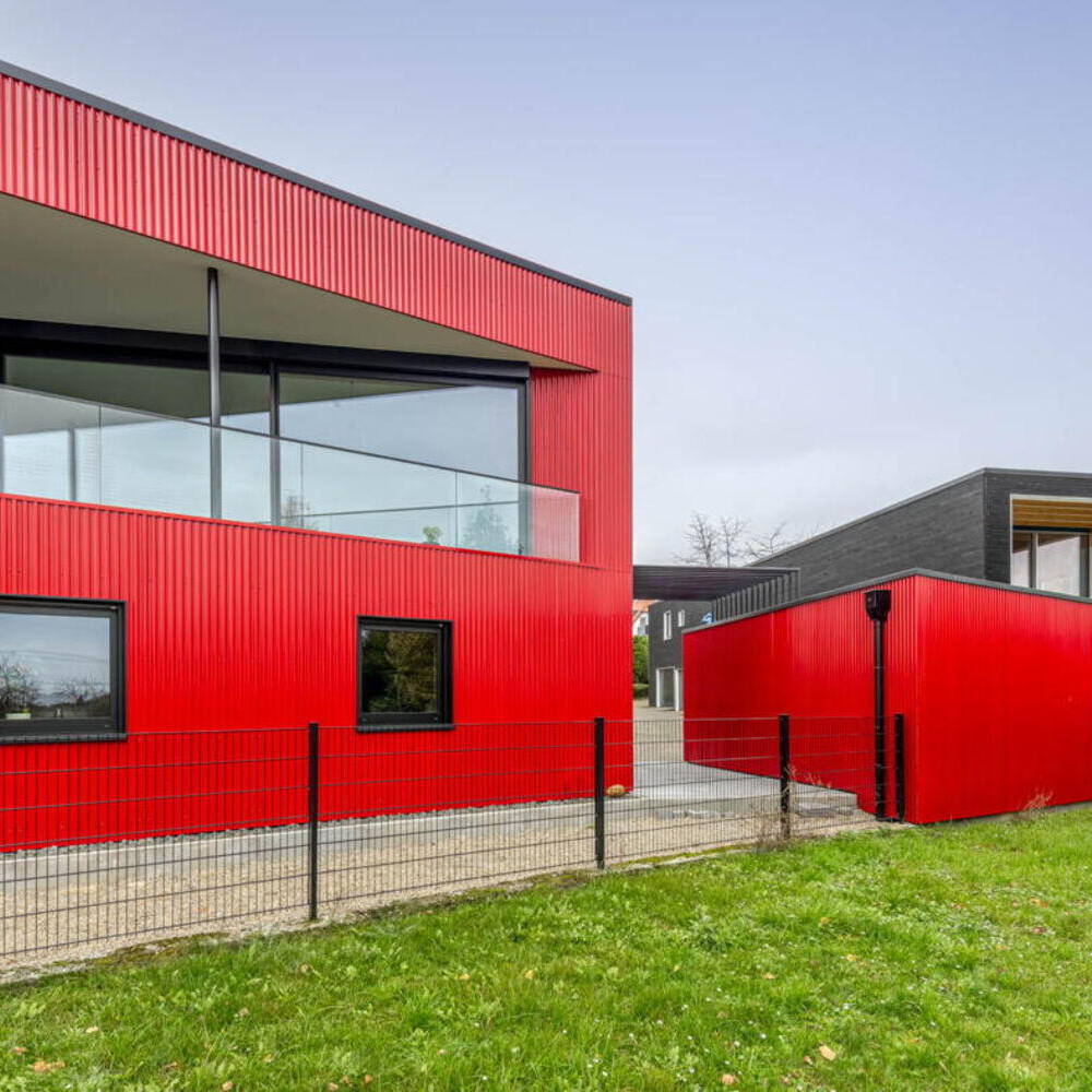 Der Architekt und Bauherr in Personalunion nutzte die Chance, mit diesem Projekt einen bewussten Kontrapunkt zur gängigen Bauträgerarchitektur zu setzen. Möglich wurde die Grundstücksteilung und Erschließung nur durch das freundschaftliche Verhältnis des Architekten zum Grundstücksbesitzer, der sich vorstellen konnte, einen Teil seines Grundstückes abzugeben, und den Architekten, der die entsprechenden Vorstellungen zur Durchführung entwickeln und bei den Ämtern durchsetzen konnte. Die Fassade aus rotem Wellblech ist ungewöhnlich für ein Wohnhaus, doch genau darin liegt ihr Reiz. Die Entscheidung fiel bewusst auf dieses Material, um eine vorgehängte Fassade zu realisieren, die in Kombination mit Porotonsteinen keine zusätzliche Wärmedämmung benötigt und dennoch den Standards eines Niedrigenergiehauses entspricht. Das Ergebnis ist eine optisch markante, langlebige und wartungsarme Hülle. Eine Besonderheit des Entwurfs ist die freistehende Garage, die durch schwarze Rohre mit dem Haupthaus verbunden ist. Diese architektonische Geste verleiht dem Ensemble eine formale Geschlossenheit und schafft eine visuelle Brücke zwischen den beiden Bauten. Die Farbkombination von Rot und Schwarz ist natürlich kein Zufall: Sie zieht sich konsequent durch die Entwurfsphilosophie des Architekten und verweist auf Vorbilder aus der modernen Architekturgeschichte. Und, so der Architekt: „Die Kombination aus Rot und Schwarz liegt mir bei fast allen meinen Gebäuden sehr am Herzen.“