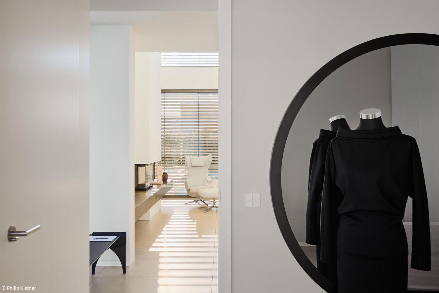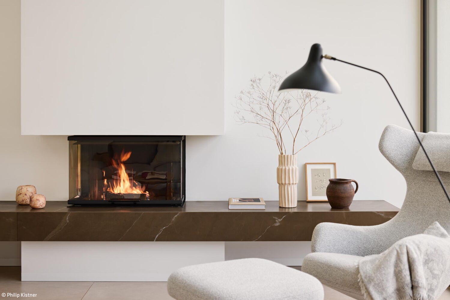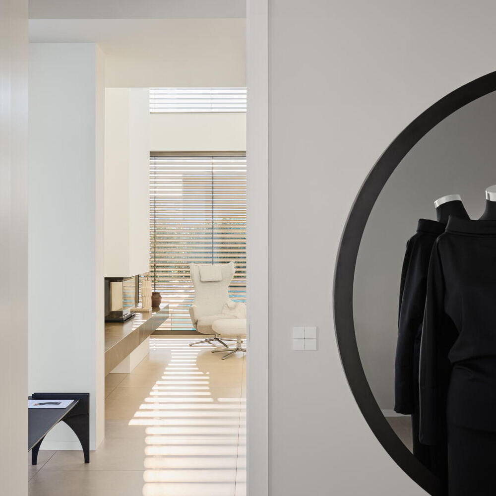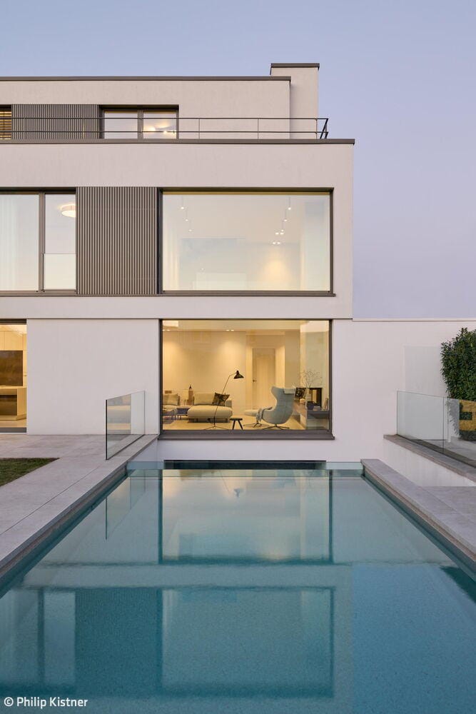 Die Familie mit zwei Kindern und einem Hund hatte sich ein offenes, vom Tageslicht durchflutetes, kommunikatives Haus gewünscht – freistehend und doch mit ausreichend Privatsphäre. Gerade letzteres wurde zu einer Herausforderung für die Planung: Um die Einsichten von der Straße zu begrenzen, mussten die gezielt geöffneten Fassadenbereiche mit ebenso bewusst geschlossenen Zonen kombiniert werden. Das Volumen des Gebäudes ist dabei als freistehender Kubus ausgebildet, der über zwei voneinander abgesetzte Vollgeschosse und ein zurückspringendes Staffelgeschoss geführt und mit Bändern aus pulverlackierten Aluminiumlamellen strukturiert wird. Der zum Garten auf der ganzen Breite geöffnete Baukörper und die Dachterrasse mit umlaufender, filigraner Reling auf dem obersten Geschoss wecken dabei bewusst Assoziationen zu Le Corbusiers Villa Savoye. Aber auch im Inneren ist dem Einfluss dieser Ikone der modernen Villenarchitektur nachzuspüren: Um die an zentraler Stelle angeordnete Treppe gruppieren sich die verschiedenen Zonen in einem offenen, lichtdurchfluteten Grundriss. Das kreiert viele Blickbeziehungen und kommunikative Bereiche – besonders über dem gartenseitig orientierten Wohnbereich, der mit einem Luftraum und einer Galerie in das Obergeschoss führt. Durch die großzügigen, über zwei Etagen geführten Glasfronten ergeben sich dabei nicht nur wunderbare Ausblicke auf den Lichthof mit dem Infinity Pool. Das üppig einströmende Tageslicht sorgt auch für dynamisch wechselnde Lichtreflexionen über die gesamte Gebäudetiefe vom Wohnbereich bis ins Entrée. Die Innenräume nehmen sich in ihrer Gestaltung dagegen bewusst zurück: Wie die Fassade prägen auch das Interior nur wenige Grautöne und Greige-Akzente. Der architekturinteressierten Bauherrschaft war es dabei wichtig, dass das Gebäude als „ehrlicher“ Monolith wirkt – entsprechend wurde statt eines konventionellen WDVS-Systems eine massive Lochziegel-Bauweise ohne weitere vorgesetzte Dämmung gewählt. Bedingt durch die großen Auskragungen und offenen Räume mussten gleichzeitig eine Reihe von Stahlbetonstützen in die Wände integriert werden. Auch ein anderes selbstverständliches Detail hat den Architekten viele Überlegungen abverlangt: Der über zwei Etagen geführte Kamin wurde platzsparend in die Außenmauer integriert. Zugleich musste der Schacht auch statisch abgehangen werden, um am Ende die gewünschte filigrane, dreiseitig geöffnete Brennkammer zu erhalten.