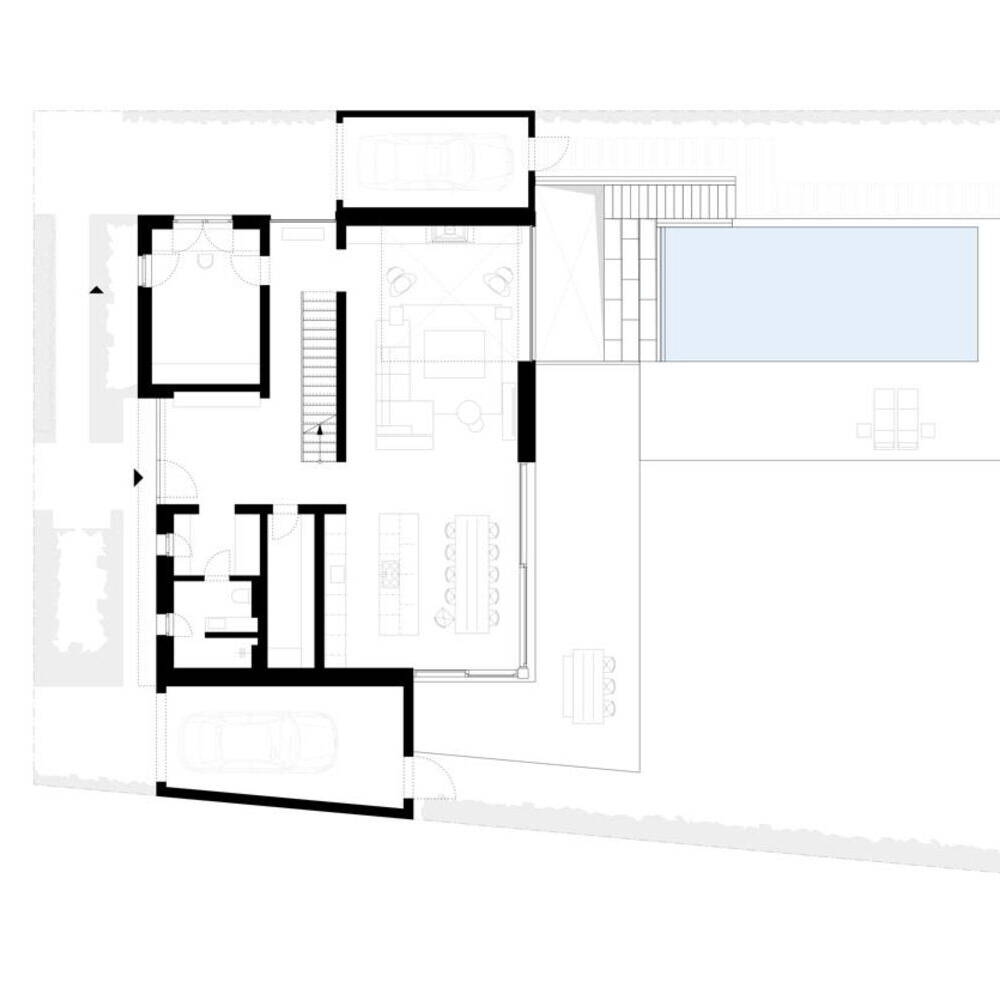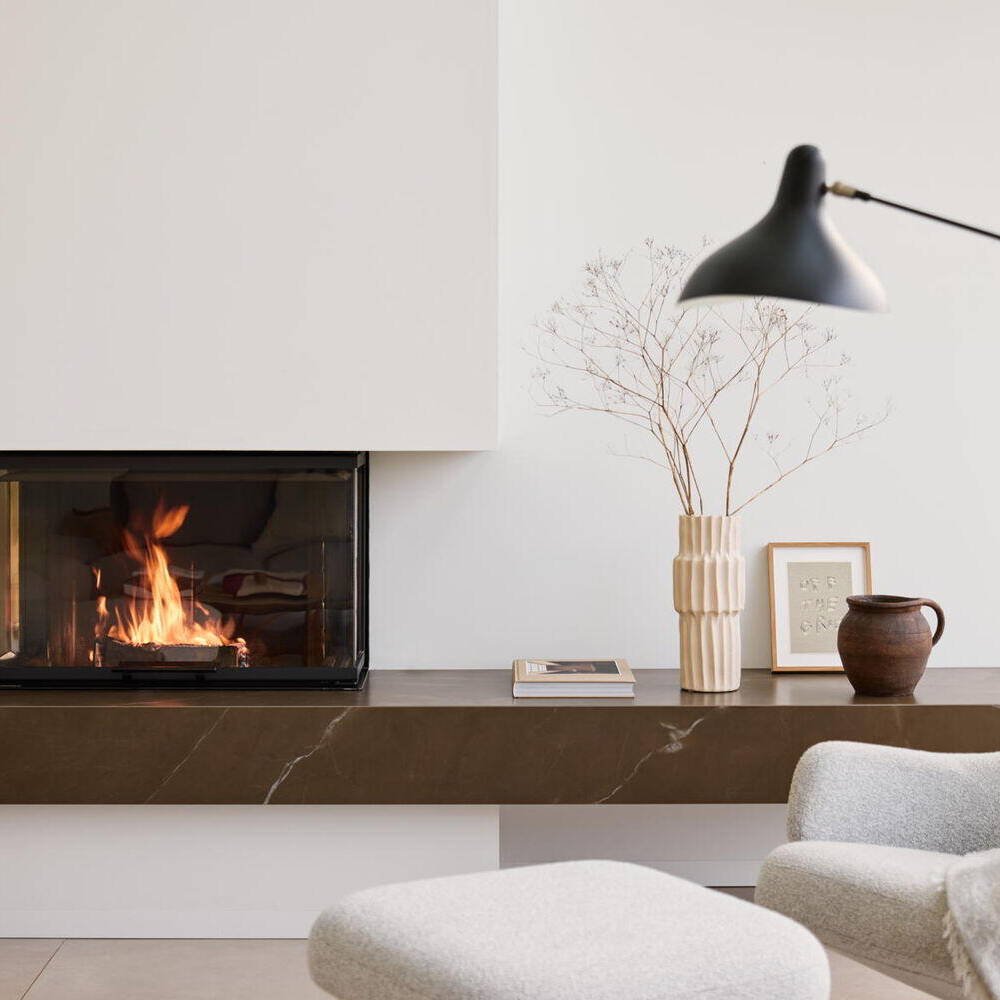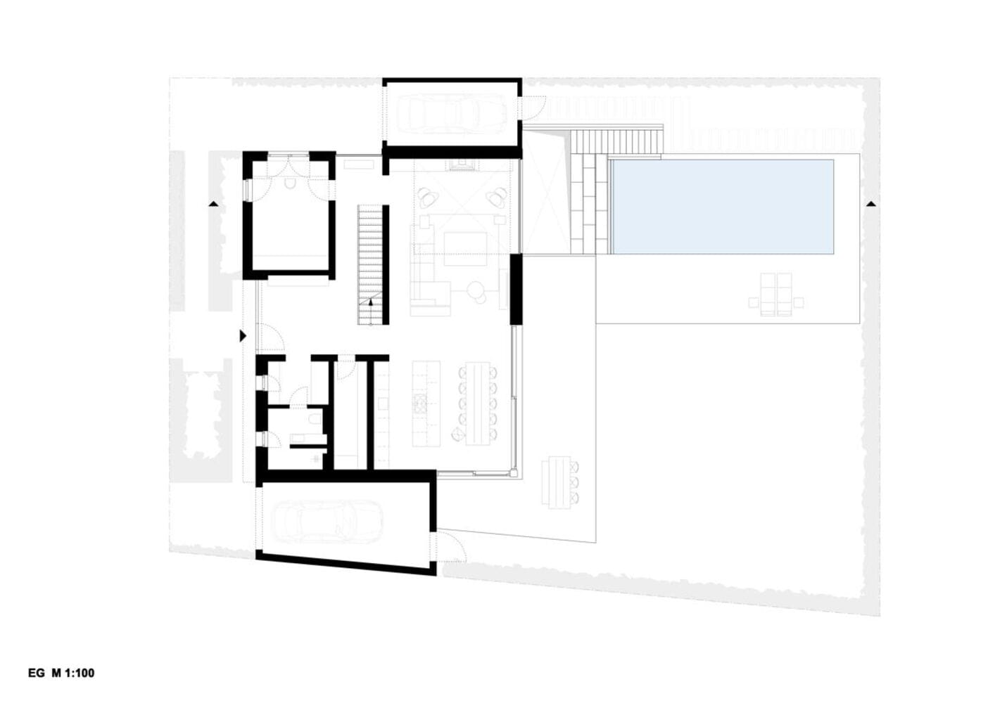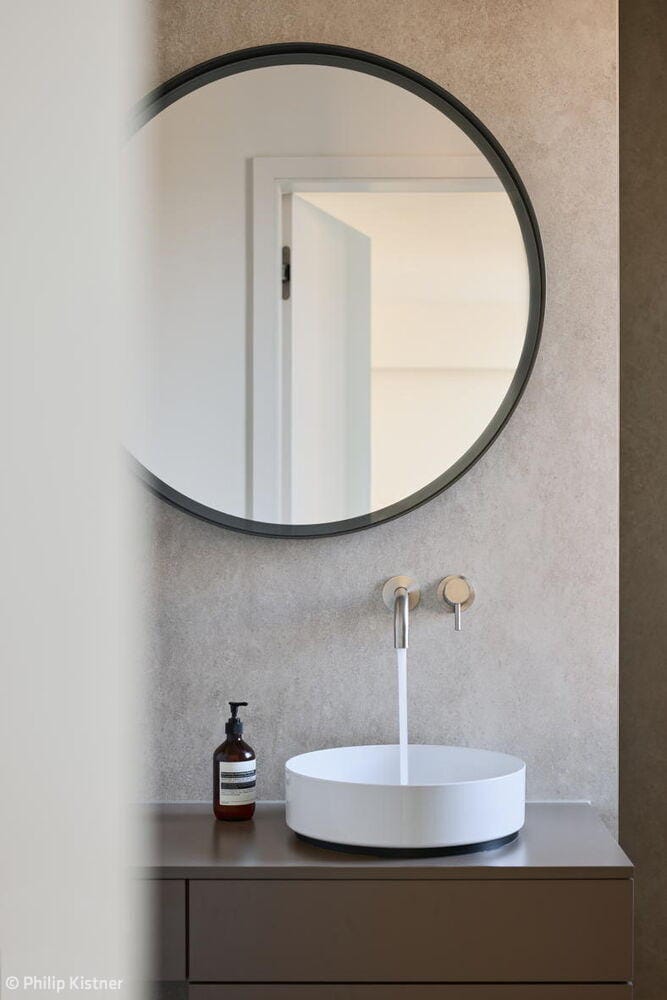 Die Familie mit zwei Kindern und einem Hund hatte sich ein offenes, vom Tageslicht durchflutetes, kommunikatives Haus gewünscht – freistehend und doch mit ausreichend Privatsphäre. Gerade letzteres wurde zu einer Herausforderung für die Planung: Um die Einsichten von der Straße zu begrenzen, mussten die gezielt geöffneten Fassadenbereiche mit ebenso bewusst geschlossenen Zonen kombiniert werden. Das Volumen des Gebäudes ist dabei als freistehender Kubus ausgebildet, der über zwei voneinander abgesetzte Vollgeschosse und ein zurückspringendes Staffelgeschoss geführt und mit Bändern aus pulverlackierten Aluminiumlamellen strukturiert wird. Der zum Garten auf der ganzen Breite geöffnete Baukörper und die Dachterrasse mit umlaufender, filigraner Reling auf dem obersten Geschoss wecken dabei bewusst Assoziationen zu Le Corbusiers Villa Savoye. Aber auch im Inneren ist dem Einfluss dieser Ikone der modernen Villenarchitektur nachzuspüren: Um die an zentraler Stelle angeordnete Treppe gruppieren sich die verschiedenen Zonen in einem offenen, lichtdurchfluteten Grundriss. Das kreiert viele Blickbeziehungen und kommunikative Bereiche – besonders über dem gartenseitig orientierten Wohnbereich, der mit einem Luftraum und einer Galerie in das Obergeschoss führt. Durch die großzügigen, über zwei Etagen geführten Glasfronten ergeben sich dabei nicht nur wunderbare Ausblicke auf den Lichthof mit dem Infinity Pool. Das üppig einströmende Tageslicht sorgt auch für dynamisch wechselnde Lichtreflexionen über die gesamte Gebäudetiefe vom Wohnbereich bis ins Entrée. Die Innenräume nehmen sich in ihrer Gestaltung dagegen bewusst zurück: Wie die Fassade prägen auch das Interior nur wenige Grautöne und Greige-Akzente. Der architekturinteressierten Bauherrschaft war es dabei wichtig, dass das Gebäude als „ehrlicher“ Monolith wirkt – entsprechend wurde statt eines konventionellen WDVS-Systems eine massive Lochziegel-Bauweise ohne weitere vorgesetzte Dämmung gewählt. Bedingt durch die großen Auskragungen und offenen Räume mussten gleichzeitig eine Reihe von Stahlbetonstützen in die Wände integriert werden. Auch ein anderes selbstverständliches Detail hat den Architekten viele Überlegungen abverlangt: Der über zwei Etagen geführte Kamin wurde platzsparend in die Außenmauer integriert. Zugleich musste der Schacht auch statisch abgehangen werden, um am Ende die gewünschte filigrane, dreiseitig geöffnete Brennkammer zu erhalten.