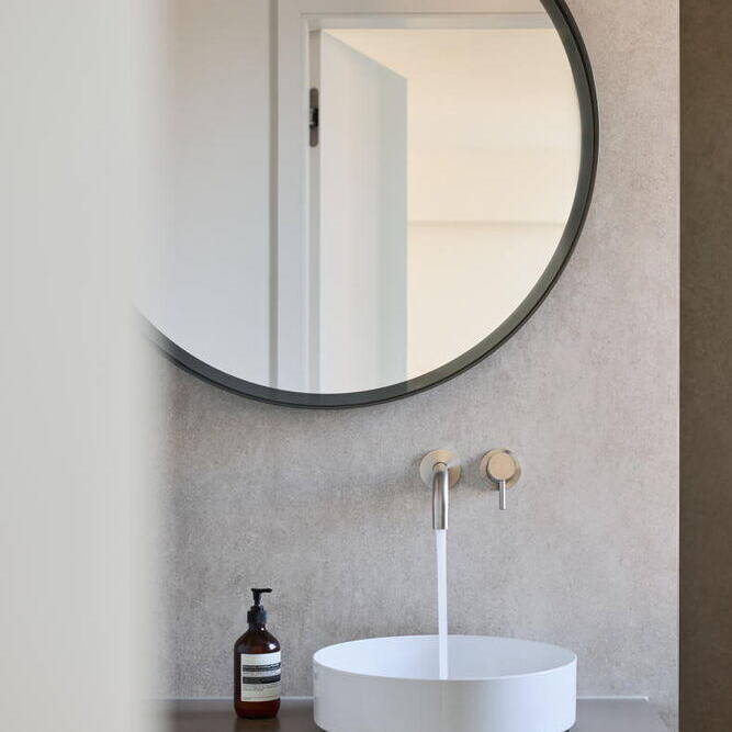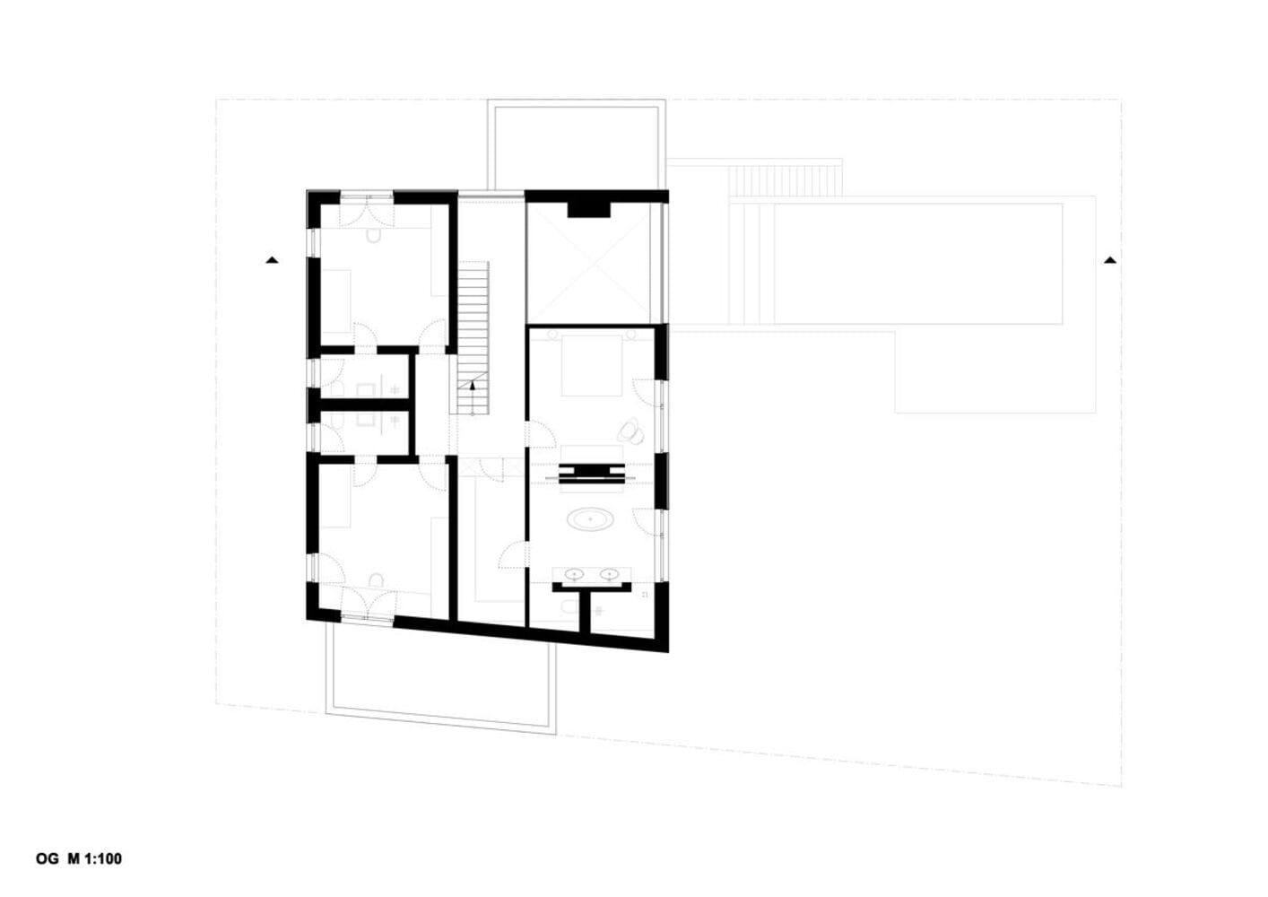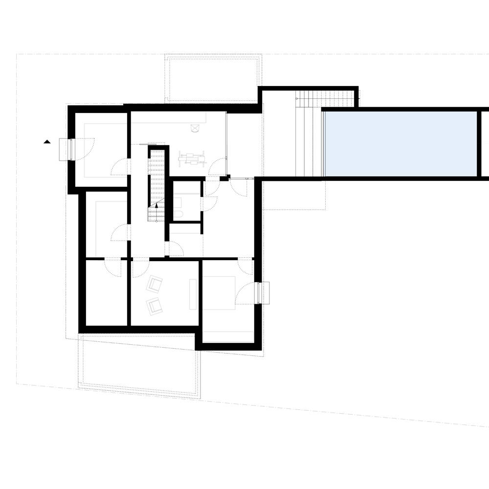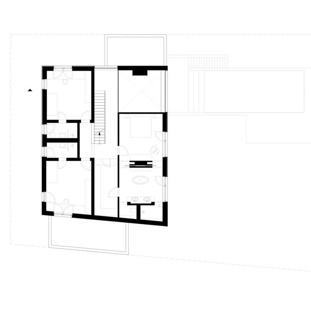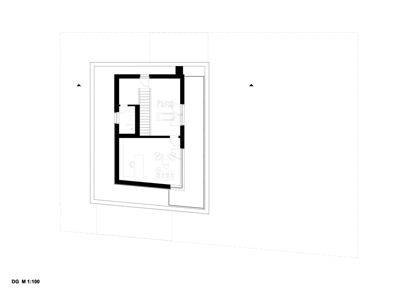 Die Familie mit zwei Kindern und einem Hund hatte sich ein offenes, vom Tageslicht durchflutetes, kommunikatives Haus gewünscht – freistehend und doch mit ausreichend Privatsphäre. Gerade letzteres wurde zu einer Herausforderung für die Planung: Um die Einsichten von der Straße zu begrenzen, mussten die gezielt geöffneten Fassadenbereiche mit ebenso bewusst geschlossenen Zonen kombiniert werden. Das Volumen des Gebäudes ist dabei als freistehender Kubus ausgebildet, der über zwei voneinander abgesetzte Vollgeschosse und ein zurückspringendes Staffelgeschoss geführt und mit Bändern aus pulverlackierten Aluminiumlamellen strukturiert wird. Der zum Garten auf der ganzen Breite geöffnete Baukörper und die Dachterrasse mit umlaufender, filigraner Reling auf dem obersten Geschoss wecken dabei bewusst Assoziationen zu Le Corbusiers Villa Savoye. Aber auch im Inneren ist dem Einfluss dieser Ikone der modernen Villenarchitektur nachzuspüren: Um die an zentraler Stelle angeordnete Treppe gruppieren sich die verschiedenen Zonen in einem offenen, lichtdurchfluteten Grundriss. Das kreiert viele Blickbeziehungen und kommunikative Bereiche – besonders über dem gartenseitig orientierten Wohnbereich, der mit einem Luftraum und einer Galerie in das Obergeschoss führt. Durch die großzügigen, über zwei Etagen geführten Glasfronten ergeben sich dabei nicht nur wunderbare Ausblicke auf den Lichthof mit dem Infinity Pool. Das üppig einströmende Tageslicht sorgt auch für dynamisch wechselnde Lichtreflexionen über die gesamte Gebäudetiefe vom Wohnbereich bis ins Entrée. Die Innenräume nehmen sich in ihrer Gestaltung dagegen bewusst zurück: Wie die Fassade prägen auch das Interior nur wenige Grautöne und Greige-Akzente. Der architekturinteressierten Bauherrschaft war es dabei wichtig, dass das Gebäude als „ehrlicher“ Monolith wirkt – entsprechend wurde statt eines konventionellen WDVS-Systems eine massive Lochziegel-Bauweise ohne weitere vorgesetzte Dämmung gewählt. Bedingt durch die großen Auskragungen und offenen Räume mussten gleichzeitig eine Reihe von Stahlbetonstützen in die Wände integriert werden. Auch ein anderes selbstverständliches Detail hat den Architekten viele Überlegungen abverlangt: Der über zwei Etagen geführte Kamin wurde platzsparend in die Außenmauer integriert. Zugleich musste der Schacht auch statisch abgehangen werden, um am Ende die gewünschte filigrane, dreiseitig geöffnete Brennkammer zu erhalten.