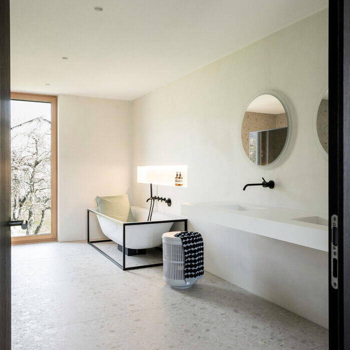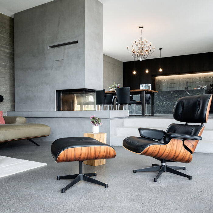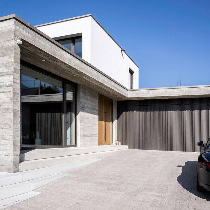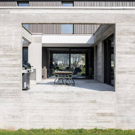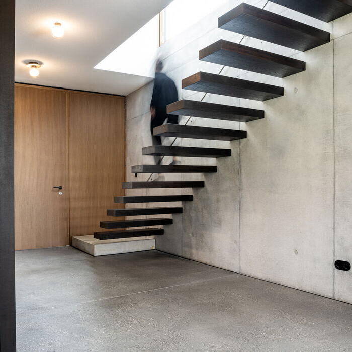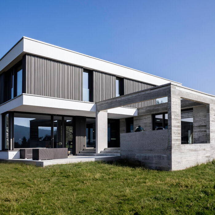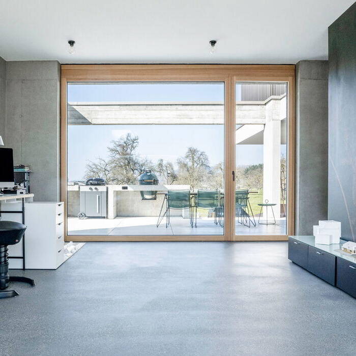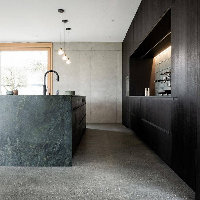 Ein Betonelement rahmt den Eingangsbereich mit Außentreppen und bindet die Garage mit ein. Der offene Grundriss mit hellen, ineinander übergehenden Räumen auf rund 253 m² bezieht die Topografie spürbar mit ein. Analog zur Lounge-Terrasse liegt das Wohnzimmer mit einer Raumhöhe von rund 3,30 Meter tiefer und gibt über bodentiefe Holz-Aluminium-Fenster den Blick ins Grüne frei. Die Wände aus strukturiertem Sichtbeton mit sägerauer Schalung bilden einen interessanten Kontrast. Die höher gelegene Terrasse rahmt ein Betonbügel, der den Essbereich ins überdachte Freie erweitert. Wie ein Kubus stehen Diele und Küche als Einbaumöbel aus sägerauer, geräucherter Eiche im Raum. Sie nehmen den Treppenabgang ins Untergeschoss und die hinter der Küchenzeile liegende zweite Küche mit Durchgang in die Garage auf. Das Herzstück des Hauses ist definitiv die Küche mit ihrer prägnanten Vertäfelung aus Granit in Panonia Grün. Die eingespannten Treppenstufen verbinden nicht nur das Erd- mit dem Obergeschoss in räumlicher Hinsicht – über das Material, aus dem auch die Küchenmöbel, die raumhohen Türen und die Holzdielen im Obergeschoss hergestellt sind, entsteht auch eine optische Verbindung. Zwischen Wohn- und Essbereich sorgt ein Kaminofen für eine belebende Atmosphäre. Dieser findet in der betonierten Außengrillküche sein Pendant. Der separat zugängliche Arbeitsbereich der Architektin ist im eingeschossigen Gebäudeteil untergebracht. Im 90 Grad-Winkel zum Wohnhaus gestellt, dient er gleichzeitig als Sichtschutz für den privaten Außenbereich. Die Gestaltung der Fassade mit Putz, mittelgrauem Sichtbeton und vertikalen Aluminiumprofilen erzeugt eine reizvolle Spannung. Das expressive Horizontalmuster des Sichtbetons wurde an den Sichtbeton im Wohnzimmer weitergegeben und schafft so eine Symbiose von Außen- und Innenraum.