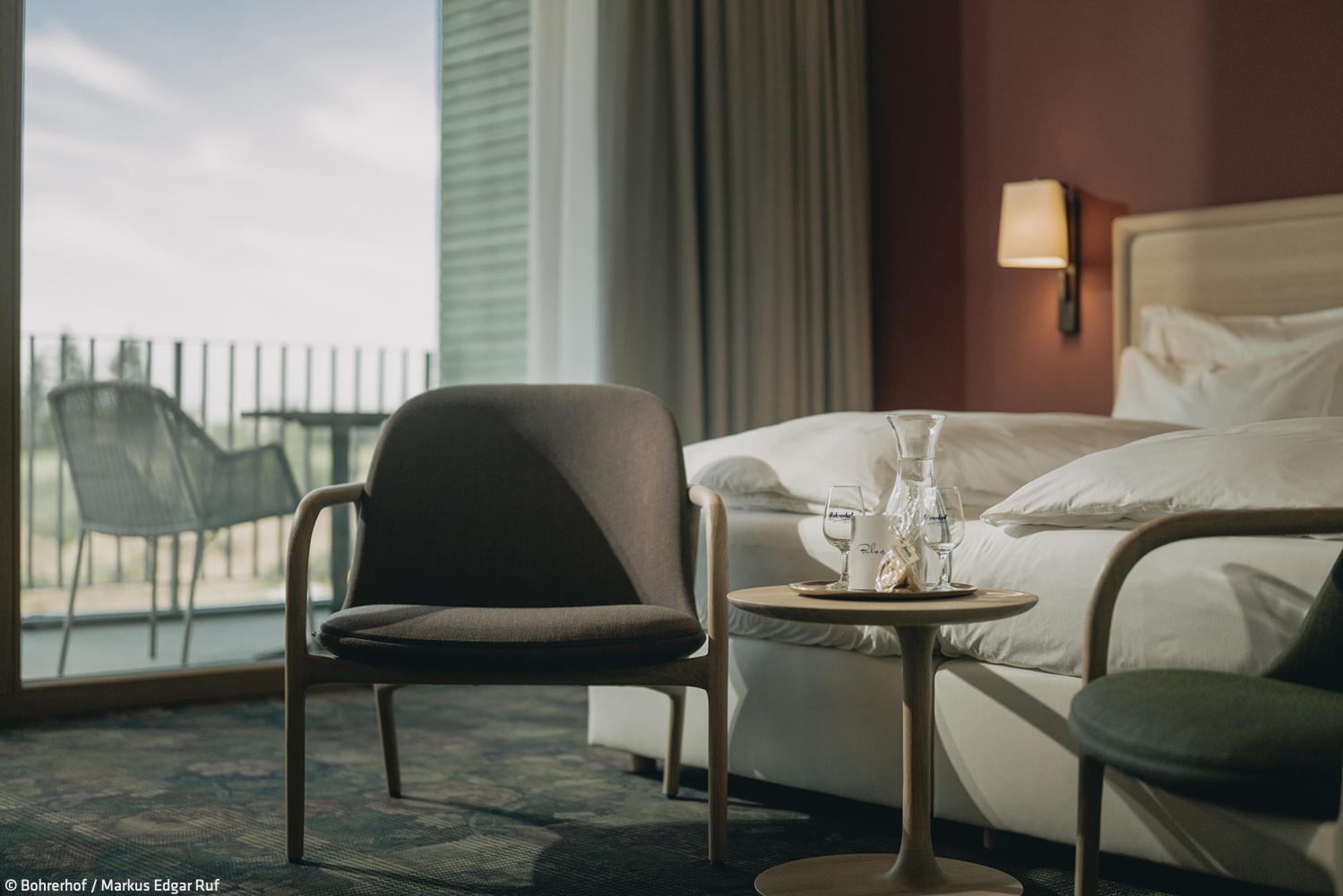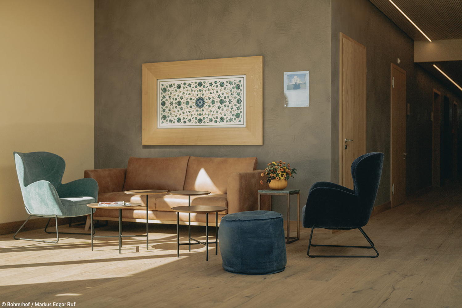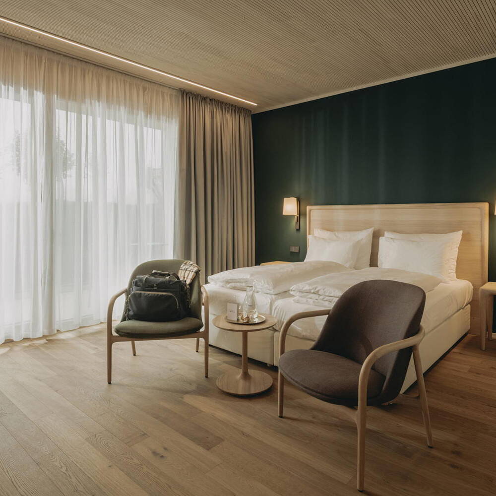 Jede der 64 Gästeeinheiten verfügt über einen Balkon oder eine Terrasse, die nach Südosten oder Südwesten ausgerichtet sind – ein Entwurf, der Licht, Weite und Landschaftsbezug in den Vordergrund stellt. Das Interieur folgt dem Geist des Hofs – die Zimmer präsentieren sich handwerklich, echt und puristisch, großzügig geschnitten, mit hohen Decken und viel Tageslicht. Holzoberflächen, Naturstein und organische Wandverkleidungen schaffen eine Verbindung zwischen moderner Architektur und den Rohstoffen der Region. Auch das zeitlose, puristische Mobiliar – von Holztischen bis zu Massivholzbetten – folgt diesem Gedanken. Das Landhotel erreicht zudem eine bemerkenswerte 80-prozentige Autarkie. Eine großflächige Photovoltaikanlage liefert Strom, und anstelle herkömmlicher Klimageräte entwarfen die Bohrers in Eigenregie ein effektives Kühlbalkensystem, das mit Grundwasser gespeist wird. Diese Technik sorgt für natürliche Kühlung und spart jährlich Hunderte Tonnen CO₂ ein.