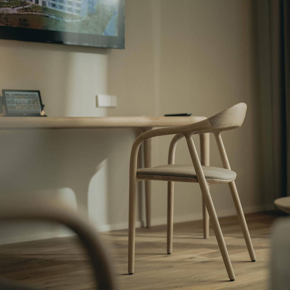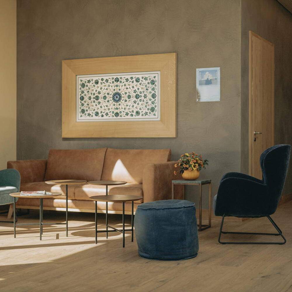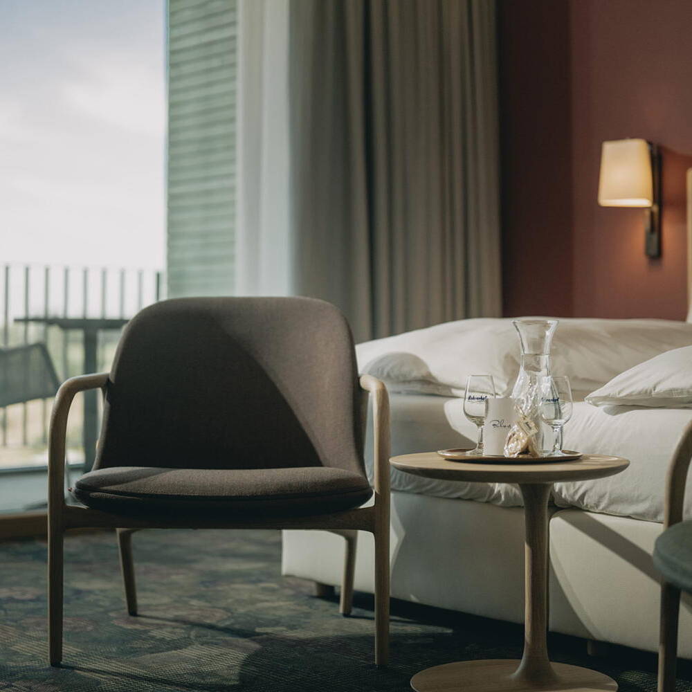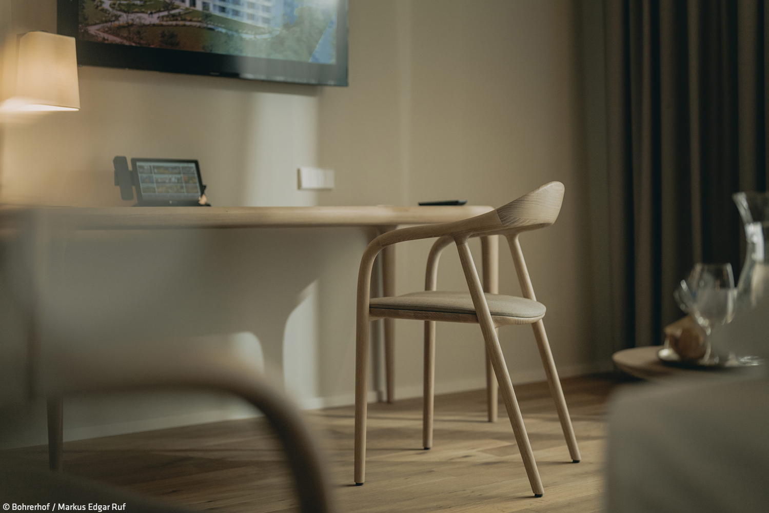 Jede der 64 Gästeeinheiten verfügt über einen Balkon oder eine Terrasse, die nach Südosten oder Südwesten ausgerichtet sind – ein Entwurf, der Licht, Weite und Landschaftsbezug in den Vordergrund stellt. Das Interieur folgt dem Geist des Hofs – die Zimmer präsentieren sich handwerklich, echt und puristisch, großzügig geschnitten, mit hohen Decken und viel Tageslicht. Holzoberflächen, Naturstein und organische Wandverkleidungen schaffen eine Verbindung zwischen moderner Architektur und den Rohstoffen der Region. Auch das zeitlose, puristische Mobiliar – von Holztischen bis zu Massivholzbetten – folgt diesem Gedanken. Das Landhotel erreicht zudem eine bemerkenswerte 80-prozentige Autarkie. Eine großflächige Photovoltaikanlage liefert Strom, und anstelle herkömmlicher Klimageräte entwarfen die Bohrers in Eigenregie ein effektives Kühlbalkensystem, das mit Grundwasser gespeist wird. Diese Technik sorgt für natürliche Kühlung und spart jährlich Hunderte Tonnen CO₂ ein.