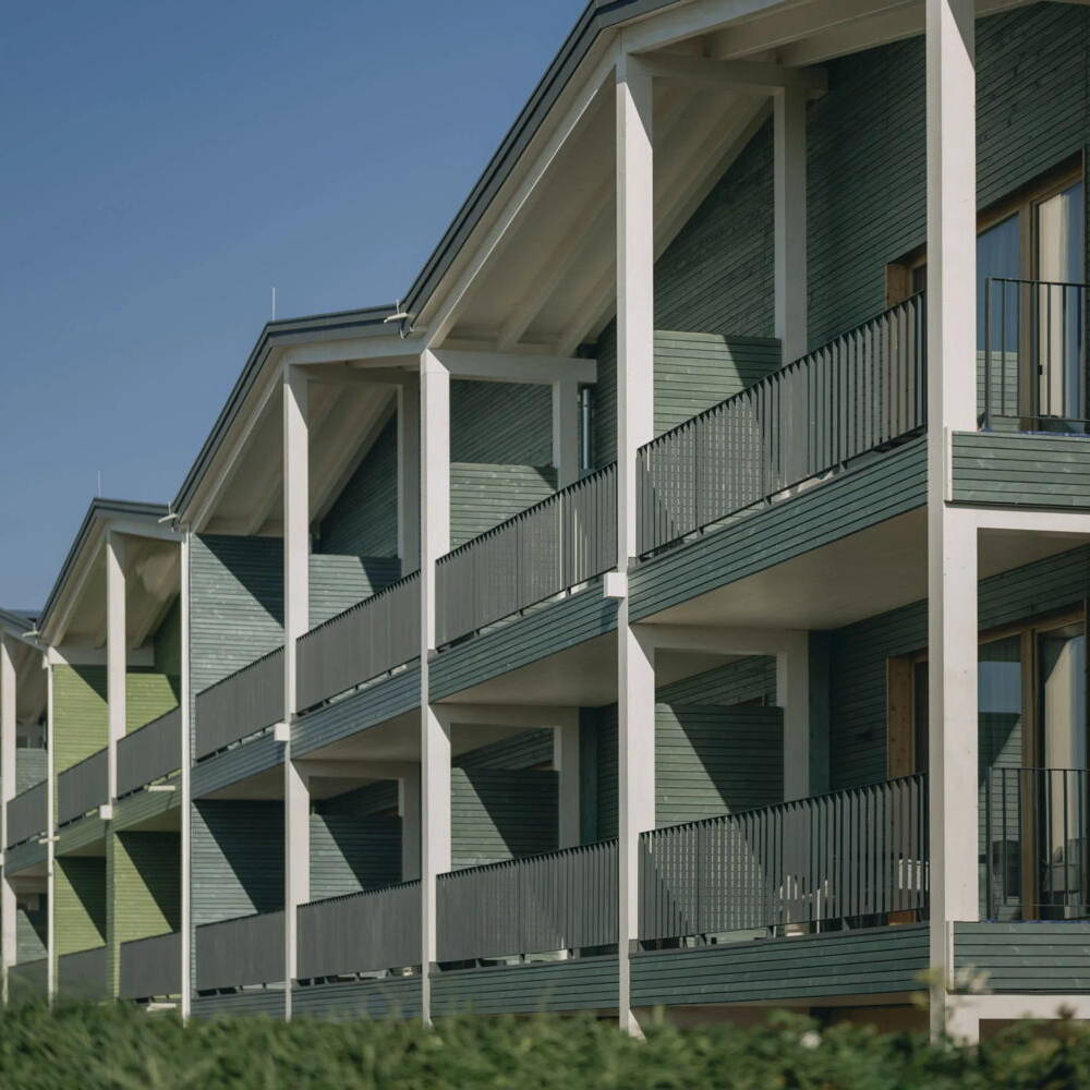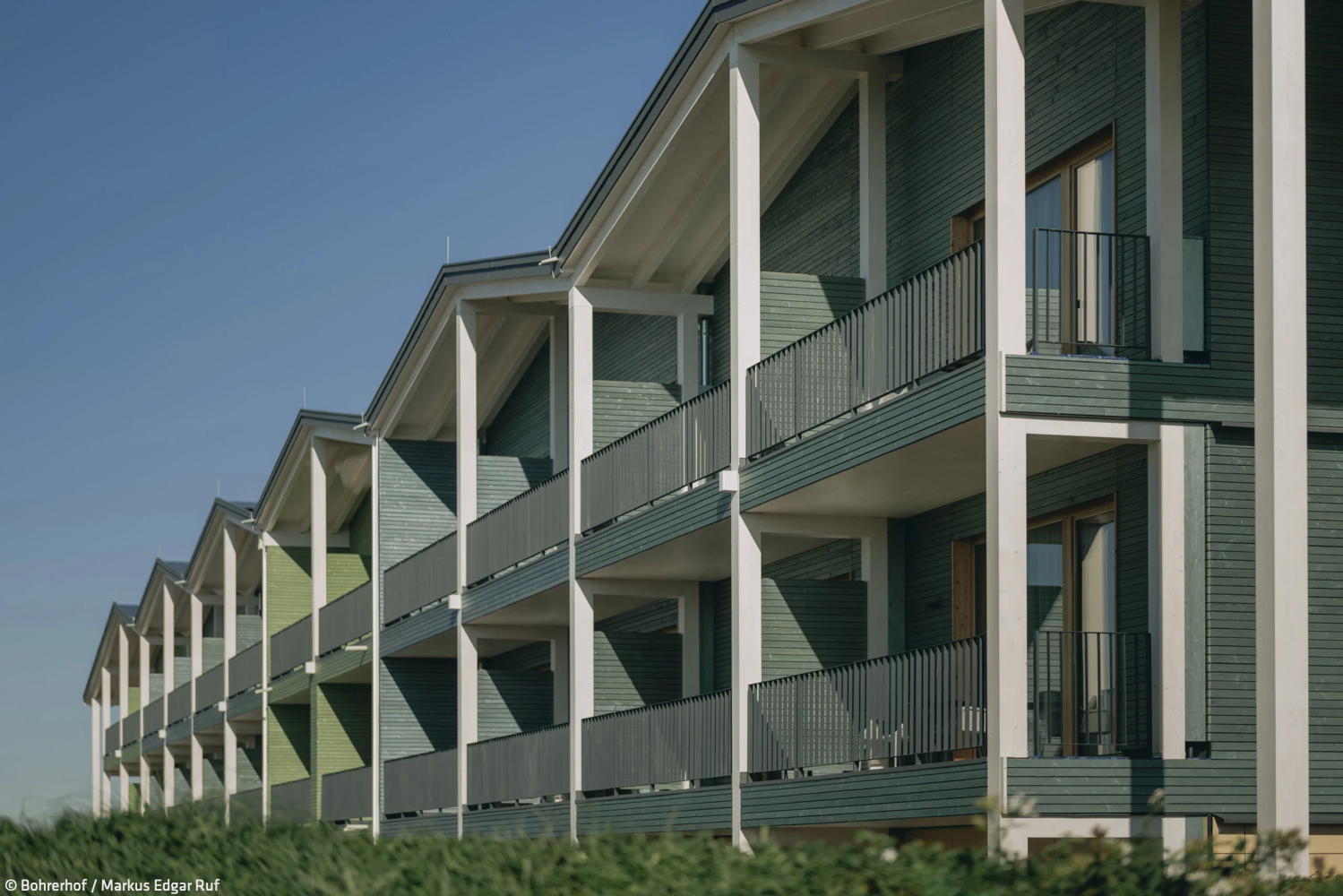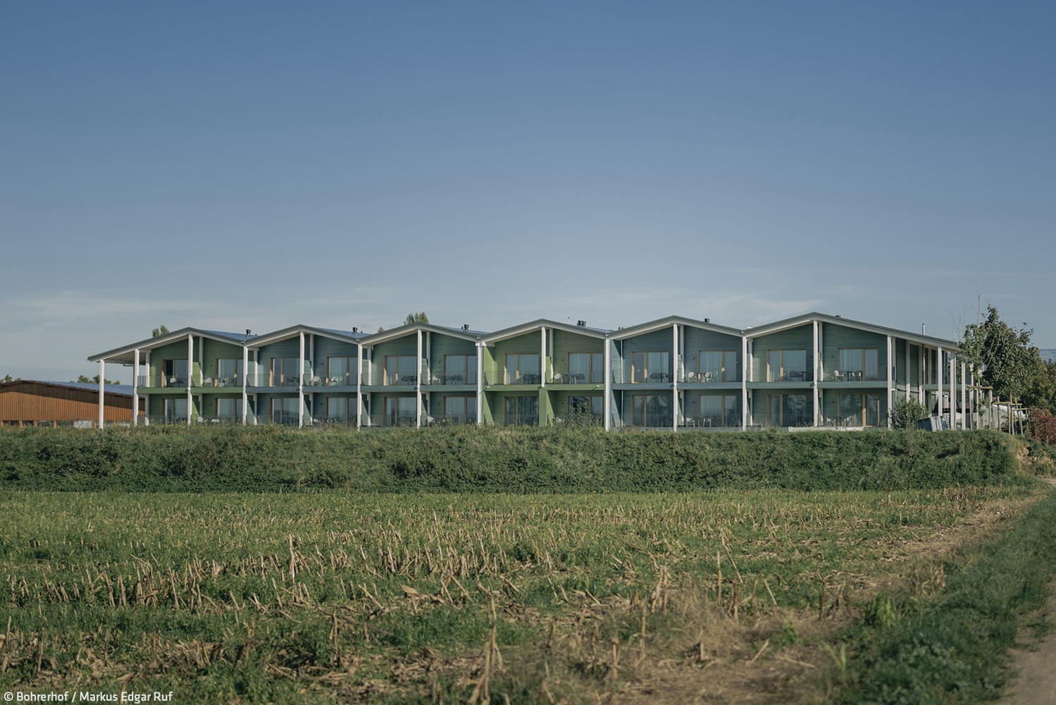 Errichtet von der Unternehmerfamilie Bohrer, die seit über vier Jahrzehnten für Gemüseanbau in der Region steht, präsentiert sich der Neubau als klar strukturierter, dreigeschossiger Holzbau in Tafelbauweise. Statt Beton und Stahl prägen heimische Hölzer wie Tanne und Fichte aus dem Schwarzwald die Konstruktion. Rund 1.500 m³ Bauholz und 1.200 m³ Holzfaserdämmung kamen zum Einsatz – Materialien, die nicht nur CO₂ einsparen, sondern auch für ein gesundes Raumklima sorgen. Die Entscheidung für Holz ist ein bewusster Bruch mit der gängigen Stahlbetonarchitektur im Hotelsektor. Architekt Rudolf Lais legte Wert auf eine klare Formensprache, die das bäuerliche Umfeld respektiert und zugleich zeitgemäß interpretiert.