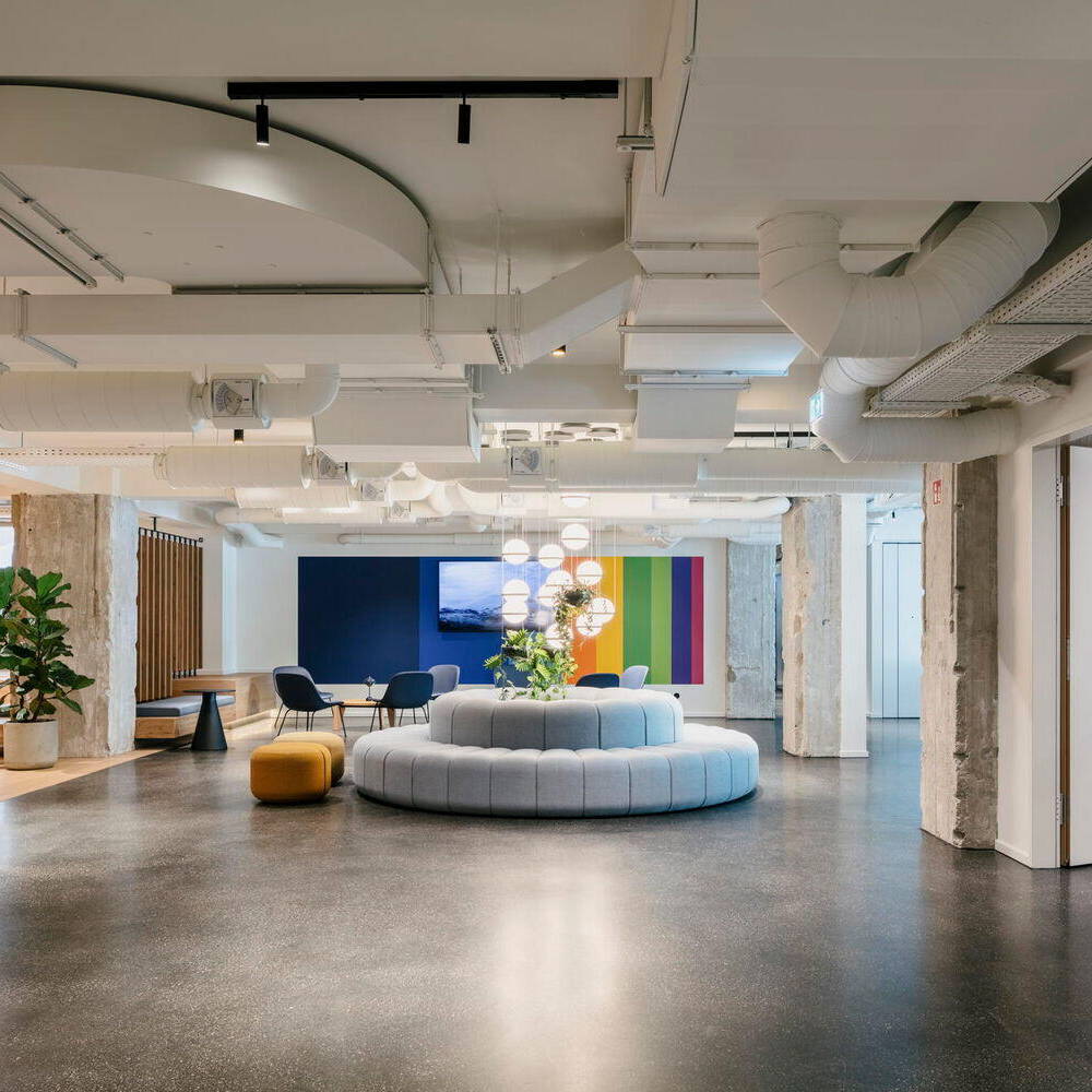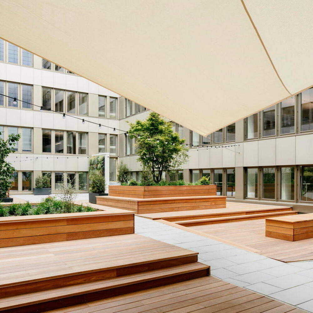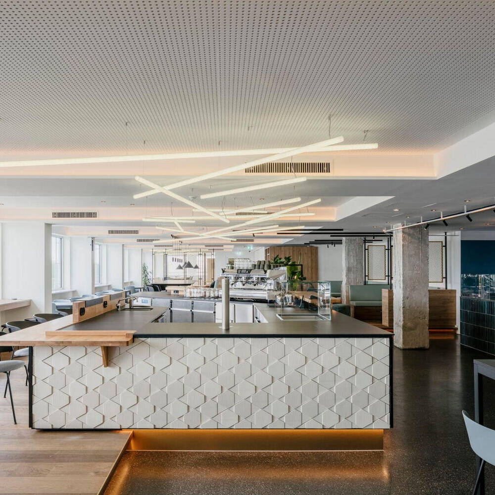 Um dem abwechslungsreichen Arbeitsalltag der rund 350 Angestellten noch mehr Raum zu geben, haben die Architekt:innen zusätzlich im Empfangsbereich eine Lobby als Herzstück einer vielseitigen Konferenzetage geschaffen. Sie umfasst auch einen üppig grünen Innenhof und eine „Blackbox“, das zu einem multimedialen Auditorium umgestaltete ehemalige Rechenzentrum. Im siebten Stock, der Endetage, lädt jetzt ein Clubrestaurant mit Blick über die Außenalster ein. So wurde zeitgemäße Gestaltung mit den unterschiedlichen Erwartungen und Gewohnheiten der Belegschaft in enger Zusammenarbeit in Einklang gebracht, auch um ein über die Etagen und Nutzungen hinweg selbstverständliches Erscheinungsbild zu erzielen. Nachhaltigkeit und Langlebigkeit waren dabei zentrale Planungsprinzipien.