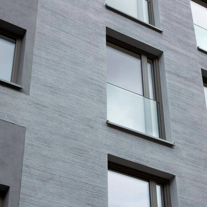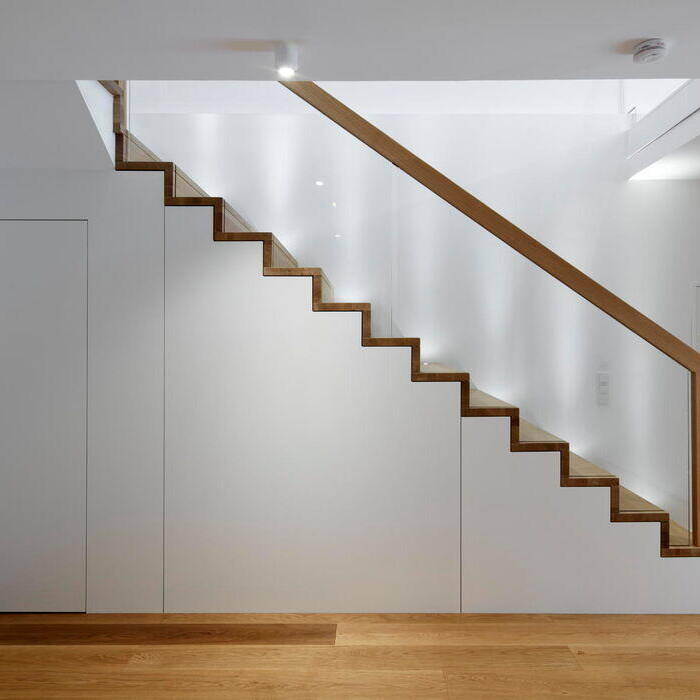 Zur Leitidee des Umbaus wurde der Gedanke, so weit wie möglich mit der vorgefundenen Bestandssubstanz zu arbeiten, diese weiter zu optimieren und – wo möglich – auch zu erweitern. Dadurch konnte nicht zuletzt neuer Raum für Wohnflächen erschlossen werden: So wurde durch den Ausbau des Untergeschosses und die Zusammenlegung mit dem Erdgeschoss eine großzügige Maisonettewohnung mit Terrasse und eigenem Garten geschaffen. Durch den kompletten Neuaufbau des Dachgeschosses konnte zudem eine Dachmaisonette über zwei Etagen entstehen, die sich mit ihren beiden garten- und straßenseitig angeordneten Dachterrassen in beide Richtungen mit Weitblick öffnet. Das in seinem Volumen überarbeitete Dachgeschoss greift dabei die Traufkanten der Nachbarhäuser der geschlossenen Blockrandbebauung auf. Aber auch die drei weiteren Wohnetagen bieten ein lichtdurchflutetes Durchwohnen von der Straße bis in den Garten. Die zur Gartenseite bereits vorhandenen bodentiefen Fensterfronten wurden dabei erhalten – zusammen mit den überdachten Loggien öffnen sie die Wohnungen in den beruhigten Gartenhof. Zur Straßenseite sah die Planung vor, die Fensterflächen zu vergrößern, so dass auch hier jetzt überwiegend bodentiefe Fenster für grüne Aussichten in den gegenüberliegenden Park sorgen. Im Zusammenspiel mit den Eichendielen und den weiß verputzten Wände ergibt sich ein angenehmes wohnliches Ambiente mit viel Außenkontakt. Die veränderten Fensterformate sorgen nach außen zugleich für ein neues Gesicht des Gebäudes zur Straße. Die Fassade, die energetisch ertüchtigt und mit einer nachhaltigen Mineralwolle gedämmt wurde, hat dabei einen Finish aus Kalkzementputz erhalten. Der Besenstrich erzeugt darauf ein plastisches Licht- und Schattenspiel.