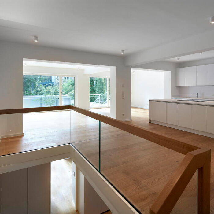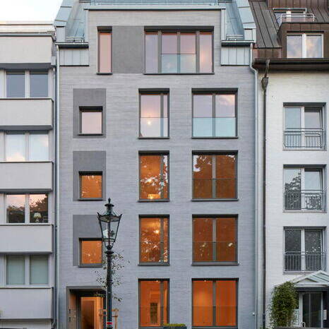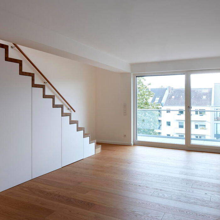 Das fünfgeschossige Mehrfamilienhaus, in exklusiver Lage direkt am Düsseldorfer Zoopark, war in die Jahre gekommen und sollte komplett saniert und dabei zugleich neu geordnet werden. Die beauftragen Düsseldorfer pier7 architekten, die ihr Büro nur einige Häuser weiter unterhalten, entwickelten einen Umbau, der ein lichtdurchflutetes Wohnen auf allen Etagen ermöglicht.