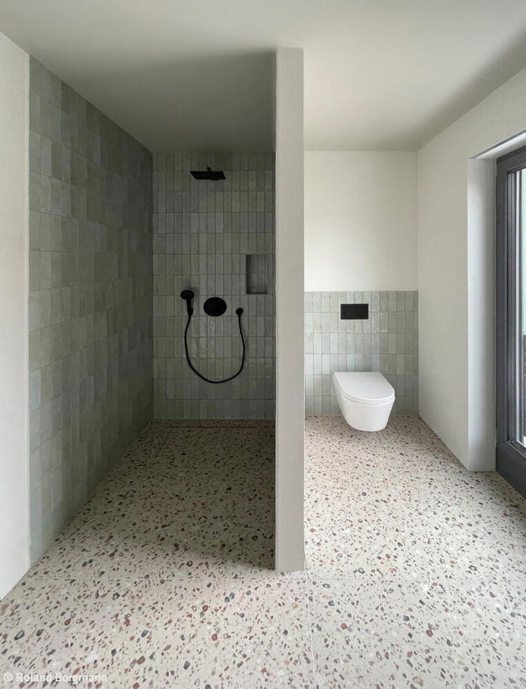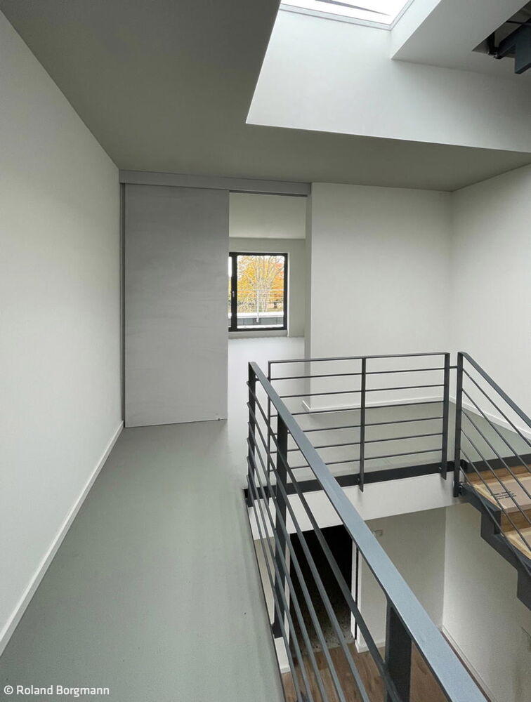 Die Reihenhäuser stehen in einer Flucht mit der vorhandenen Bebauung und interpretieren diese zeitgemäß neu. Das 1.300 m² große Grundstück grenzt gartenseitig an den See – eine Perspektive, die die bodentiefen Fenster großzügig aufgreifen. Durch die Aneinanderreihung der Reihenhäuser konnte im Vergleich zu fünf frei stehenden Häusern viel bewitterbare Fassadenfläche eingespart werden. Die drei- bis zweieinhalbgeschossigen Häuser erhalten durch unterschiedliche Fassadenfarben und variierende Fensterformate jeweils einen eigenständigen Charakter. Die Baustoffe erfüllen hohe Umweltstandards: Tragende Wände bestehen aus Kalksandstein, auf Beton wurde bewusst verzichtet. Die Dämmung wurde in Mineralwolle ausgeführt und mit mineralischem Putz gearbeitet. Die Dachflächen sind anteilig begrünt. An den Eingangsbereich ordnen sich die Funktionsbereiche Garderobe, Gäste-WC und Abstellraum an. Der etwas tiefergelegene offene Wohn- und Essbereich im Erdgeschoss besticht durch eine überhöhte Raumhöhe von 2,90 Meter. Über eine schwellenlose Schiebetür gelangt man auf die ebenerdige Terrasse und in den großzügigen Garten. Im ersten Obergeschoss sind zwei Zimmer und ein Bad verortet, während im darüberliegenden Staffelgeschoss ein weiteres Bad und ein Raum im Studio-Stil entstanden, der ebenfalls zum Garten ausgerichtet ist. Analog zum Erdgeschoss sind die Obergeschosse mit bodentiefen Fenstern in Richtung Garten ausgestattet. Die Fenster im Staffelgeschoss dienen außerdem hier als Zugang zur Terrasse. Im Zentrum jedes Reihenhauses liegt das Treppenhaus. Ein großzügiger Luftraum mit Oberlicht im Dach leitet natürliches Tageslicht durch alle Geschosse. Die Dachterrasse wird mittels einer Dachklappe erschlossen. Dank flexibler Grundrisse lassen sich Nutzungskonzepte nachhaltig und zukunftsfähig gestalten: Die Häuser passen sich an wechselnde Lebensumstände an und bieten multifunktionale Flächen mit maximalem Gestaltungsfreiraum.