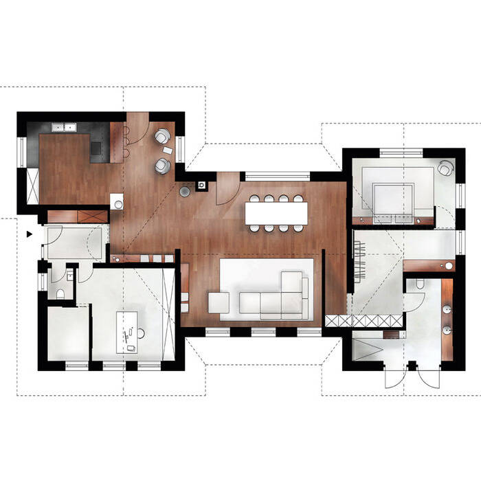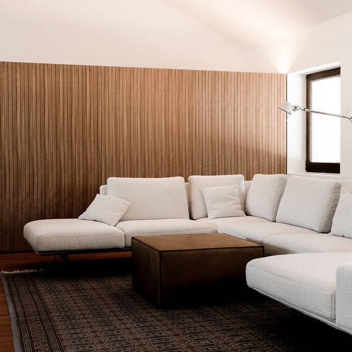 Die eingeschossige Wohnfläche des Gebäudes erhielt durch das bewusste Öffnen, Versetzen und Verschließen der vorhandenen Wandelemente einen fließenden Grundriss: Statt voneinander separierter Einzelräume ist ein kontinuierlicher Raum entstanden, der Blickbezüge ganz bewusst setzt. Dabei wurde auch eine neue Zonierung der öffentlichen und privaten Bereiche vorgenommen: Eine Trennwand mit verdeckt geführter Schiebetür separiert unscheinbar den Wohn- und Essbereich von den privateren Zonen für Schlafzimmer, Ankleide und Masterbad. Die bis zu fünf Meter hohe Decke des Walmdaches wirkte  zuvor in ihrer dunklen Farbgebung eher erdrückend. Eine neu eingeführte, helle Deckenverkleidung lässt sie  nun leichter im Raum erscheinen. Wallwasher, die in die umlaufenden Lamellentrennwände integriert wurden und die Decke so künstlich anstrahlen, lassen die Dachschrägen wie ein dem Raum aufgesetztes, segelartiges Zelt erscheinen. Alle raumbildenden Elemente – sowohl die Trennwände, als auch die Türen, Fensterstürze und Einbauten – bewegen sich dazu auf einer einheitlichen Bezugshöhe, was dem Ausbau zusätzliche Ruhe verleiht.  Ein großes Augenmerk wurde auf eine klare, puristische Formensprache gelegt: So ziehen sich Lamellenwände mit Schattenfuge wie ein verbindendes Band durch alle Raumzonen – teils mit verdeckt integriertem Garderobenschrank, offener Ankleide oder angegliedertem Masterbett.