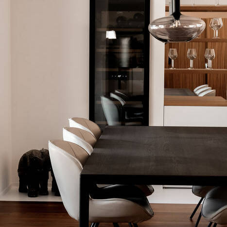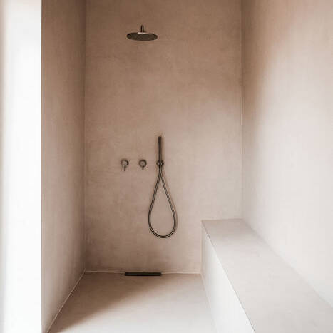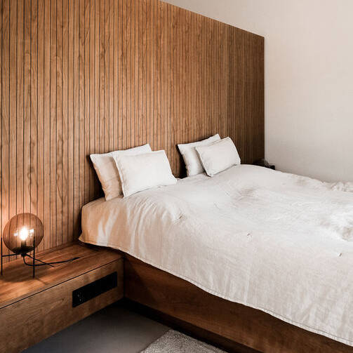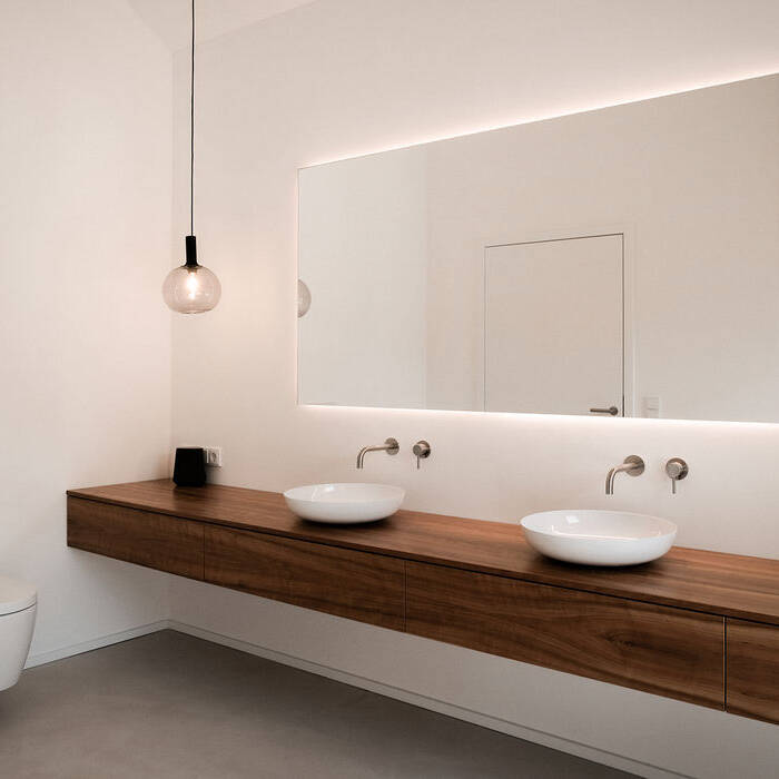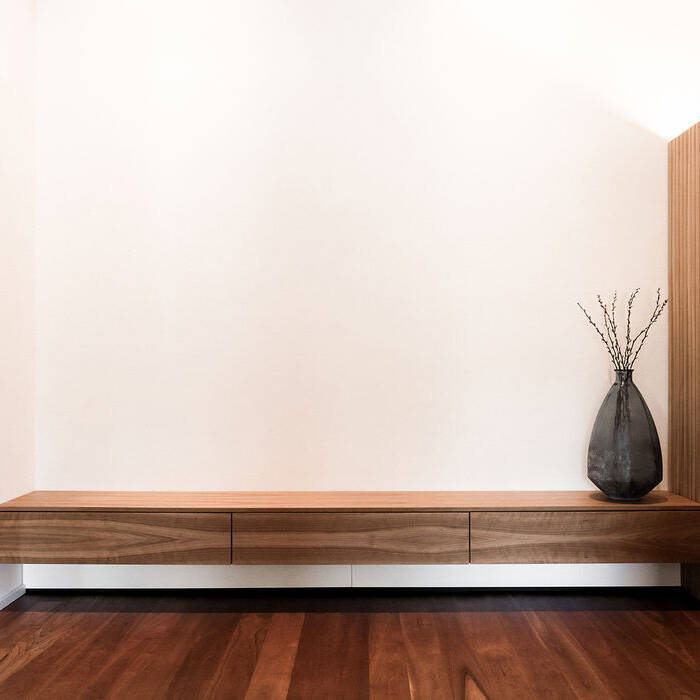 Auch die schwebenden Sideboards, Sitzbänke und ein fünf Meter langer Waschtisch wirken so, als wären sie aus einem Guss. Dazu tritt eine starke Materialreduktion: Das geölte Kirschholz, aus dem die Elemente vom Schreiner gefertigt wurden, sorgt für eine natürliche, warme Grundatmosphäre, die in den Wohnbereichen durch ein Kirschholzparkett zusätzlich verstärkt wird. Die privateren Zonen rund um Schlafzimmer und Ankleide sind dagegen von einem fugenlosen Zementboden geprägt, der fließend in die Nassbereiche der Wellness-Dusche übergeht. Ein Austritt aus dem Bad ermöglicht zudem den Zugang zu einer separaten Wellness-Terrasse mit Sauna, Sonnendeck und Outdoor-Whirlpool, die von einer natürlichen Bepflanzung gesäumt wird.