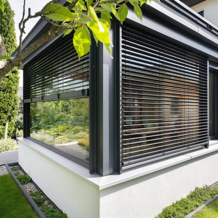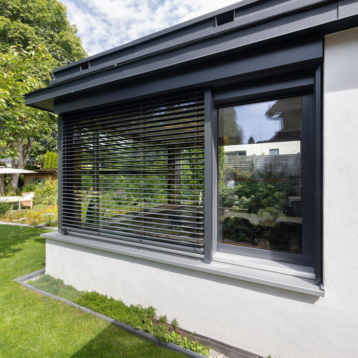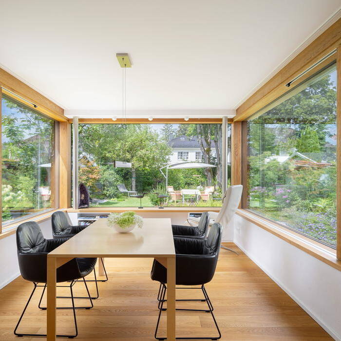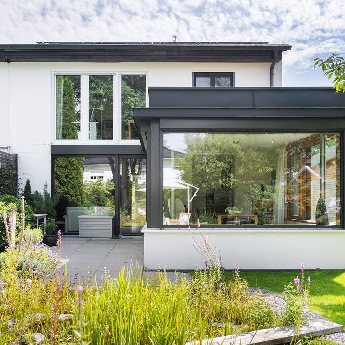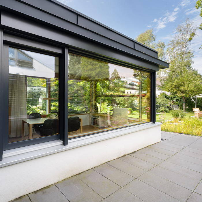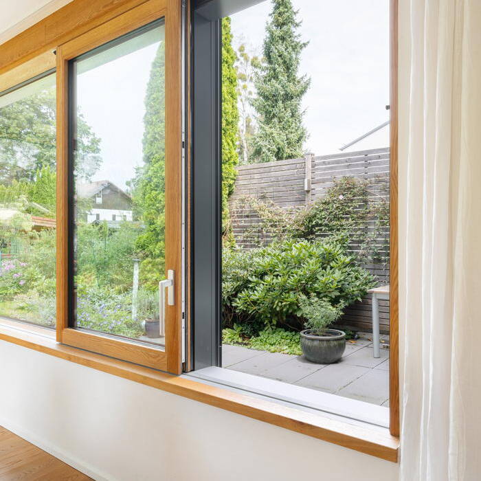 Ein aktuelles Projekt für eine Münchner Familie war ein Flachdachanbau mit begrüntem Dach, Holz-Alu Hebe-Schiebetüren, innen Eiche gebürstet und geölt, außerdem neue Fenster in Holz-Alu sowie Sonnenschutz Rollladen. Durch sein modernes und zugleich zeitloses Design passt sich der Anbau perfekt an das Bestandsgebäude an – und sorgt mit seiner Flachdachbegrünung auch noch für einen positiven CO2-Fußabdruck. Die Besonderheit sind die Hebeschiebetüren aus Holz-Alu. Mit ihnen genießt man den unübertroffen gemütlichen Charme von Holz im Innenraum und zugleich die Sicherheit einer Außenverschalung aus Aluminium. Auch die neuen Fenster für das Haus wurden in Holz-Alu gewählt, wobei die Außenfarbe in dunklem Anthrazit für ein modernes und zeitloses Aussehen sorgt.