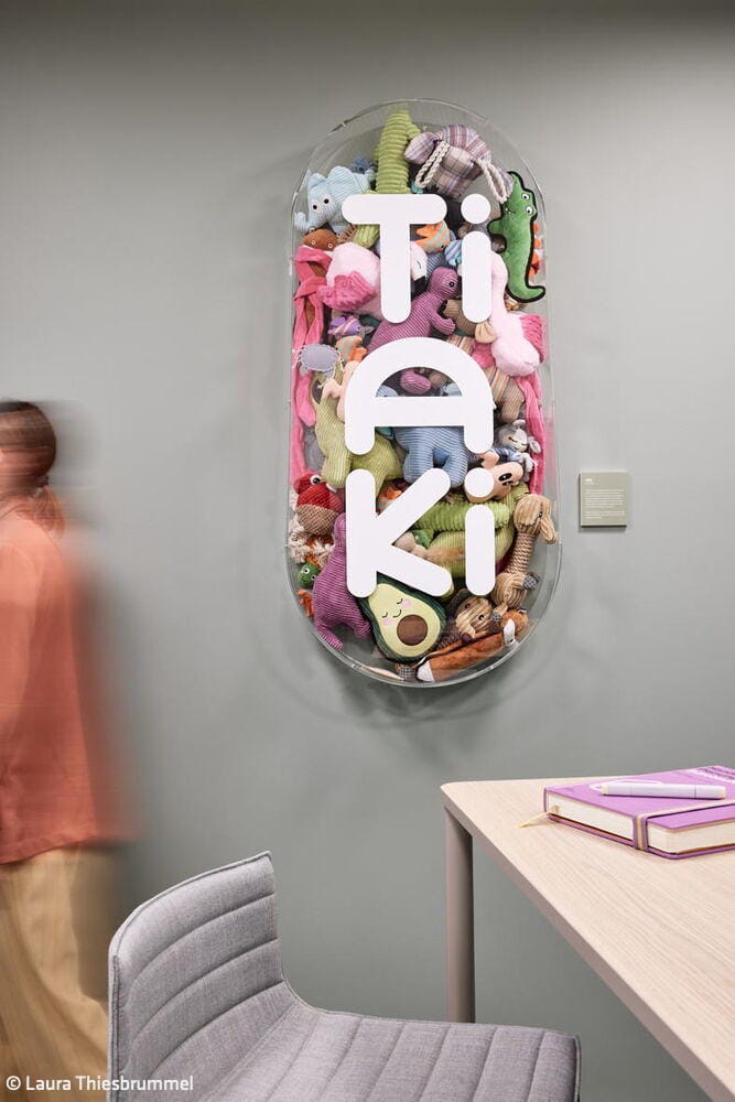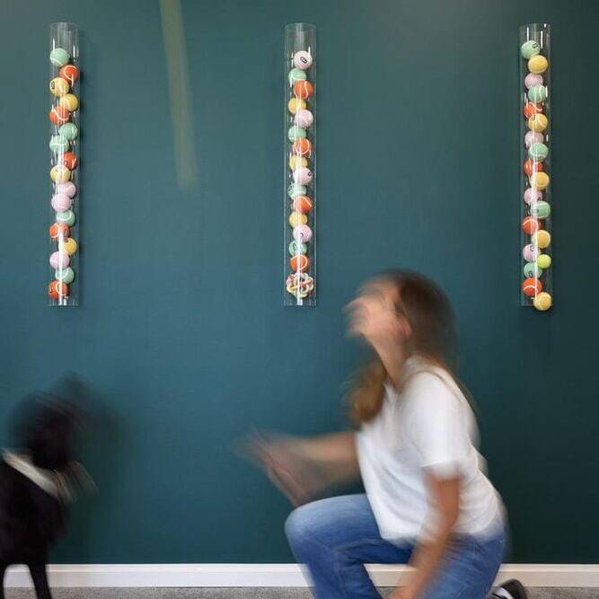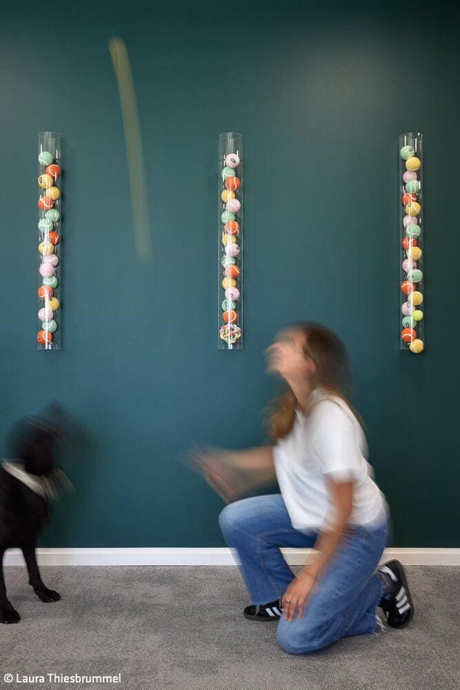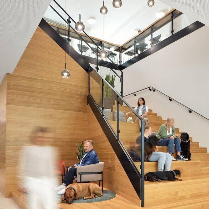 Das Innenraumkonzept folgt dem Prinzip des Activity-Based-Workings und ermöglicht Mitarbeitenden, den Arbeitsplatz situativ zu wählen: ob konzentriertes Arbeiten in Fokuszonen, kreativer Austausch in offenen und geschlossenen Bereichen oder Begegnung in der großzügigen „Townhall Area“ mit Sitztreppe. Community Spaces und gemütliche Chillout-Bereiche laden zum Vernetzen und Entspannen ein, während ein repräsentativer Boardroom sowie vielfältige Konferenz- und Projekträume Raum für professionelle Zusammenarbeit bieten. Abgerundet wird das Arbeitsumfeld durch vielfältige Sonderflächen: eine Testfood Kitchen, einen Fahrradraum sowie Duschen und Umkleiden. Ein herausragendes Merkmal des neuen Headquarters ist das Dog-Workplace-Konzept. Es Hundearbeitsplätze, Dog-Stations und Pfotensäuberungsbereiche auf jeder Etage, eine „Pet Wall“ visualisiert die tierischen Teammitglieder – so sind alle Haustiere präsent. Klare Regeln sorgen dafür, dass sich alle wohlfühlen: In bestimmten Zonen sind Hunde nicht erlaubt. Externe Gassi-Services und eigene „Bark & Go“-Drop-off-Punkte, an denen Hunde zur Betreuung abgegeben werden können, ergänzen das Konzept. Farben, Materialien und Möblierung folgen einer eigens entwickelten Design-DNA in Terracotta, Grün, Petrol und Blau, die auch für Hunde gut wahrnehmbar sind. Helles Holz setzt Akzente, analog zu den Materialien des Gebäudes. Die Oberflächen sind leicht zu reinigen und damit besonders tierfreundlich. Auch die Markenwelt von zooplus wird dank kreativer Raumgestaltung erlebbar: Aus Hundeleinen und Tierspielzeug gefertigte Wandbilder und Skulpturen oder Verkleidungen aus Kratzbäumen laden zum Entdecken der Produktpalette ein. So wird der Raum zum Markenbotschafter.