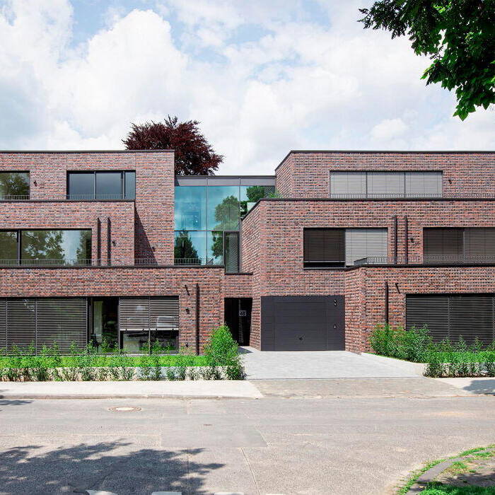 Umgeben von Ein- und Zweifamilienhäusern mit traufständigen Satteldächern, hatte sich der Bauherr für das Grundstück gewünscht, dass dieses bestmöglich ausgenutzt werden sollte. Da es sehr breit ist, bot sich eine längliche Ausdehnung parallel zur Straße an. Das Gebäude sollte sich jedoch in seiner Größe der umliegenden Bebauung anpassen. Die Architekten entwarfen ein sehr großzügiges transparentes Treppenhaus, dass das Gebäude in zwei Teile aufteilt, die wiederum die Größe der benachbarten Gebäude besitzen. Zudem nahmen sie mit der Staffelung der Etagen einerseits die Richtung der Satteldächer auf und schufen andererseits südlich gelegene Dachterrassen. Durch die Positionierung der Tiefgaragenzufahrt – fast mittig beherbergt das Gebäude einen Autoaufzug – konnte ein großzügiger Abstand zur Nachbarschaft geschaffen werden. Diese Fläche steht für Begrünung zur Verfügung. Die Fassade des Wohnhauses präsentiert sich als monolithisches Wechselspiel aus zeitlosem Klinker – gebrannt im letzten produzierendem Ringofen NRW‘s der Firma Gillrath in Erkelenz – und großzügigen Glaselementen. Diese Kombination ermöglicht es, den Innen- und Außenraum nahtlos miteinander zu verbinden und verschmelzen zu lassen. Niedrig ausgebildete Terassenbrüstungen aus schwarzem Stahl übernehmen das minimalistische Design der Geländer im Treppenhaus. Die asymmetrische Anordung der Fenster verleiht der Fassade eine dynamische und spannende Note. Großzügige Freisitze laden zum Verweilen im Freien ein, während hochwertige Materialien für ein ansprechendes Erscheinungsbild sorgen. Der integrierte Autohebelift unterstreicht den Komfort und die Exklusivität des Wohnens in dem Mehrfamilienhaus, dessen Wohneinheiten sowohl im Winter als auch im Sommer mittels Erdwärmepumpen mit Kühlfunktion optimal temperiert werden.