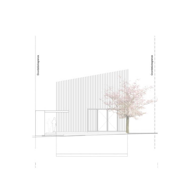 Dieses Einfamilienhaus befindet sich am Rand eines Neubaugebiets, das für das Grundstück eine Bebauung mit Wintergarten und Pultdach mit extensiver Dachbegrünung festlegt. Die Vorgaben setzten urban 3 Architekten gemeinsam mit 2BA Architekten in einem klaren Baukörper mit integriertem Wintergarten und ohne Dachüberstand um. Ein Raster aus vertikal angeordneten Holzlamellen aus vorvergrautem Lärchenholz und einer 30 Millimeter offenen Fuge bildet eine transluzente Schicht um das Gebäude und vermittelt Leichtigkeit. Im Bereich des Wintergartens verbreitert sich das Raster für eine bessere Durchsicht. In seinem individuellen Charakter setzt sich das Einfamilienhaus bewusst von der Umgebung ab und zeigt, wie hoch die architektonische Bauqualität unter Einhaltung der Vorgaben des B-Plans sein kann.