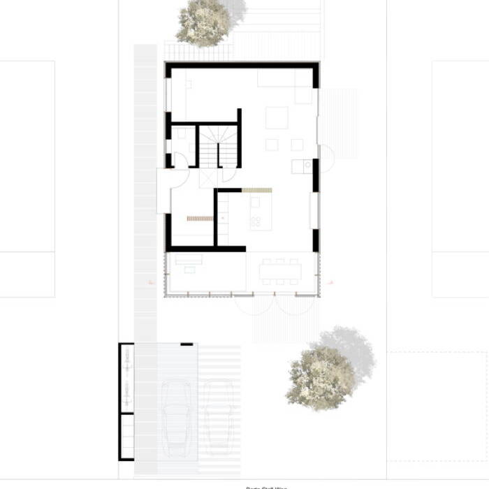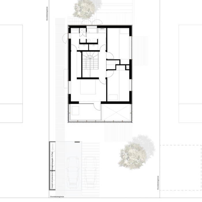 Die spielerisch angeordneten Fensteröffnungen ergeben sich aus der Raumnutzung. Ziel war es, auf der kompakten, 323 m² umfassenden Bruttogeschossfläche großzügige und offene Raumsituationen zu schaffen. Mittelpunkt des Hauses ist der offene Koch- und Essbereich im Wintergarten mit direktem Zugang zur Terrasse. Der zentrale Raum öffnet sich im Bereich des Wintergartens mit einem großzügigen Luftraum nach oben. Ebenso das Wohnzimmer und der daran anschließende Arbeitsbereich. Der Wohnraum wird als Ganzes wahrgenommen und nicht als Abfolge einzelner Räume. Es ergeben sich immer wieder spannende Blickbeziehungen im Inneren und nach außen. Wenige ausgewählte und natürliche Materialien prägen den schlichten und klaren Raumeindruck. Das massive Haupttragwerk aus Stahlbeton wurde mit Porenbetonsteinen ausgefacht. Eine hochwirksame Holzfaserdämmung ergänzt die Außenwände mit vorgehängter Holzlamellenkonstruktion. Die einfach geneigte Dachfläche ist als Sparrendach konstruiert. Das Einfamilienhaus ist an das Fernwärmenetz der Stadt angebunden und benötigt nur minimal Heizwärme – der Primärenergiebedarf liegt bei 35 kWh/m². Das Gebäude kommt komplett ohne fossile Brennstoffe aus. Eine Fußbodenheizung temperiert die Räume und im Sommer dämpft der große Wintergarten solare Einstrahlung. Die natürliche Thermik im Wintergarten sorgt für eine Abkühlung in der Nacht und ein insgesamt angenehmes Raumklima. Dazu tragen auch die Zuluftöffnungen in der Fassade zum Garten bei. Kühle Außenluft durchströmt über den Luftraum das Gebäude und tritt am Dach wieder aus. Auf diese Weise wird die hohe Speichermasse des Massivbaus effektiv genutzt.
