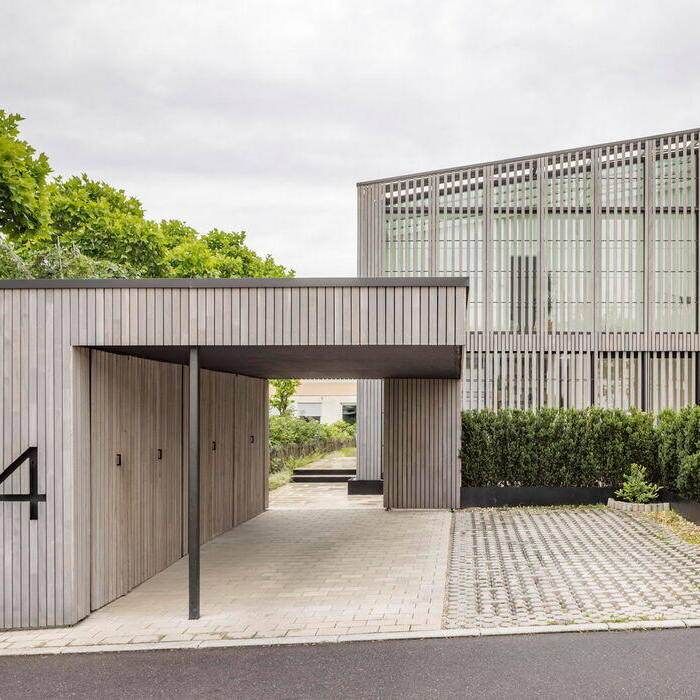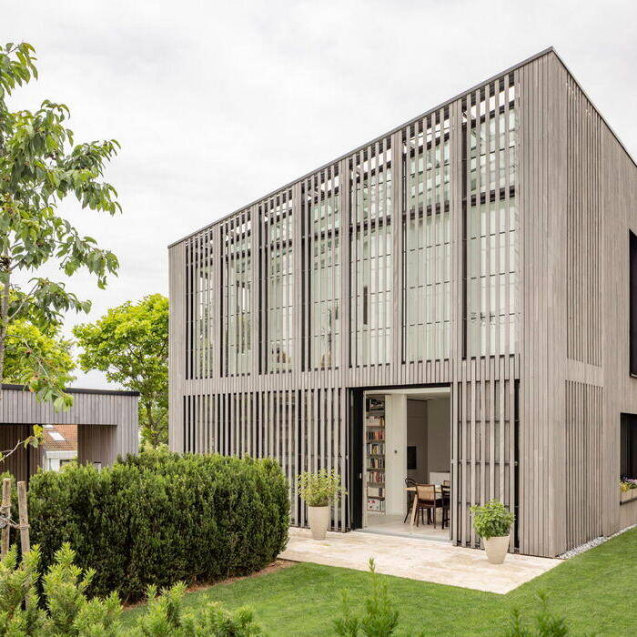 Dieses Einfamilienhaus befindet sich am Rand eines Neubaugebiets, das für das Grundstück eine Bebauung mit Wintergarten und Pultdach mit extensiver Dachbegrünung festlegt. Die Vorgaben setzten urban 3 Architekten gemeinsam mit 2BA Architekten in einem klaren Baukörper mit integriertem Wintergarten und ohne Dachüberstand um. Ein Raster aus vertikal angeordneten Holzlamellen aus vorvergrautem Lärchenholz und einer 30 Millimeter offenen Fuge bildet eine transluzente Schicht um das Gebäude und vermittelt Leichtigkeit. Im Bereich des Wintergartens verbreitert sich das Raster für eine bessere Durchsicht. In seinem individuellen Charakter setzt sich das Einfamilienhaus bewusst von der Umgebung ab und zeigt, wie hoch die architektonische Bauqualität unter Einhaltung der Vorgaben des B-Plans sein kann.