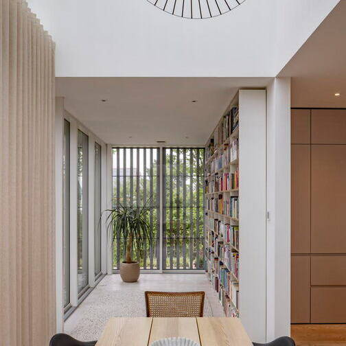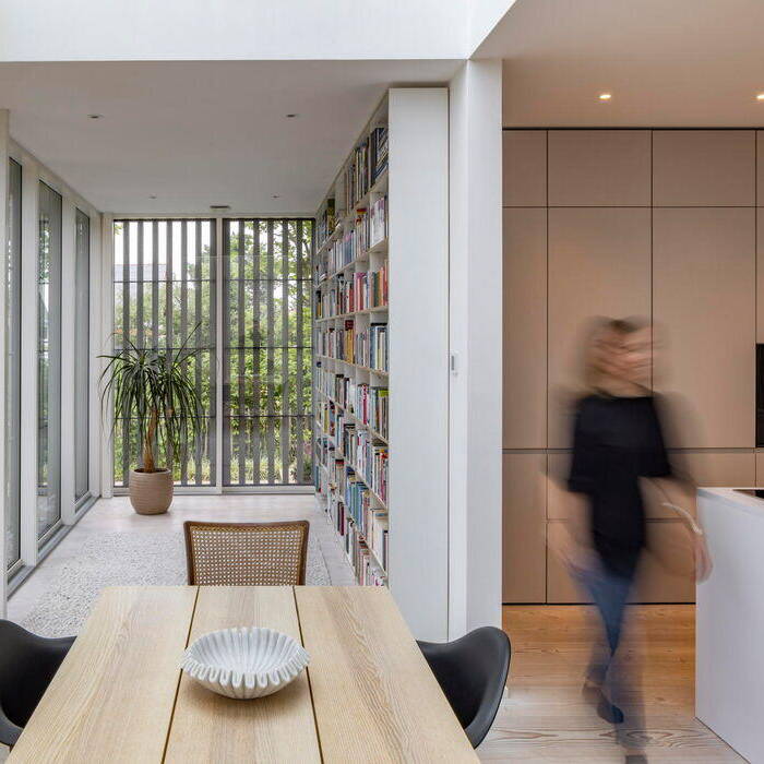 Die spielerisch angeordneten Fensteröffnungen ergeben sich aus der Raumnutzung. Ziel war es, auf der kompakten, 323 m² umfassenden Bruttogeschossfläche großzügige und offene Raumsituationen zu schaffen. Mittelpunkt des Hauses ist der offene Koch- und Essbereich im Wintergarten mit direktem Zugang zur Terrasse. Der zentrale Raum öffnet sich im Bereich des Wintergartens mit einem großzügigen Luftraum nach oben. Ebenso das Wohnzimmer und der daran anschließende Arbeitsbereich. Der Wohnraum wird als Ganzes wahrgenommen und nicht als Abfolge einzelner Räume. Es ergeben sich immer wieder spannende Blickbeziehungen im Inneren und nach außen. Wenige ausgewählte und natürliche Materialien prägen den schlichten und klaren Raumeindruck. Das massive Haupttragwerk aus Stahlbeton wurde mit Porenbetonsteinen ausgefacht. Eine hochwirksame Holzfaserdämmung ergänzt die Außenwände mit vorgehängter Holzlamellenkonstruktion. Die einfach geneigte Dachfläche ist als Sparrendach konstruiert. Das Einfamilienhaus ist an das Fernwärmenetz der Stadt angebunden und benötigt nur minimal Heizwärme – der Primärenergiebedarf liegt bei 35 kWh/m². Das Gebäude kommt komplett ohne fossile Brennstoffe aus. Eine Fußbodenheizung temperiert die Räume und im Sommer dämpft der große Wintergarten solare Einstrahlung. Die natürliche Thermik im Wintergarten sorgt für eine Abkühlung in der Nacht und ein insgesamt angenehmes Raumklima. Dazu tragen auch die Zuluftöffnungen in der Fassade zum Garten bei. Kühle Außenluft durchströmt über den Luftraum das Gebäude und tritt am Dach wieder aus. Auf diese Weise wird die hohe Speichermasse des Massivbaus effektiv genutzt.