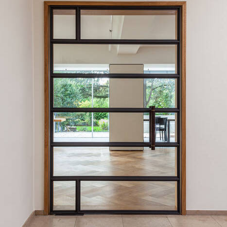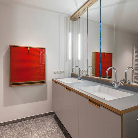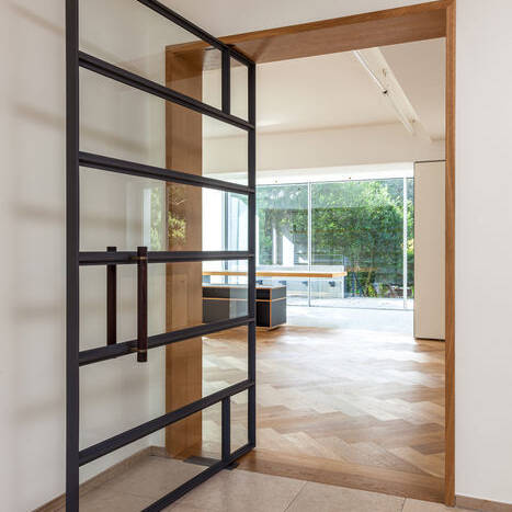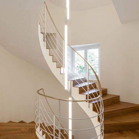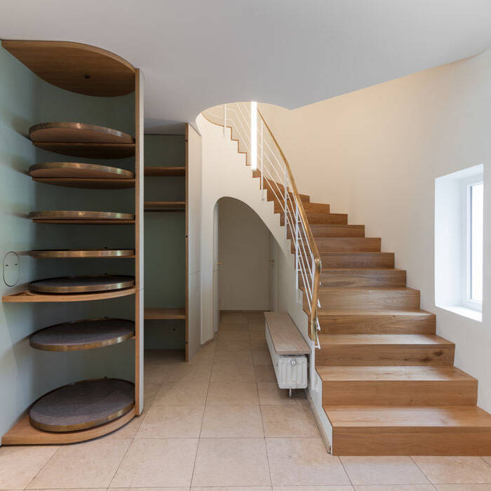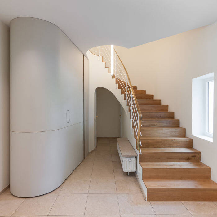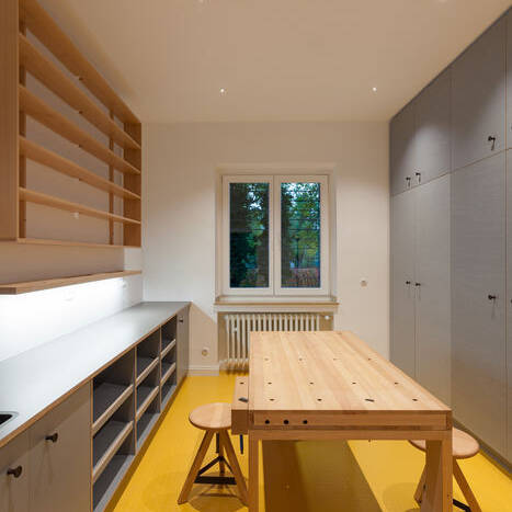 Von dieser Terrasse aus gelangt man über eine ebenso großzügige repräsentative Freitreppe in den Garten. Aber auch im Obergeschoss, wo sich die privaten Schlafbereiche und Kinderzimmer der Familie befinden, konnte auf dem Anbau eine Dachterrasse und somit ein weiterer erhöhter Ausblick in den Garten geschaffen werden. Ein besonderes Augenmerk lag bei der gesamten Planung darauf, die Zonierung der Räume an die Bedürfnisse und Wünsche der Familie anzupassen. So ergibt sich jetzt bereits vom Entree aus die Blickperspektive durch eine transparente Stahlrahmentür hindurch in die Tiefe des Gartens hinein. Der sich an den Eingangsbereich anschließende Wohnbereich öffnet sich großzügig in den neuen gläsernen Anbau, in dem sich der offene Essbereich befindet. Die Küche mit einem freistehenden Küchenblock hat ihren Platz an der Stirnseite des Wohnzimmers gefunden. Darüberhinausgehend ging es bei der Planung aber auch darum, den Räumen einen eigenen Charakter zu verleihen: So befindet sich etwa an prominenter Stelle des Hauses im Erdgeschoss eine voll ausgestattete, liebevoll gestaltete Kinderwerkstatt, die der kreativen Entfaltung der kleinen Bewohner:innen bewusst keine Grenzen setzt. Viele der umgesetzten Details – etwa auch der perfekt in das geschwungene Treppenhaus eingepasste Garderobenschrank – sind schließlich der intensiven Zusammenarbeit mit der Schreinerei Bereuter aus dem Bregenzer Wald zu verdanken, die alle vorgenommenen Einbauten mit großer Hingabe und Inspiration umgesetzt hat.