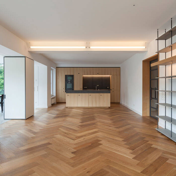 In bester, ruhiger und geradezu idyllischer Wohnlage hatte der Bauherr ein freistehendes Haus aus den 1950er-Jahren für sich und seine Familie erworben. Das auf einem Eckgrundstück situierte Objekt bestach nicht zuletzt durch seinen großzügigen, nach Süden ausgerichteten Garten mit altem Baumbestand, der noch auf die Bauzeit zurückging. Brandt Architekten aus Düsseldorf wurden damit beauftragt, die vormals kleinteiligen Räume familienorientiert neu zu ordnen und das ebenfalls in die Jahre gekommene Interior umfänglich zu sanieren und zu ergänzen.