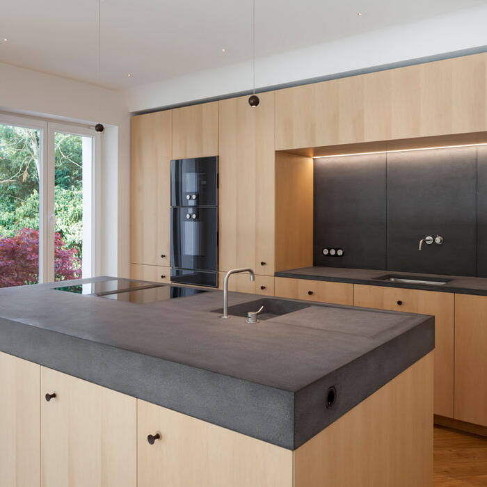 Die Raumaufteilung, aber auch die in den Innenbereichen des Hauses verwendeten Materialien erschienen insgesamt nicht mehr zeitgemäß, sodass auf beiden Etagen größere Umbauten vorgenommen wurden. Eine besondere Schwachstelle des Gebäudes zeigte sich darin, das keine Sichtverbindung zum Garten vorhanden war. Es gab nahezu keine Fensteröffnung, die einen Ausblick in den großzügigen Außenraum erlaubte. Die Architekten entschieden sich zusammen mit den Bauherren dafür, die gesamten Erdgeschossfassade komplett zurückzubauen. Gartenseitig wurde dem Baukörper anschließend ein vollständig verglaster eingeschossiger Anbau angegliedert. Durch den Einbau von Glasschiebeelementen die sich durch ihre besonders schmalen Profile auszeichnen, besteht nun eine fast nahtlose Sicht ohne Einrahmung in den Garten. Da der Erdgeschossbereich des Altbaus auf einem höheren Niveau lag als der Garten, bot es sich zudem an, vor dem Anbau eine große weitläufige Außenterrasse zu schaffen, die als Sichtbetonkonstruktion umgesetzt wurde.