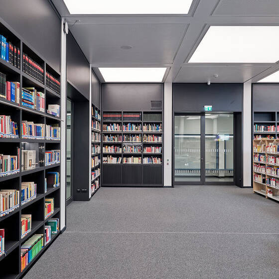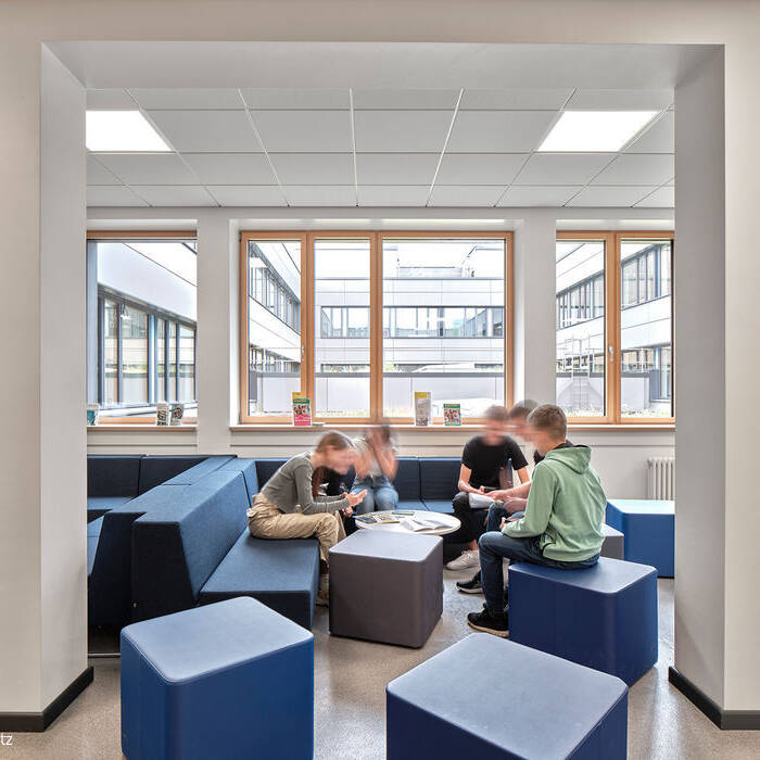 Aufgrund des hohen Flächenmehrbedarfs (quantitativ/qualitativ) haben Christl+Bruchhäuser Freie Architekten das große Gießener Gymnasium von Grund auf um- und neugestaltet, um einen Neubau erweitert und an die heutigen pädagogischen Bedürfnisse der Schüler:innen angepasst. Neues Herzstück ist zweifellos der ehemalige Innenhof, der im Zuge der Neugestaltung eine wahre Metamorphose erlebte: Aus dem einst ungemütlichen und düsteren Hof wurde ein überdachtes Medienzentrum, das nicht nur funktional, sondern auch ästhetisch und sozial den neuen Mittelpunkt des gesamten Gebäudes bildet. Tageslicht und zusätzliche Lichtdecken schaffen eine helle und einladende Atmosphäre, die die hochwertigen Einbaumöbel und stilvollen Holzregale zusätzlich unterstreichen. So entstand eine inspirierende Lern- und Aufenthaltslandschaft mit Bücherausleihe, Lesesaal, PC-Arbeitsplätzen und großzügigen Ruhezonen.