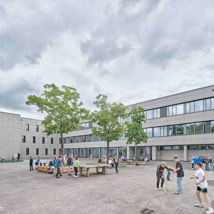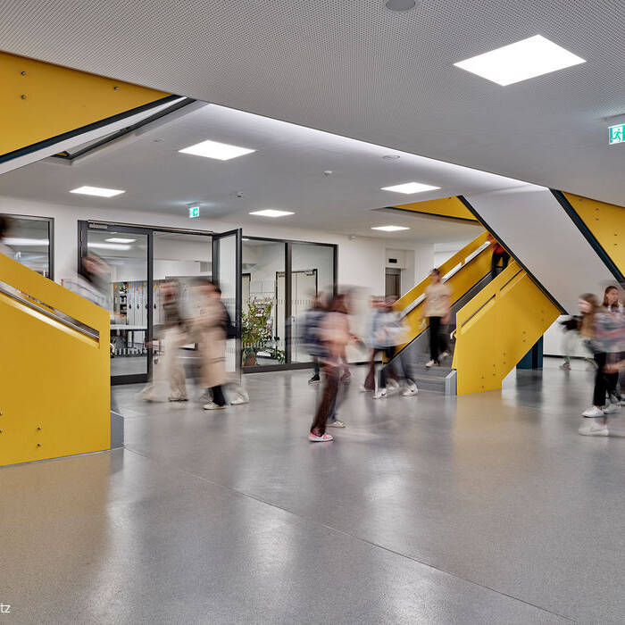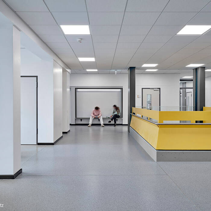 Viel Positives wurde mit den 8.750 m² der neu- und umgebauter Bruttogeschossfläche erreicht: Lichtdurchflutete, helle und mit der neuesten Technologie ausgestattete Klassenräume, die einen differenzierten Unterricht ermöglichen, 13 Sonderräume, darunter für Kunst, Musik, darstellendes Spiel und den Ganztagsbetrieb, eine von der schuleigenen GmbH betriebene Cafeteria mit Kiosk für die Schüler:innen oder auch ein verbreiterter und um ein Geschoss erweiterter Schulflügel. Dabei erfüllt die Gießener Herderschule nach der kompletten Entkernung und Neuplanung nicht nur moderne Bildungsstandards. Dank des neuen Aufzugs ist sie nun auch barrierefrei zugänglich.