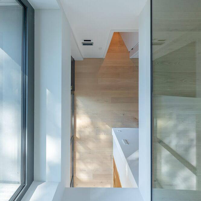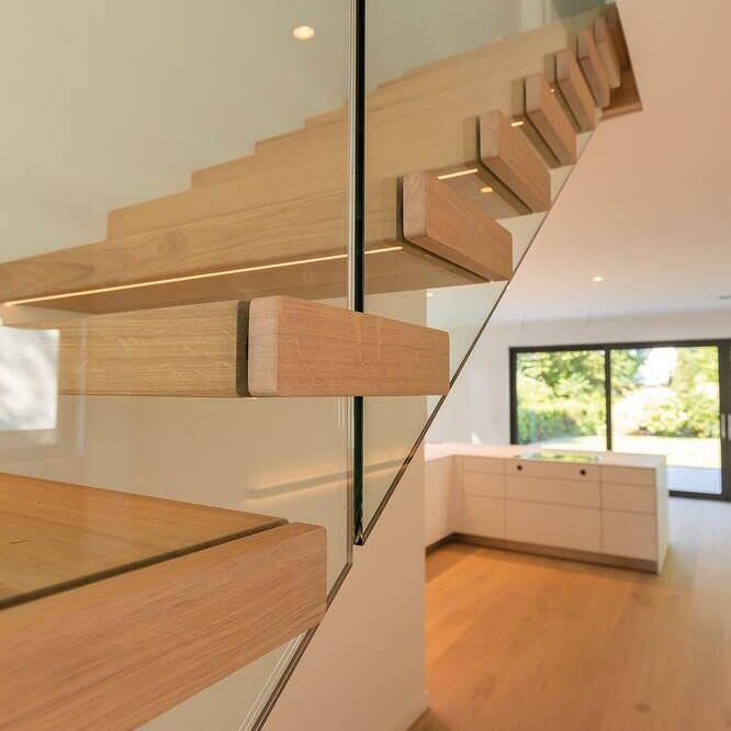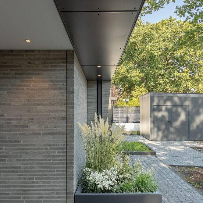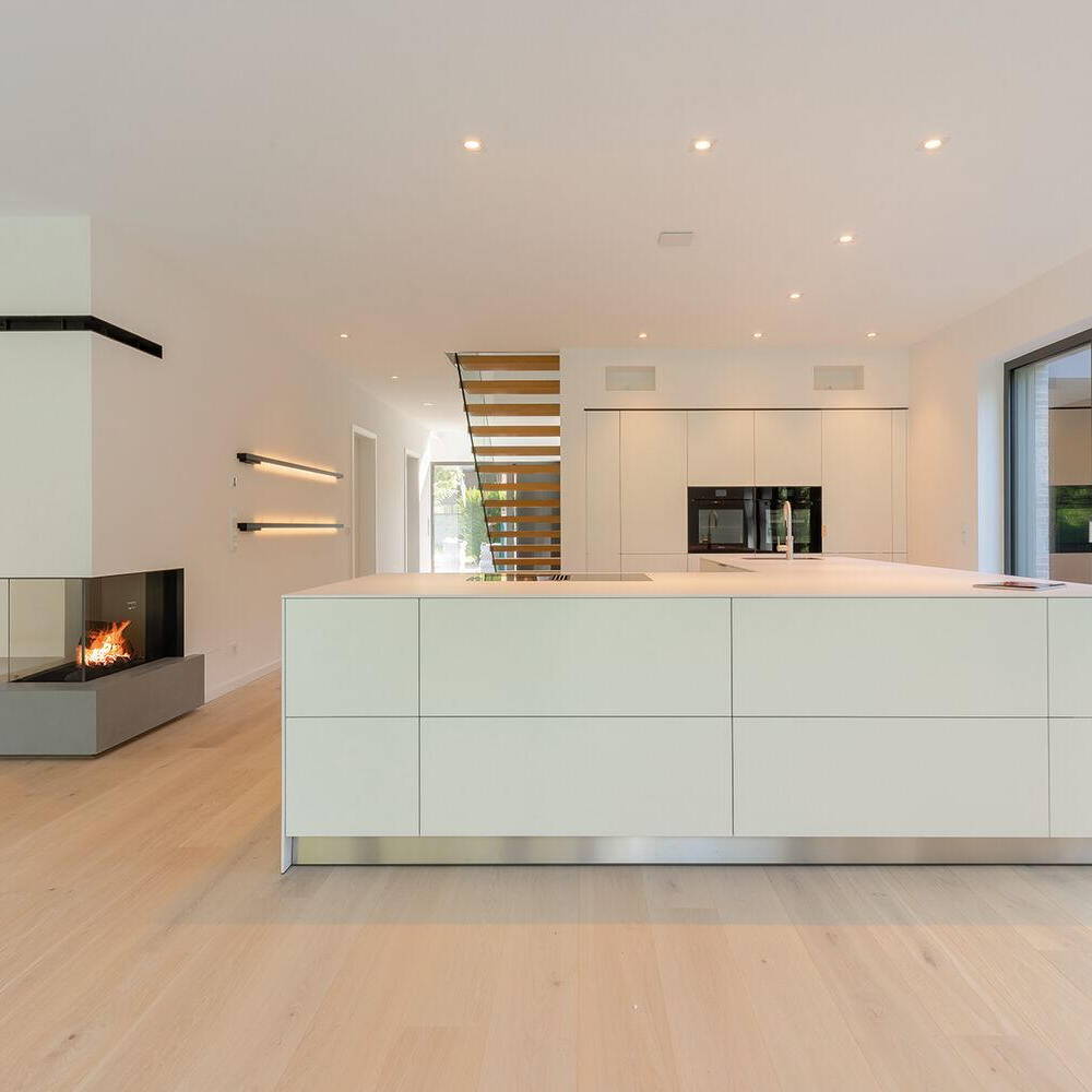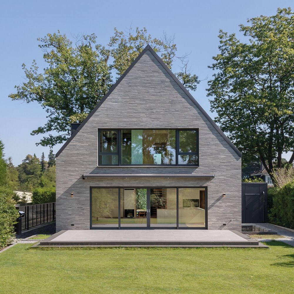 Die Bauherrschaft legte besonderen Wert auf eine moderne Küche als zentrales Element des Hauses, klare Strukturen und viel Licht. Bis ins kleinste Detail wurden innen wie außen hochwertige Materialien und handwerklich perfekte Ausführung aufeinander abgestimmt. Der schmale, langformatige Verblendstein in Grautönen schafft eine lebendige und nachhaltige Fassade und harmoniert perfekt mit den farblich abgestimmten Fenstern, Fallrohren und Dachrinnen aus Aluminium. Die Wohnbereiche sind mit Echtholz-Parkett ausgelegt, die modern gefliesten Bäder erhielten eine exklusive Ausstattung. Das Satteldach ohne Überstand unterstreicht das minimalistische Design des Gebäudes. Die Galerie im Eingangsbereich sorgt für eine helle und offene Atmosphäre gleich beim Betreten des Hauses, während der verglaste Gaskamin im Wohnbereich eine behagliche Wärme schafft. Die Blickachsen im Haus wurden präzise ausgearbeitet, um den Innen- und Außenraum visuell miteinander zu verbinden, Ausblicke ins Grüne zu ermöglichen sowie den Eindruck von Weite und Offenheit zu verstärken. Die freitragende Holztreppe mit dem Glasgeländer ist ein weiteres außergewöhnliches Designelement. Um das architektonische Konzept harmonisch abzurunden, wurde die stilvolle Innenausstattung von Interior Designerin Kristina Krause begleitet.