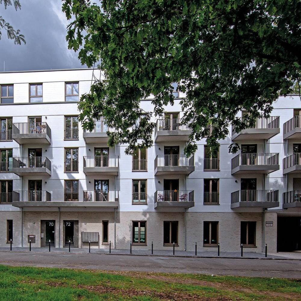Der moderne, fünfgeschossige Neubau umfasst 44 barrierefreie Wohneinheiten mit Balkon, deren Größen von 46 m² bis knapp 125 m² im Staffelgeschoss reichen – geeignet für Paare und Singles. Zusätzlich befinden sich drei Gewerbeeinheiten im Erdgeschoss. Letztere beherbergen eine Community Area als zentralen Anlaufpunkt für Bewohner:innen, eine Tagespflege sowie eine Physiotherapiepraxis. Beim Bau standen nachhaltige Aspekte und die Lebensqualität der Bewohner:innen im Vordergrund. Begrünte Dachflächen, eine Photovoltaikanlage sowie ein großzügig gestalteter Innenhof mit Grünflächen betonen den ökologischen Anspruch. Auf den Dachterrassen und in den gemeinschaftlich nutzbaren Außenbereichen finden die Bewohner:innen Erholung und sozialen Anschluss. Das Gebäude mit rund 5.000 m² Geschossfläche kombiniert zeitlose Eleganz mit funktionaler Architektur. Die fünfte Etage ist als Staffelgeschoss ausgebildet, was dem Baukörper eine leichte Qualität verleiht. Die hell verputzte Fassade, horizontal gegliederte Bänder und das durch Klinkerriemchen akzentuierte Erdgeschoss setzen bei dem Ensemble klare, hochwertige Akzente.
