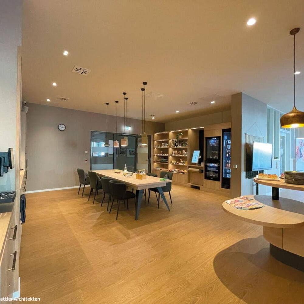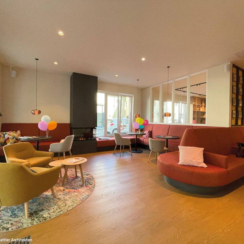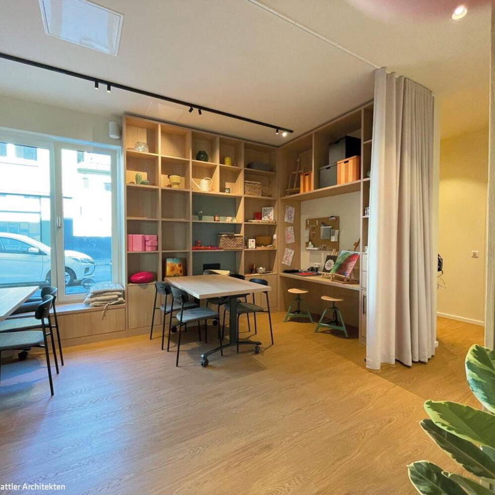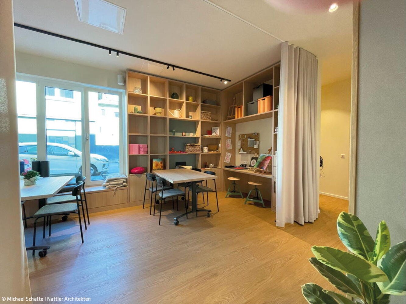 Die Community-Area im Erdgeschoss präsentiert sich mit großen, teils bodentiefen Fenstern lichtdurchflutet. Der großzügige Aufenthaltsbereich ist in verschiedene Zonen mit vielfältigen Sitzmöglichkeiten gegliedert. Die warmen Farben des Bodens und des Mobiliars schaffen wohnzimmerähnliche Wärme und Behaglichkeit. Die oberen Etagen sind über Treppenhäuser und Aufzüge erreichbar. Ebenso wie die öffentlichen Flächen des Gebäudes sind auch die Wohnungen barrierefrei ausgestattet, sodass Menschen mit unterschiedlichen Behinderungen oder Beeinträchtigungen den Wohnraum selbstständig und ohne Hindernisse nutzen können. Breite Türen, großzügige Flure und Aufzüge für Rollstuhlfahrer:innen sowie barrierefreie Sanitäranlagen gewährleisten die Nutzung ohne Mobilitätseinschränkung. Im unterkellerten Gebäude befinden sich die Tiefgarage mit 18 Pkw-Stellplätzen, die für E-Mobilität vorgerüstet sind sowie Fahrradstellplätze, Haustechnik- und Abstellräume. Weitere 14 Pkw-Stellplätze, davon drei für Menschen mit Behinderungen, befinden sich oberirdisch. Die Wärmeversorgung erfolgt durch Fernwärme, Ergänzend ist eine Photovoltaikanlage installiert.