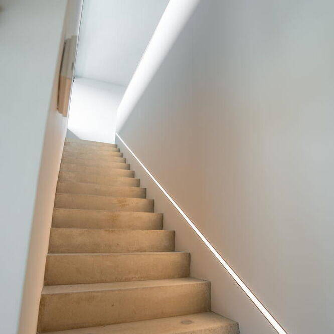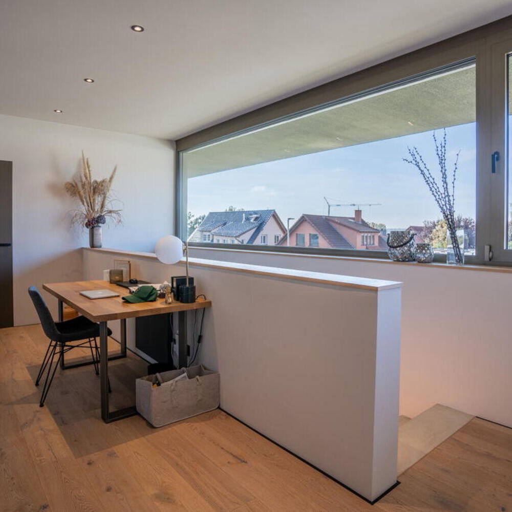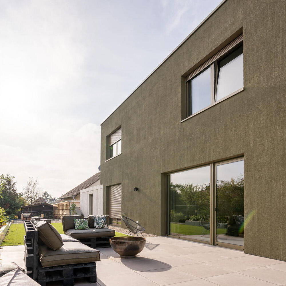 Dieser Wunsch stellte jedoch eine besondere Herausforderung dar, denn das Umfeld des Grundstücks in Lörzweiler/Rheinhessen ist von konventioneller Bebauung mit Satteldachhäusern geprägt und die Nachbarschaft sollte nicht mit einer zu progressiven Formensprache herausgefordert werden. Dennoch ist ein minimalistischer Blickfang entstanden. Dessen Gestaltung drückt die Unkonventionalität der Bauherren aus: Anstatt einer neutralen Farbpalette in Schwarz-Weiß prägen Farbe und Mut zum Statement das markante, aus Poroton errichtete Gebäude. Der Baukörper mit skulpturaler Kubatur wird von einer ocker-, im Sonnenlicht goldfarben anmutenden Fassade umhüllt, die in Vertikal-Besenstrichputz ausgeführt wurde. Es gelang, ein Wohnhaus zu schaffen, in dem das Licht bestmöglich eingefangen wird. Das Haus öffnet sich an der Frontseite zum Garten hin: Im vorkragenden Erdgeschoss – das wie das Obergeschoss großflächig verglast ist – sind Wohnen und Kochen verortet.