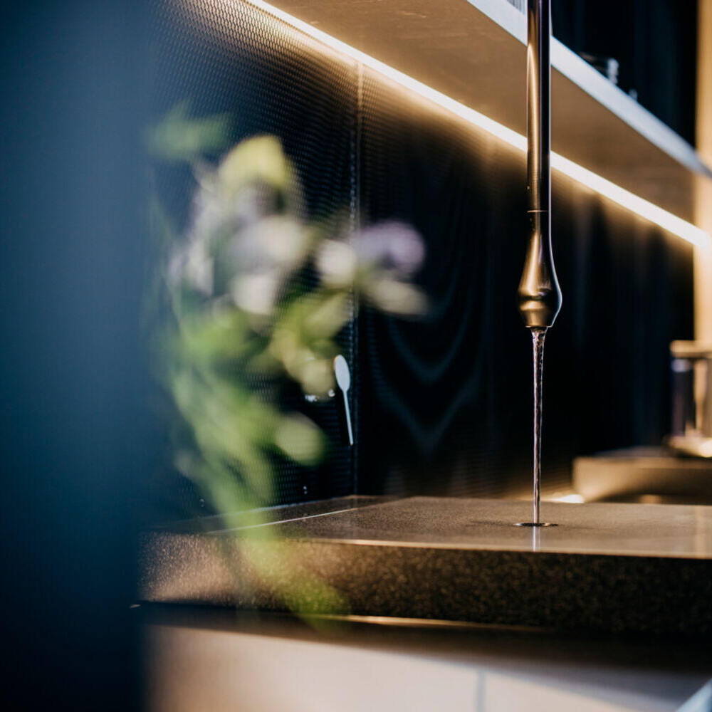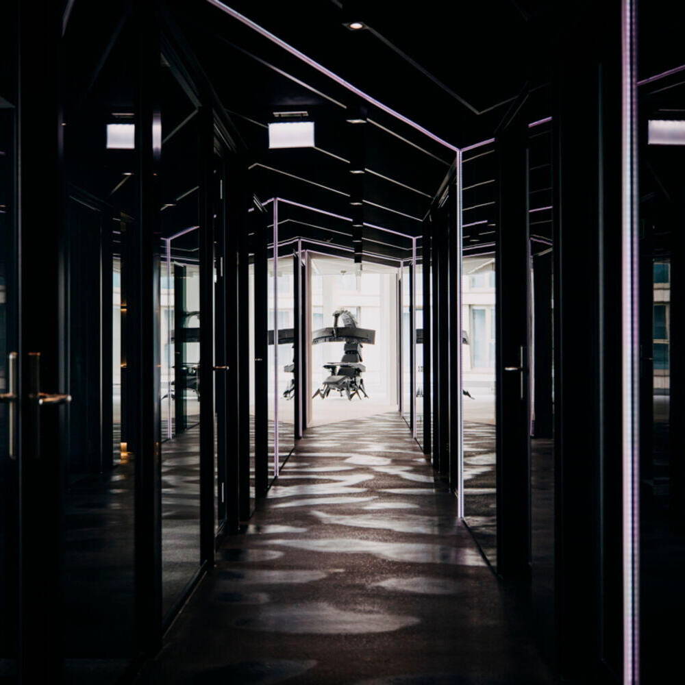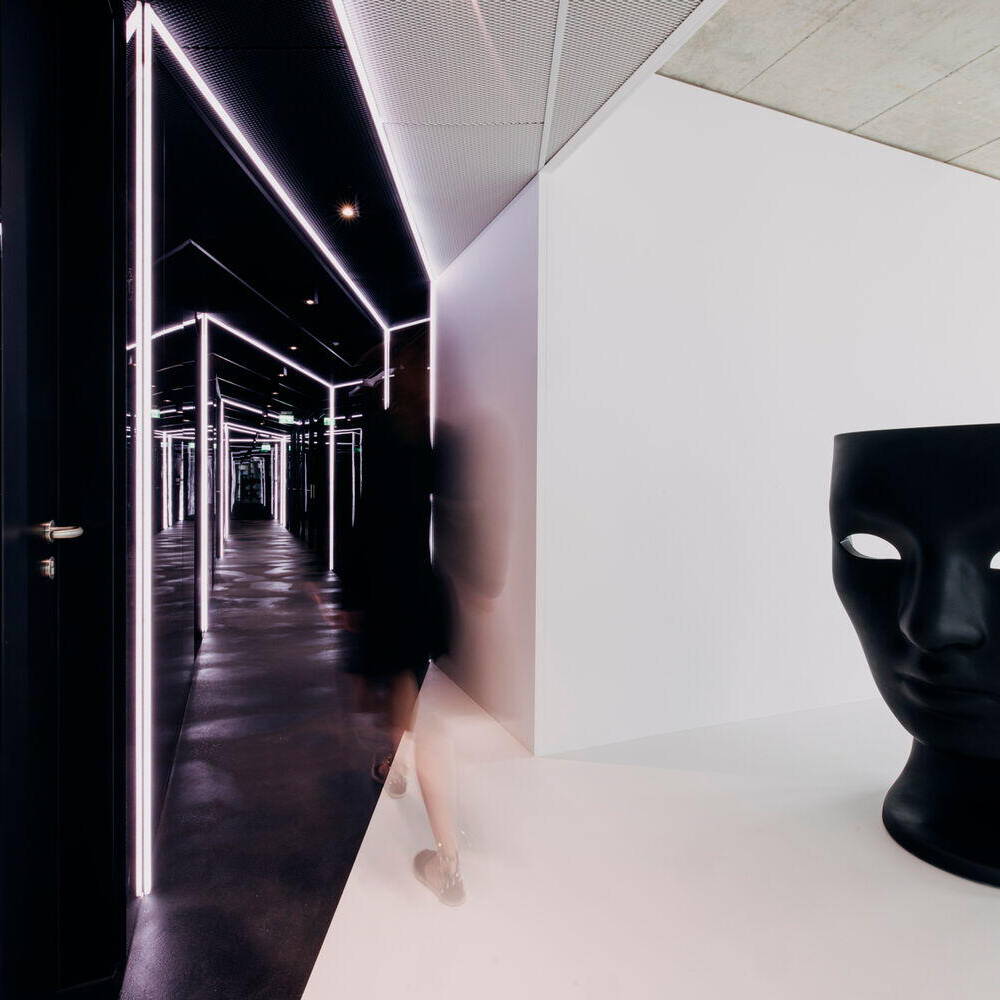 Die Etage gliedert sich in fünf Zonen. In der „RedZone“, dem Bereich des „Redteams“, der Angreifer, reihen sich Ton-in-Ton gefärbte Meetingräume. Monochrome Bordeaux-Töne, akustisch wirksame Wandbespannungen und eine Metallkassettendecke dominieren den Raumeindruck. Ein Nass-Effekt-Boden verstärkt die technisch-mystische Atmosphäre. Die Farbstimmung kann individuell über RGB-Beleuchtung gesteuert werden. Getönte Spiegelflächen und der Boden verwischen Grenzen und erzeugen einen Infinity-Effekt. Das „Hacker Cinema“ mit drei großen Monitoren ist der Ort für Wissens-transfer, Veranstaltungen und Vorträge. Die strahlenförmige LED-Inszenierung und ein drehbarer Maskenstuhl betonen die Themen Anonymität und Inszenierung. Eine versteckte „Backdoor“ führt in die „GreenZone“, eine organisch geformte Rückzugslandschaft aus üppigem Grün und topografisch modellierten Flächen. Spiegelwände erzeugen eine optische Unendlichkeit, die Natur wird zur Illusion und zum Gegenpol der technologisch geprägten Umgebung. In der „WhiteZone“ arbeiten Anfänger:innen, die sogenannten „n00bs“, in einem komplett weißen Raum mit fugenlosem Boden. Die minimalistische Lichtführung und der futuristische Scorpion-Chair schaffen eine experimentelle Lernumgebung. Dagegen ist die „InvisibleZone“, den APTs, hochspezialisierten Angreifenden, vorbehalten, die wie „digitale Ninjas“ im Dunkeln agieren. Entsprechend wurde deren Bereich gestaltet: Ein anonymes Umfeld mit schwarzem Nasseffekt-Boden, in dem Hacker in Einzel- und Zweierbüros arbeiten. Hochglanzwände und die rahmenartige Anordnung der LEDs erzeugen einen Infinity-Look, der das weltweite Netz und die Fenster zur digitalen Welt widerspiegelt. Die „InvisibleZone“ wurde ausgebaut; die übrigen Zonen werden bis 2025/2026 fertiggestellt sein.