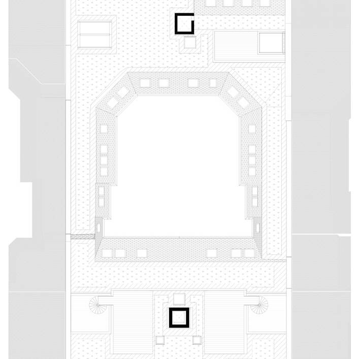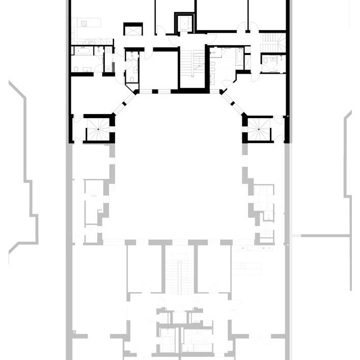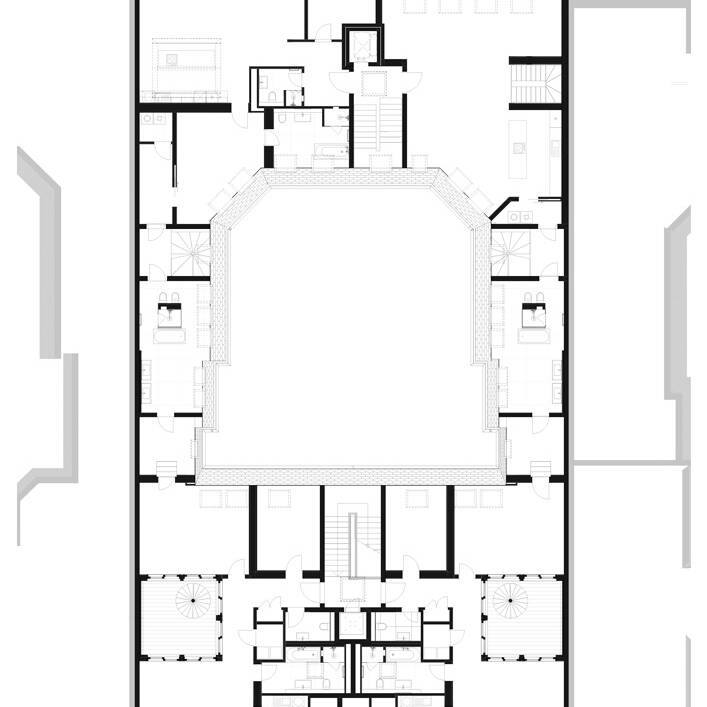 Während das Gartenhaus eine neue innenliegende Aufzugsanlage sowie Balkone erhielt, wurden die Freianlagen komplett neu gestaltet und alle Fenster durch Holz-Aluminiumfenster ersetzt. Das Großprojekt begegnete besonderen Herausforderungen, wie der bewohnte Bestand, städtebauliche Auflagen und der Belichtung der Wohnungen aufgrund der großen Gebäudetiefe des Vorderhauses. So durfte die Dachfläche nur eingeschränkt mit Fenstern perforiert werden. Um dennoch eine gute Belichtung der tiefen Räume der Dachgeschosswohnungen im Vorderhaus zu erreichen, wurden in der Gebäudemitte dreiseitig verglaste Atrien eingefügt. Diese sorgen dafür, dass die großen Wohnräume beidseitig belichtet werden. Innerhalb der Wohnzimmer haben die Bewohner:innen nun einen direkten Bezug zum Außenbereich, wobei von den Atrien Treppen auf die Aufdachterrassen führen. „Unserer Leitidee folgend ist es uns gelungen, den historischen Gebäudecharakter auch in den neuen Geschossen erlebbar zu machen und zugleich moderne Wohnungen nach aktuellen Standards zu schaffen“, resümiert Laute.