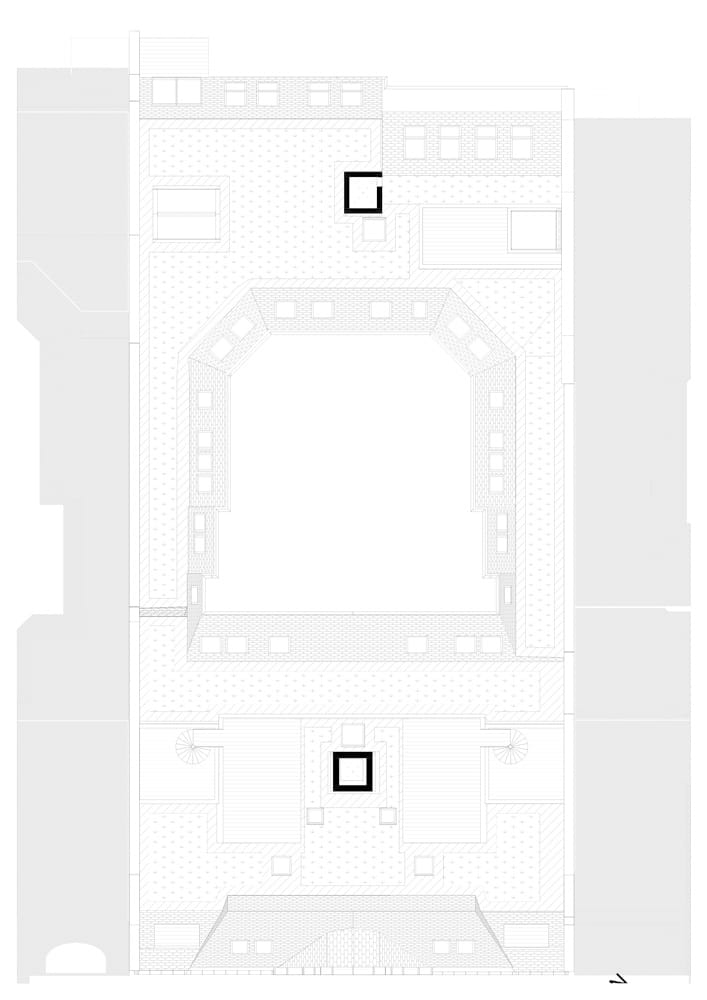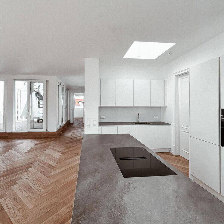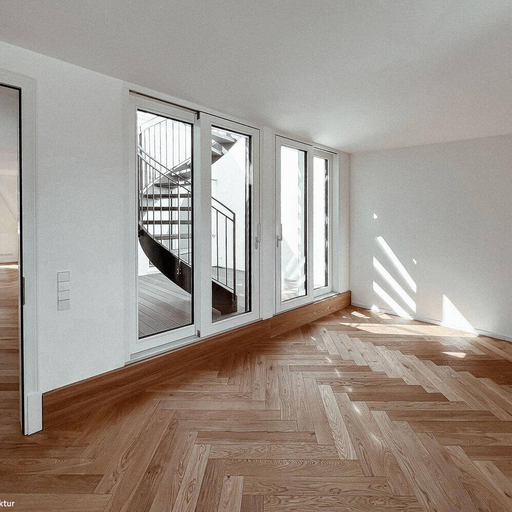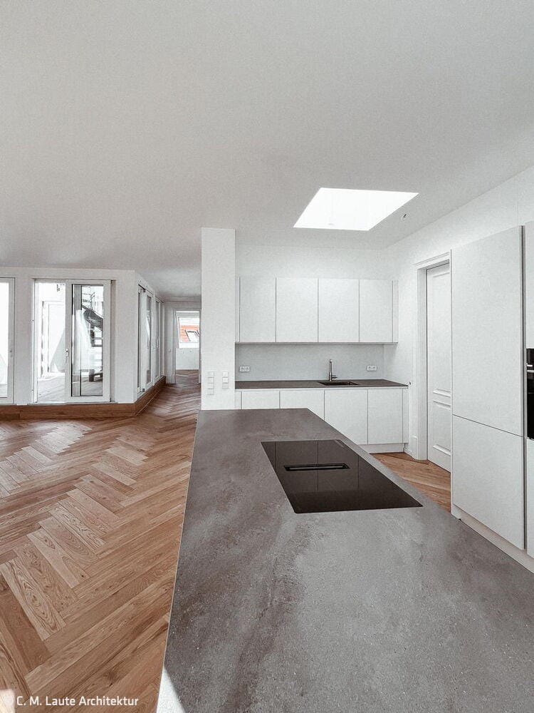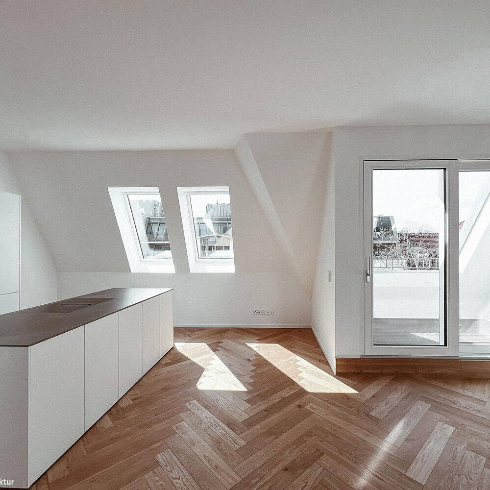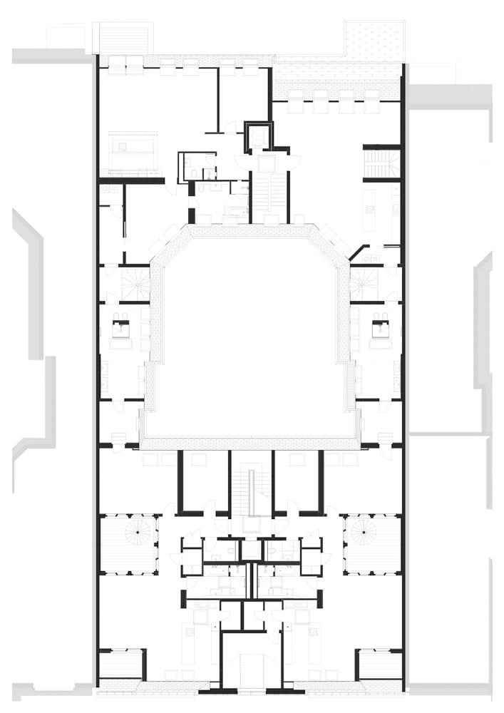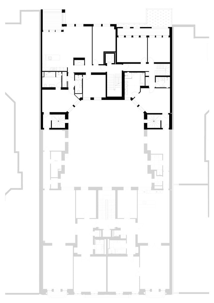 Während das Gartenhaus eine neue innenliegende Aufzugsanlage sowie Balkone erhielt, wurden die Freianlagen komplett neu gestaltet und alle Fenster durch Holz-Aluminiumfenster ersetzt. Das Großprojekt begegnete besonderen Herausforderungen, wie der bewohnte Bestand, städtebauliche Auflagen und der Belichtung der Wohnungen aufgrund der großen Gebäudetiefe des Vorderhauses. So durfte die Dachfläche nur eingeschränkt mit Fenstern perforiert werden. Um dennoch eine gute Belichtung der tiefen Räume der Dachgeschosswohnungen im Vorderhaus zu erreichen, wurden in der Gebäudemitte dreiseitig verglaste Atrien eingefügt. Diese sorgen dafür, dass die großen Wohnräume beidseitig belichtet werden. Innerhalb der Wohnzimmer haben die Bewohner:innen nun einen direkten Bezug zum Außenbereich, wobei von den Atrien Treppen auf die Aufdachterrassen führen. „Unserer Leitidee folgend ist es uns gelungen, den historischen Gebäudecharakter auch in den neuen Geschossen erlebbar zu machen und zugleich moderne Wohnungen nach aktuellen Standards zu schaffen“, resümiert Laute.