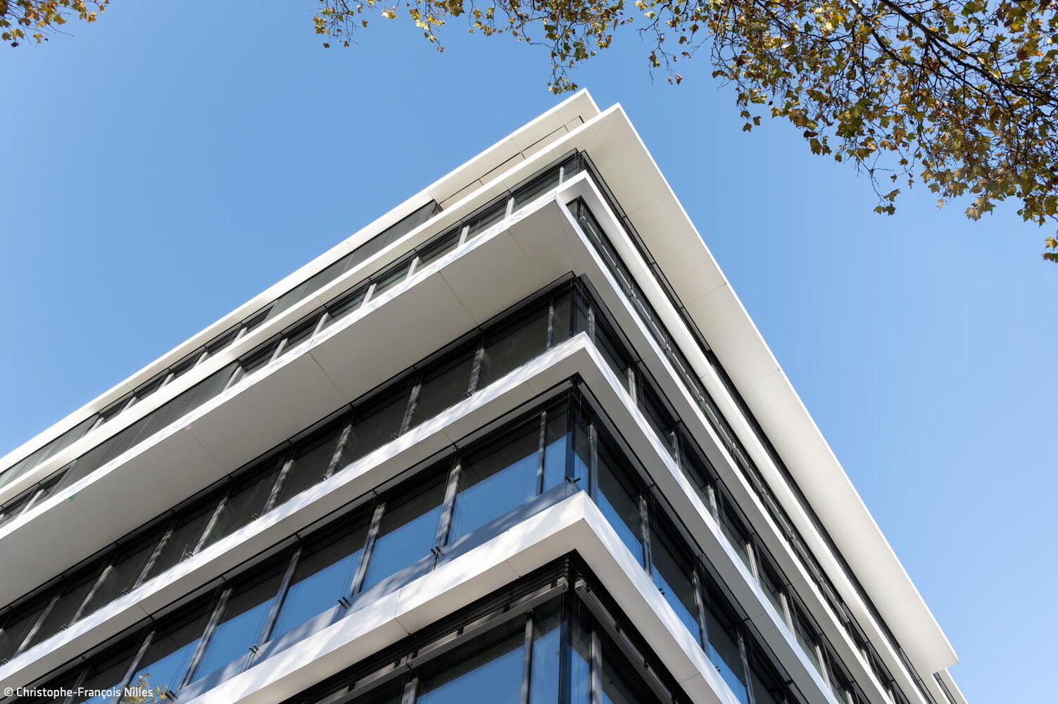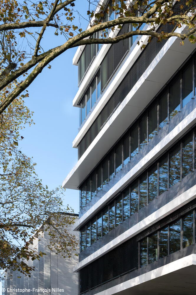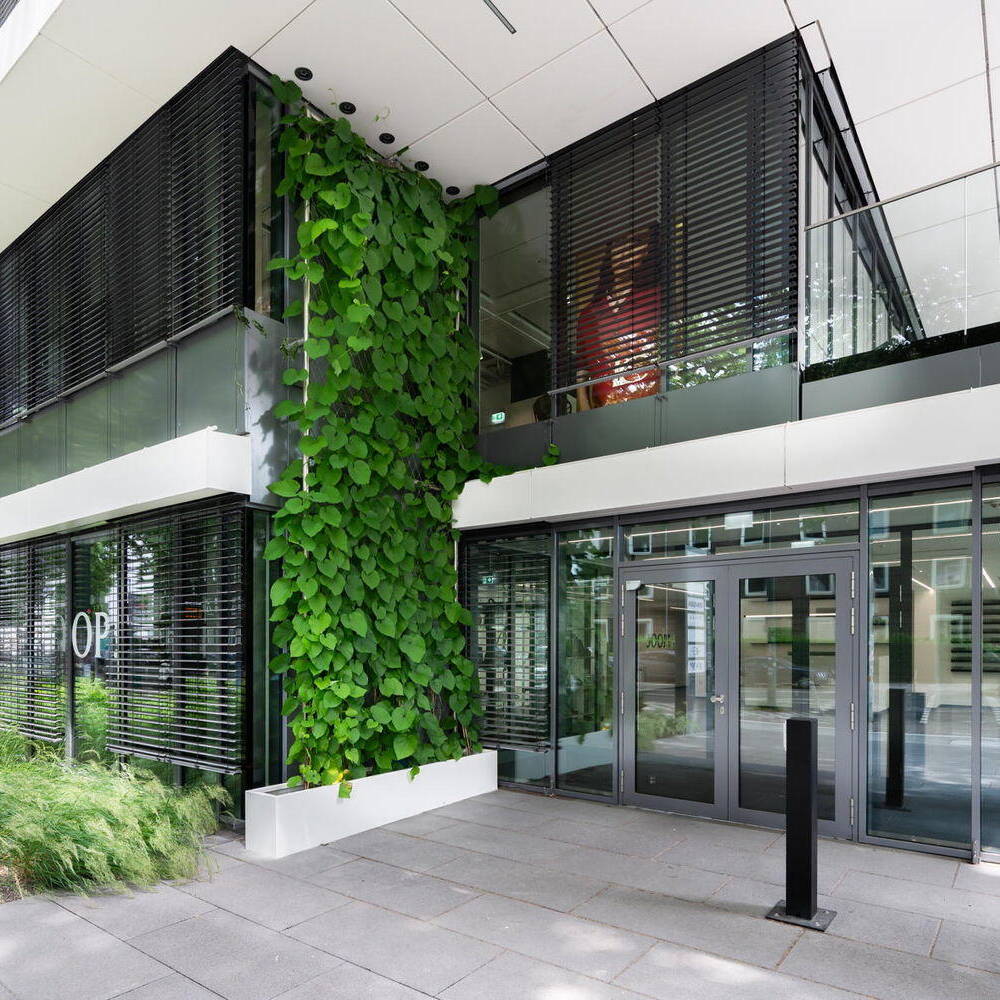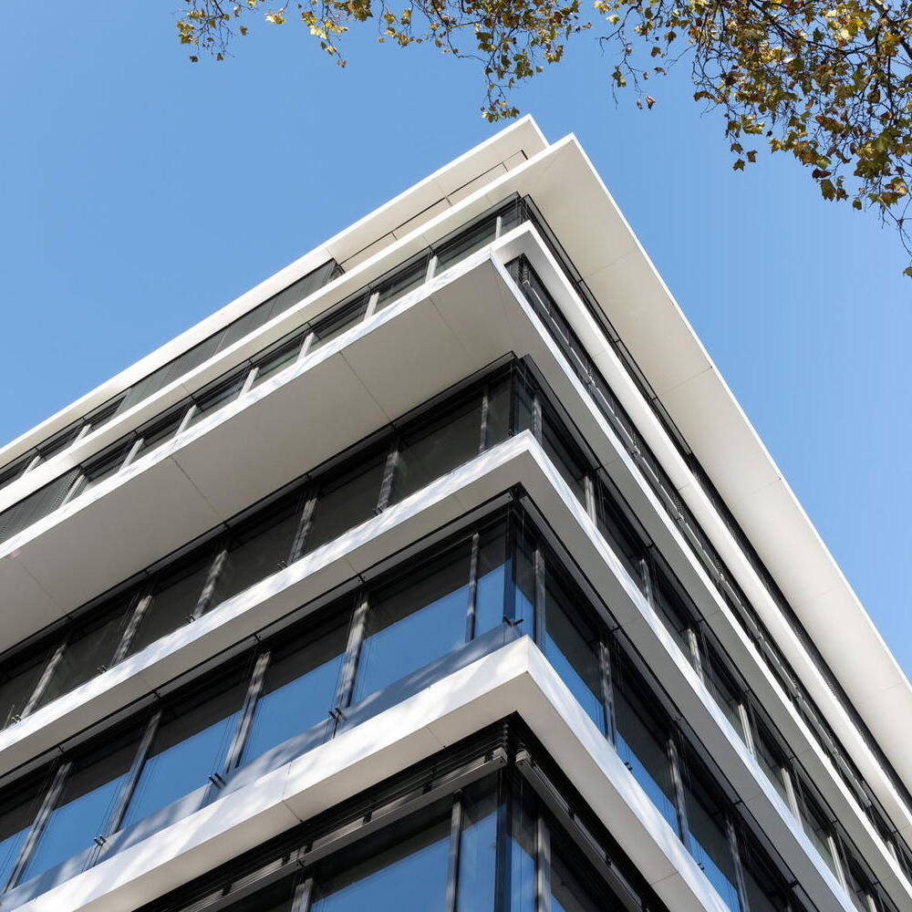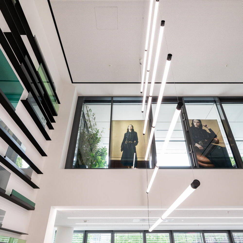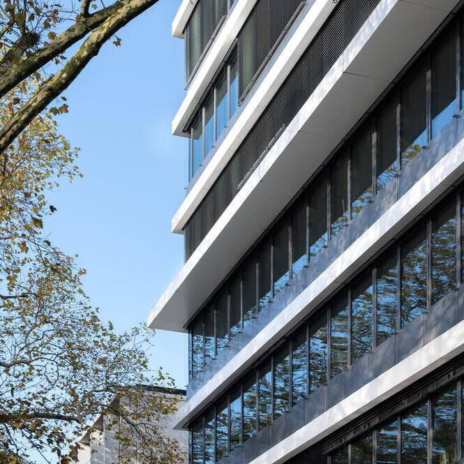 Das Gebäude, das 1974 errichtet worden war, zeigte deutliche Spuren der Alterung: Nicht nur wegen seiner kühlen, verspiegelten Fassade wirkte es überholt, auch technisch und energetisch hatte es bereits den Zenit der Nutzbarkeit überschritten. Statt eines vollständigen Rückbaus wurde das tragende Betonskelett erhalten und somit eine ordentliche Portion „grauer Energie“ reduziert. Allein durch den Verzicht auf Rückbau und die Weiternutzung des vorhandenen Tragwerks konnte die Höhe der CO₂-Emissionen auf einem deutlich niedrigeren Level als bei einem vergleichbaren Ersatzneubau gehalten werden. Entsprechend hat das Gebäude das Nachhaltigkeitszertifikat LEED-Gold erhalten. Die hermetisch verspiegelte Fassade der „New Fashion Plaza“ ist dabei einer eleganten, energetisch optimierten Glasfassade mit außenliegendem Sonnenschutz gewichen. Die weißen Geschossbänder und die plastisch auskragenden Terrassen vermitteln Leichtigkeit und Offenheit, während die Terrasseneinschnitte auf der zweiten, fünften und siebten Etage den Mietern als begrünte Außenbereiche mit Ausblick dienen. Das neugestaltete Entrée empfängt Besucher:innen mit einer vertikalen Fassadenbegrünung und einem zentralen, über zwei Etagen geführten Luftraum.