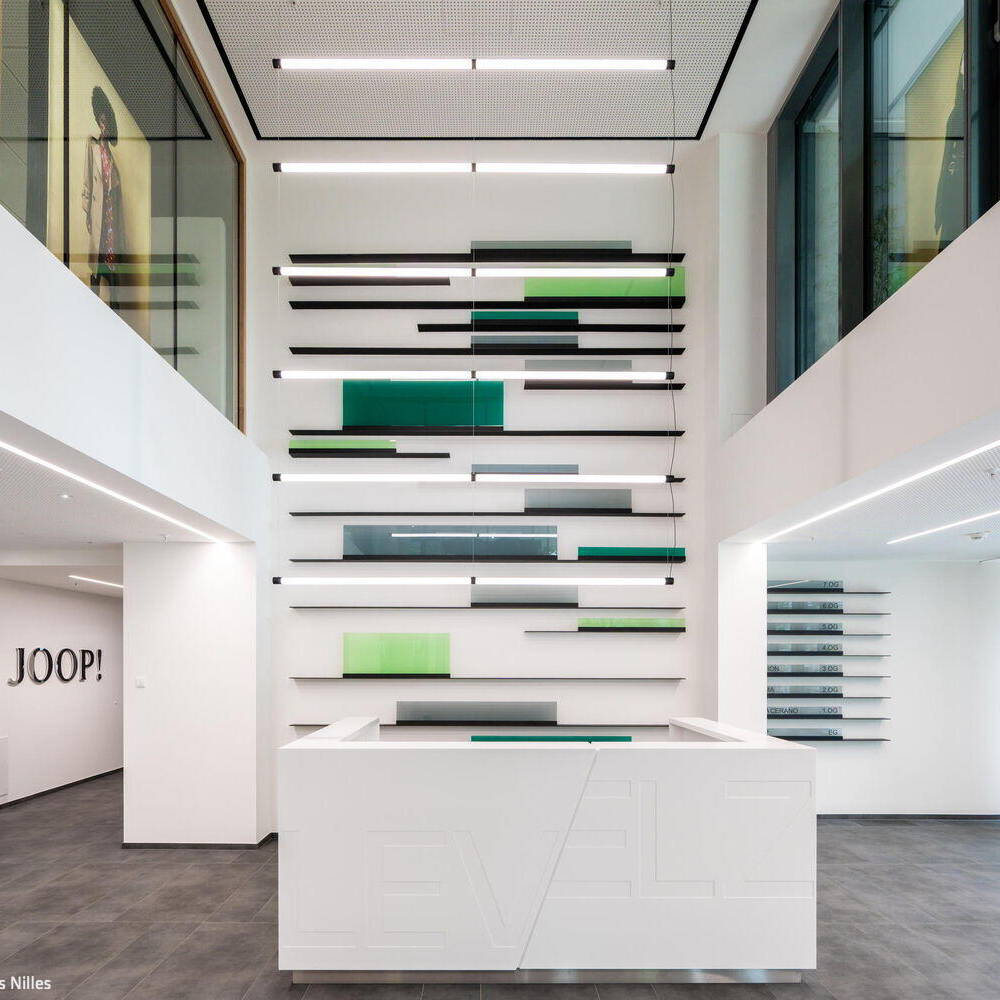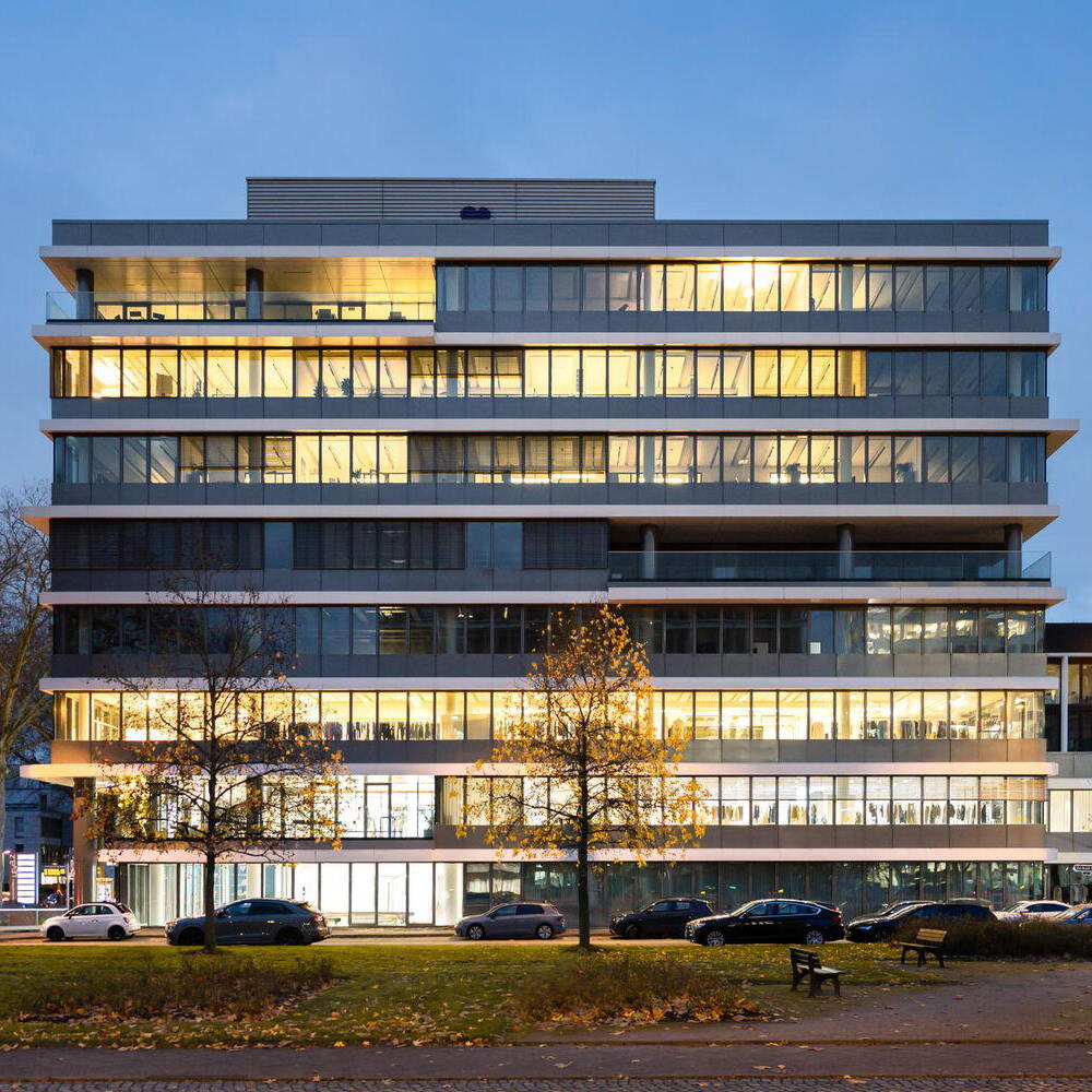 Hochwertige Fliesenböden unterstreichen die repräsentative Atmosphäre des Eingangsbereichs. Während das Erdgeschoss des Gebäudes auch weiterhin mehrere Showrooms beherbergt, stehen die darüber liegenden Etagen primär Büronutzungen zur Verfügung. Die Büroflächen entsprechen dabei zeitgemäßen Anforderungen an Ergonomie, Lichtqualität und Akustik. Mit Deckenhöhen von drei Metern bieten sie Raum für agiles und kollaboratives Arbeiten in vielseitigen Raumkonzepten. Auch in puncto nachhaltige Mobilität hat das Gebäude aufgerüstet: In der Tiefgarage auf beiden Untergeschossen stehen zusätzlich zu den 54 PKW- über 30 Fahrradstellplätze zur Verfügung.