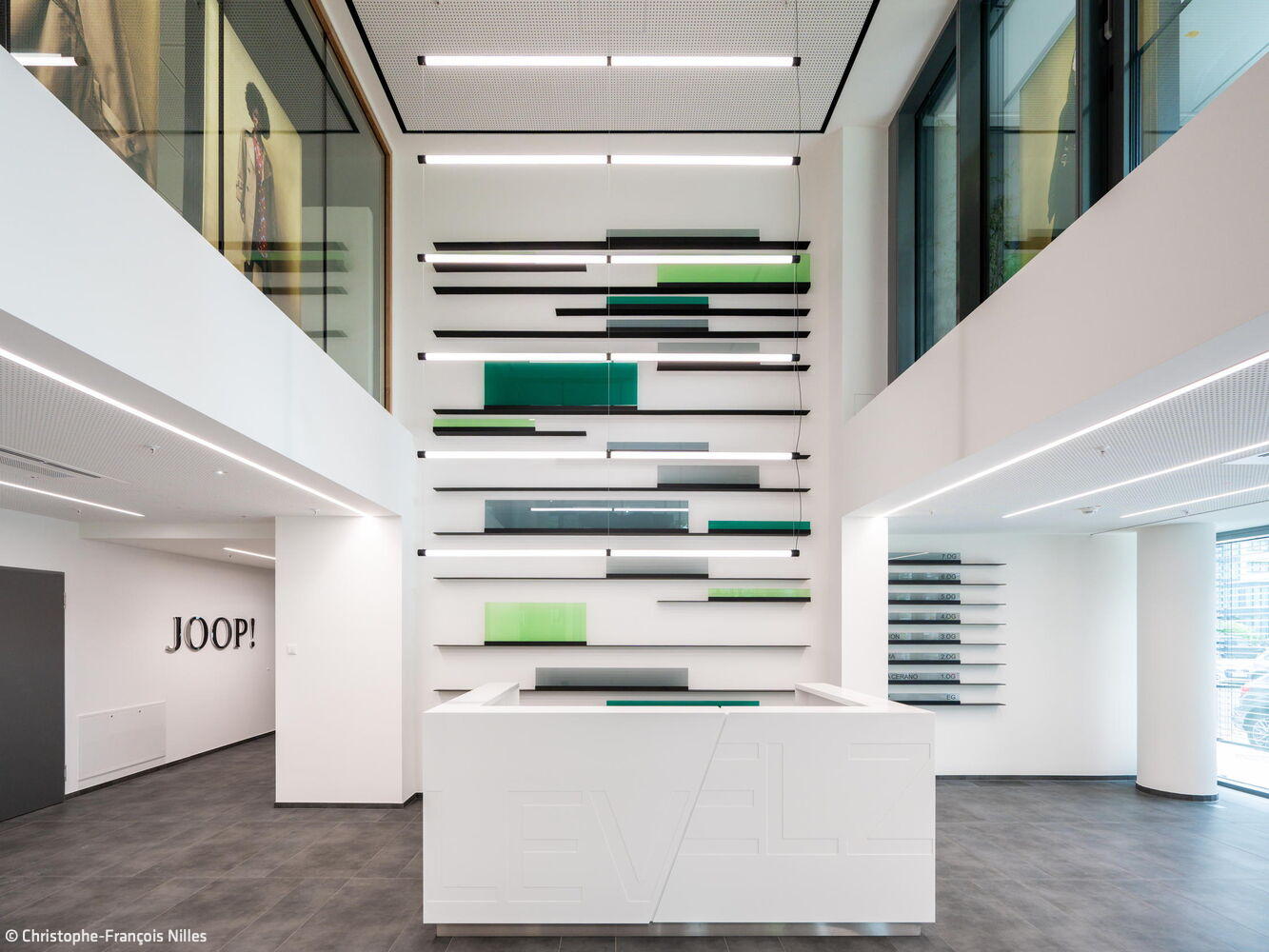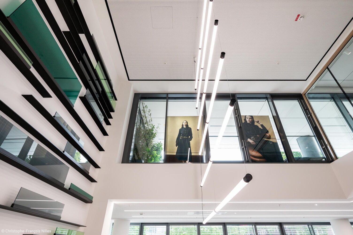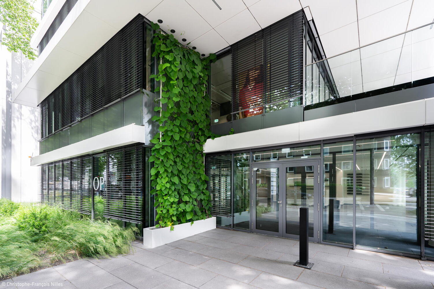 Das Gebäude, das 1974 errichtet worden war, zeigte deutliche Spuren der Alterung: Nicht nur wegen seiner kühlen, verspiegelten Fassade wirkte es überholt, auch technisch und energetisch hatte es bereits den Zenit der Nutzbarkeit überschritten. Statt eines vollständigen Rückbaus wurde das tragende Betonskelett erhalten und somit eine ordentliche Portion „grauer Energie“ reduziert. Allein durch den Verzicht auf Rückbau und die Weiternutzung des vorhandenen Tragwerks konnte die Höhe der CO₂-Emissionen auf einem deutlich niedrigeren Level als bei einem vergleichbaren Ersatzneubau gehalten werden. Entsprechend hat das Gebäude das Nachhaltigkeitszertifikat LEED-Gold erhalten. Die hermetisch verspiegelte Fassade der „New Fashion Plaza“ ist dabei einer eleganten, energetisch optimierten Glasfassade mit außenliegendem Sonnenschutz gewichen. Die weißen Geschossbänder und die plastisch auskragenden Terrassen vermitteln Leichtigkeit und Offenheit, während die Terrasseneinschnitte auf der zweiten, fünften und siebten Etage den Mietern als begrünte Außenbereiche mit Ausblick dienen. Das neugestaltete Entrée empfängt Besucher:innen mit einer vertikalen Fassadenbegrünung und einem zentralen, über zwei Etagen geführten Luftraum.