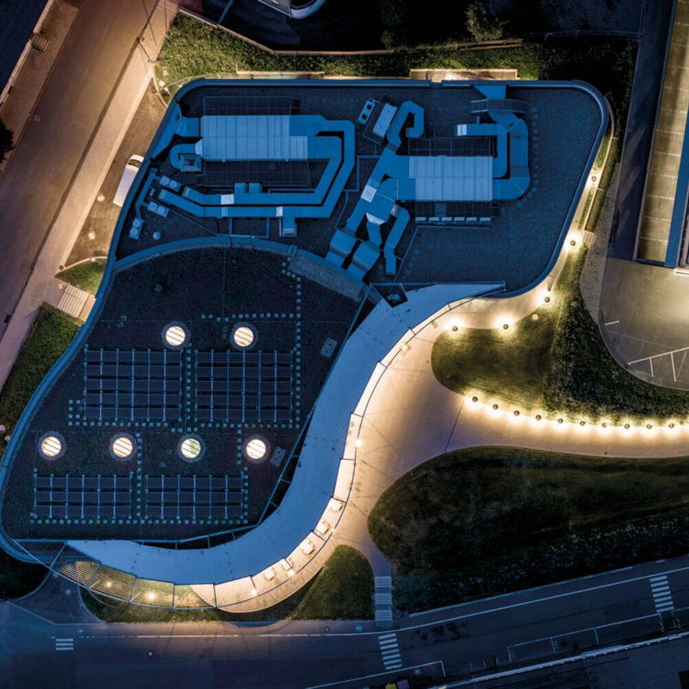 Die zum Werk hin begrünte Terrasse ist nicht nur Gestaltungselement, sondern erfüllt auch technische Aufgaben. Zusammen mit der Dachbegrünung hält sie Regenwasser zurück und lässt es langsamer abfließen. Zugleich ist letztere die natürliche Dämmschicht, die das Gebäude im Sommer gegen Hitze und im Winter vor Kälte schützt und isoliert. Selbstverständlich ist auch die Haustechnik des Gebäudes nach aktuellen energetischen Richtlinien geplant: Die Hybrid-Heizungswärmeanlage basiert auf einer Wärmepumpe, einer Lüftungsanlage und einer stromgenerierenden PV-Anlage. Alle Räume lassen sich bequem mechanisch be- und entlüften. Der sommerliche Wärmeschutz erfolgt zusätzlich zur wärmeisolierten Fassade über das verschattende Vordach, die Sonnenschutz-Verglasung und die außenliegenden Sonnenschutzjalousien. Für darüber hinausgehende Kühlung sorgt im Sommer eine zentrale Lüftungsanlage