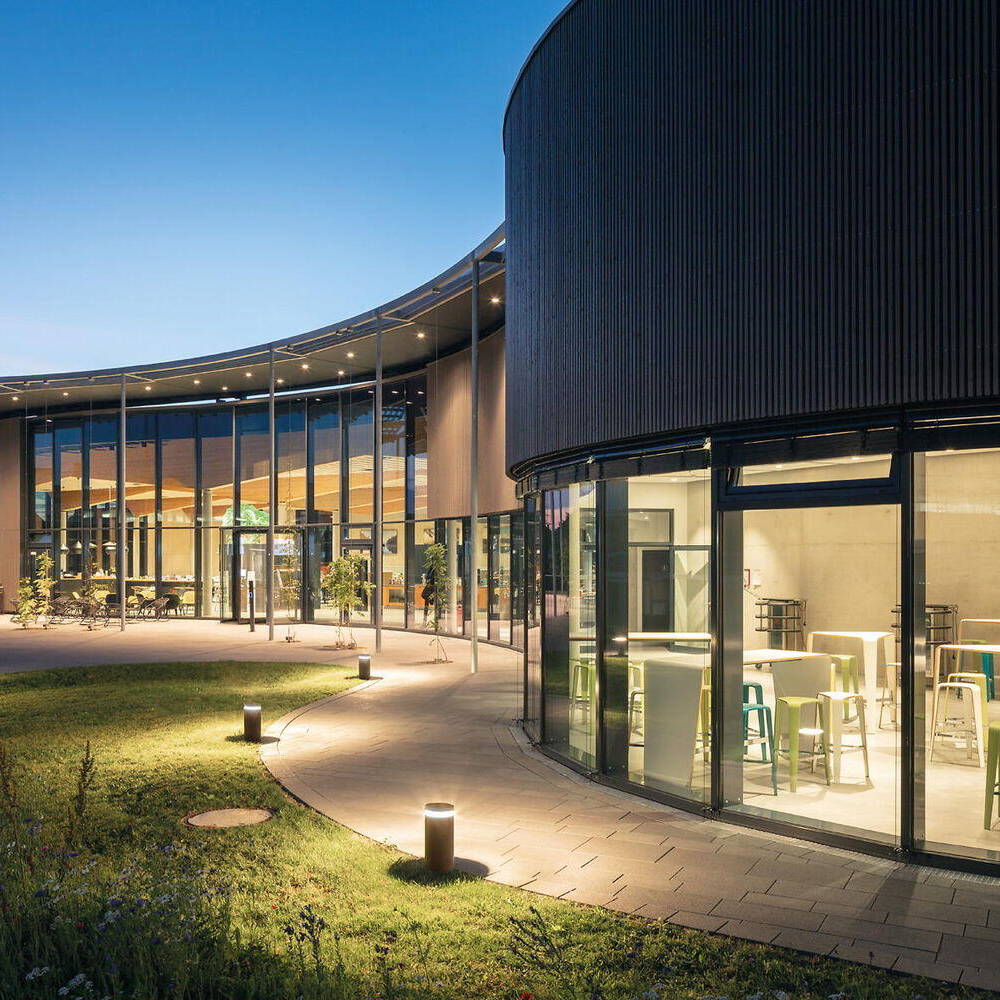 Durch den Rückbau der in die Jahre gekommener Gebäude mit Betriebswohnungen wurde der Platz für ein neues Betriebsrestaurant frei. Die bestehende Betriebskantine war nicht mehr zeitgemäß und wurde zu Lagerflächen umgenutzt. Entstehen sollte auf dem Grundstück eine Wohlfühloase für alle 4.500 Mitarbeitenden mit ansprechendem Zugang und einer ausreichenden Erschließung von der Straße aus für die Anlieferung der Lebensmittel. Das neue Betriebsgebäude springt durch seine ungewöhnliche Formensprache sofort ins Auge: Die amorphe Form wirkt auflockernd, setzt sich in Szene und bildet einen Kontrast zur geradlinigen Werksarchitektur. Zur Straße hin geschlossen, öffnet sich die leichte Freiform des Gebäudes in eine ausdrucksstark geschwungene Pfosten-Riegel-Fassade zu den Werksanlagen nach Süden. Die nachhaltige und kosteneffiziente Holzbinderkonstruktion überspannt den großzügigen Raum des Betriebsrestaurants mit vergleichsweise wenigen Stahlstützen. Die Fassade des Gebäudes ist größtenteils verglast, umfasst aber auch geschlossene Bereiche. Die natürlichen Holzlamellen werden dabei durch eine schwarz unterlegte Wärmedämmung besonders hervorgehoben. Der zentrale Zugang zum Betriebsrestaurant führt ins Zentrum des gastronomischen Raumes und zum benachbarten Konferenzbereich. Besucher:innen wird das gesamte Angebot des Restaurants großzügig präsentiert während Versorgungs-, Lager-, Küchen- und Serviceräume dem Blick verborgen bleiben.
