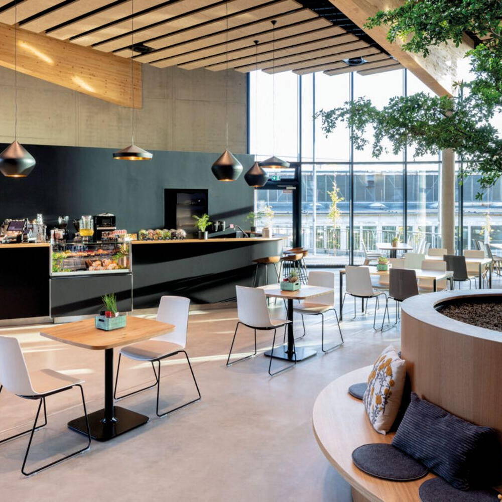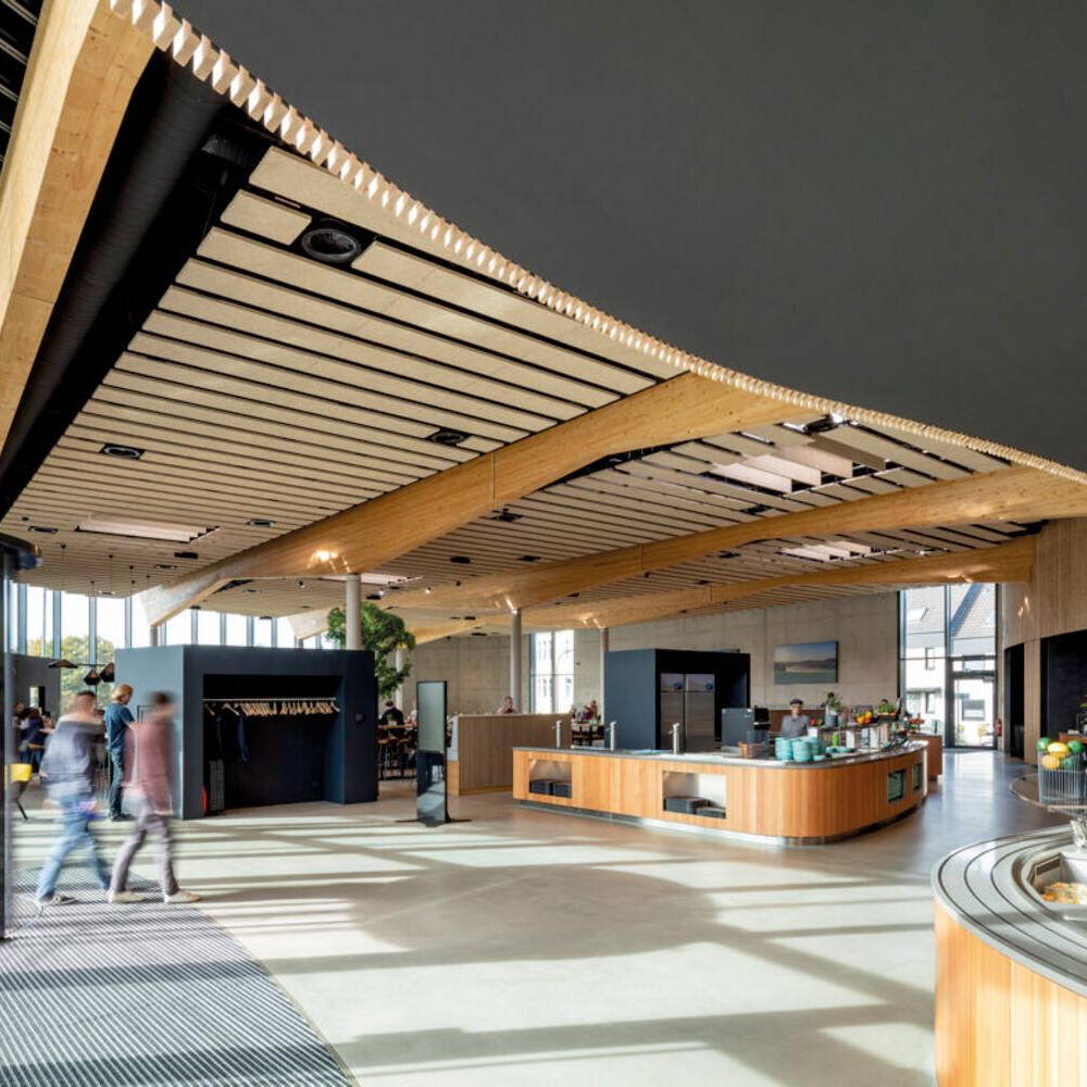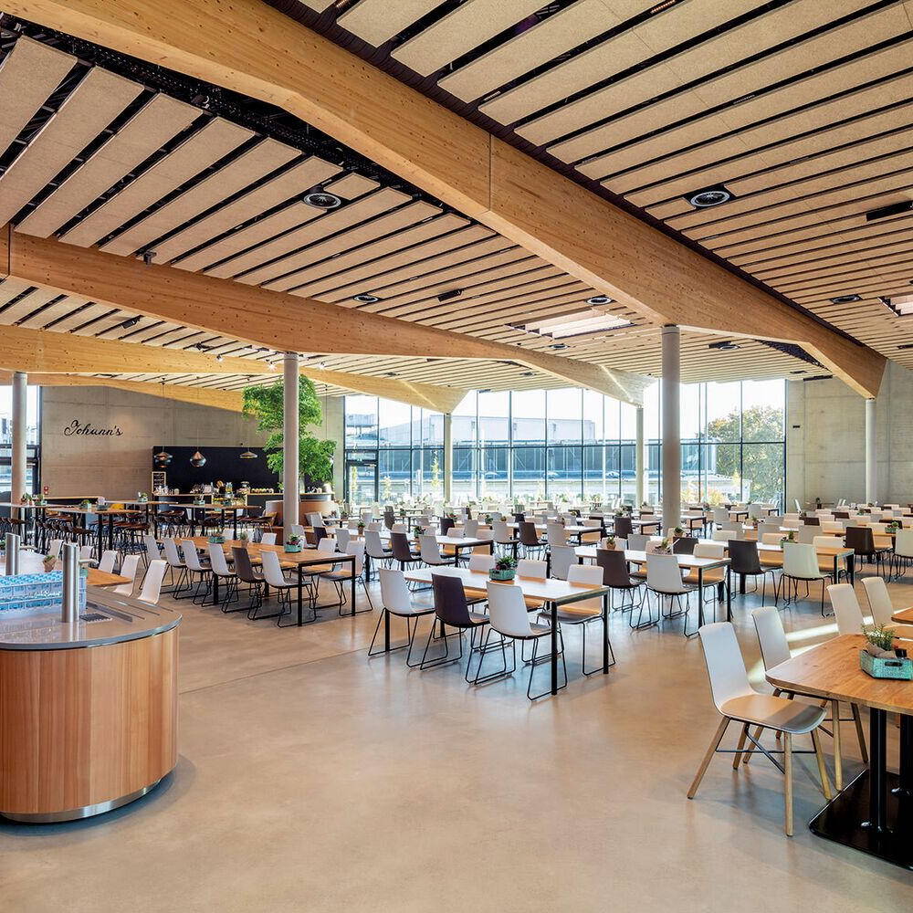 Ein neues Betriebsrestaurant setzt auf Holz und geschwungene Formen
