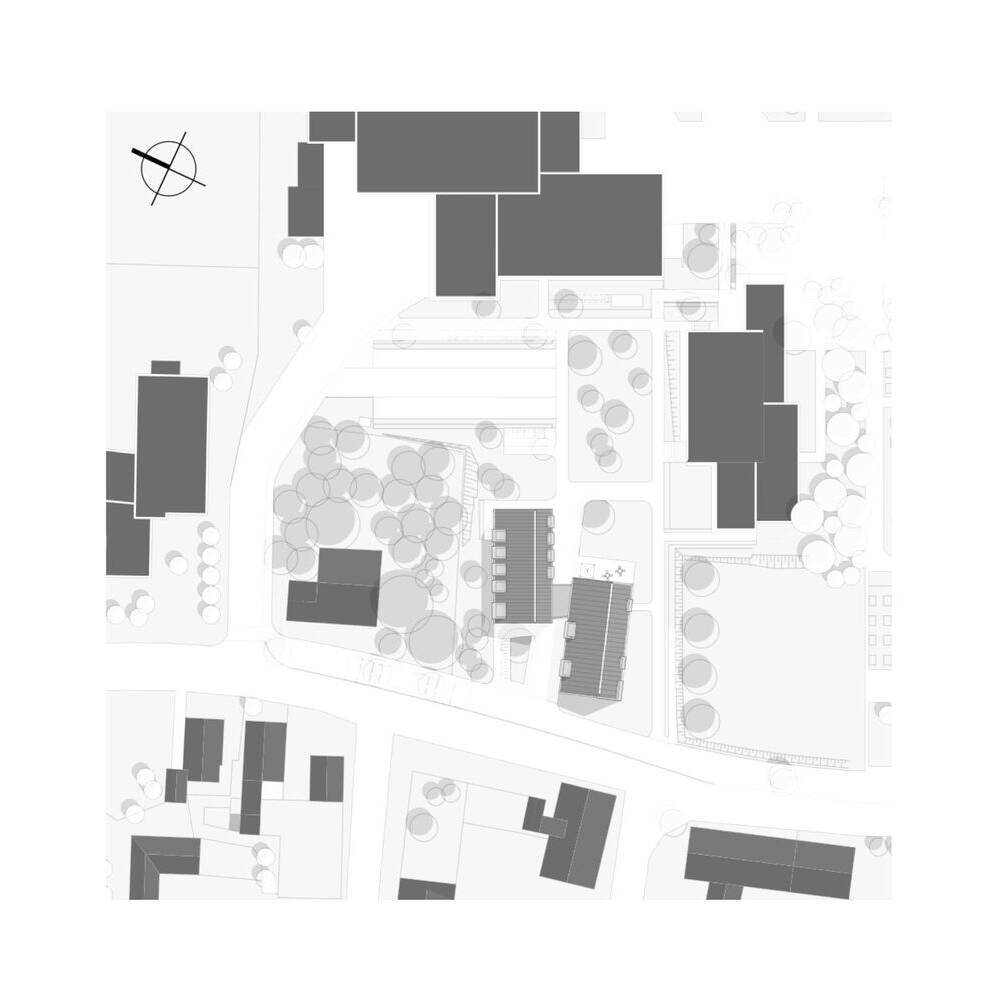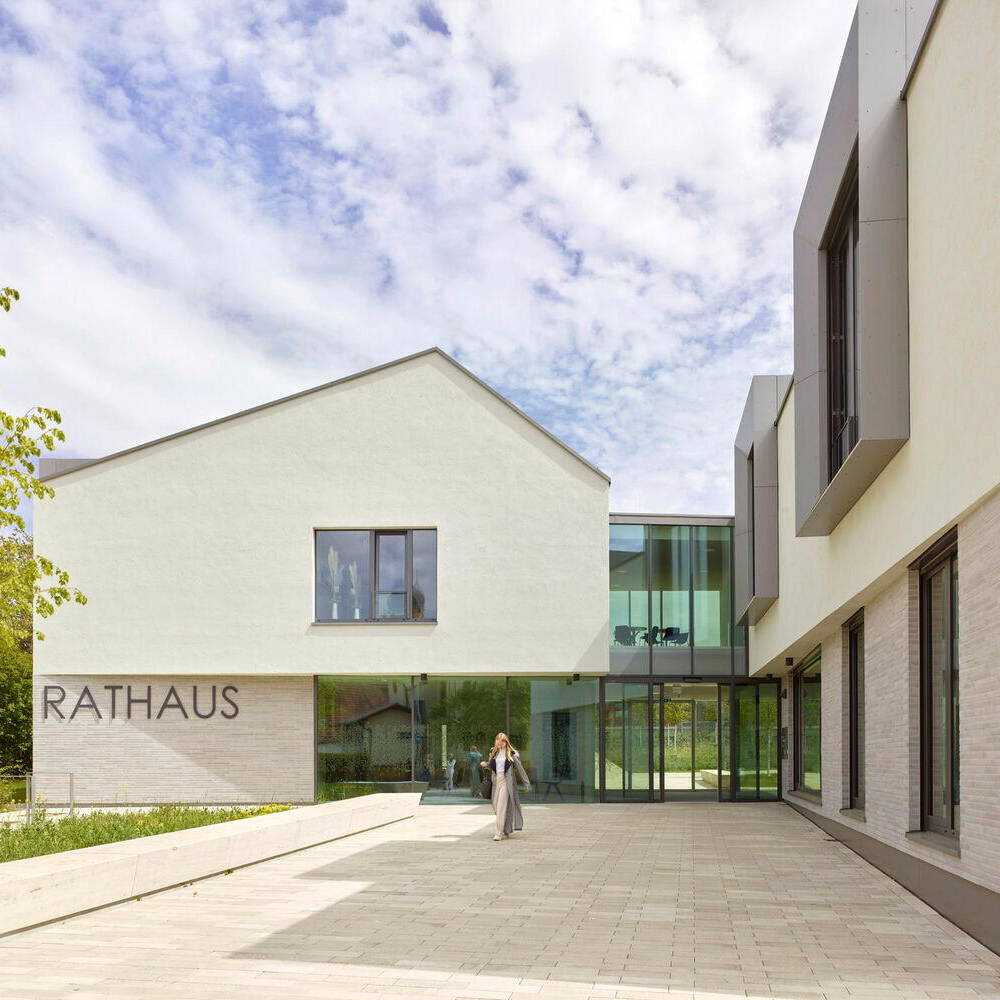 Das neue Rathaus von Unterschneidheim, entworfen vom Architekturbüro Kauffmann Theilig & Partner, schafft durch Lage, Figur und Körnung eine Überleitung zwischen dem ländlichen Stadtkern sowie den großen Gebäudestrukturen mit Schuleinrichtung und Feuerwehr im Norden und Osten. Ausgerichtet sind die beiden Gebäuderiegel in Nord-Süd-Richtung, sodass eine Durchlässigkeit zwischen den älteren und neueren baulichen Strukturen entsteht. Der neue Vorplatz mit Sitzgelegenheiten eignet sich – neben dem Aufenthalt – auch zum Durchführen kleinerer Veranstaltungen. Inspiriert vom Bestand, begrenzt die Streuobstwiese den Rathausplatz und bietet eine, in die Umgebung eingebundene, natürliche Kulisse.
