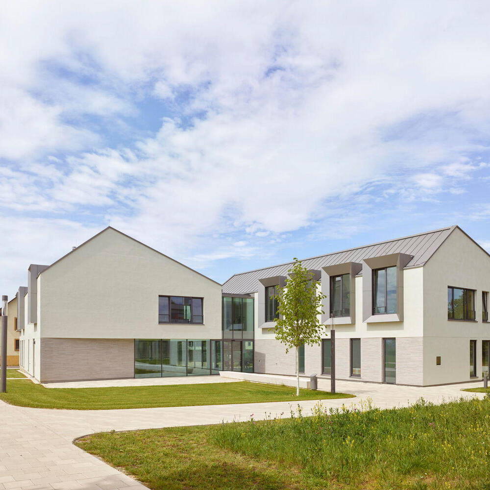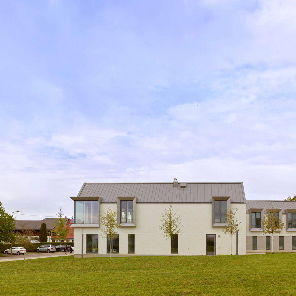 Die asymmetrischen Satteldächer wurden in Holzbauweise errichtet und mit einer matten Stehfalzdeckung versehen. Die Architekt:innen planten den Baukörper kompakt mit einem günstigen Verhältnis von Hülle zu Volumen (AV-Verhältnis), was sowohl die Herstellung als auch den Betrieb begünstigt. Versorgt wird das Gebäude mit Fernwärme der naheliegenden Schule. Die Betondecken mit Fußbodenheizung dienen zur winterlichen Grundheizung und der sommerlichen Temperierung. Alle wärmetechnischen Anlagen erhielten eine Wärmerückgewinnung.