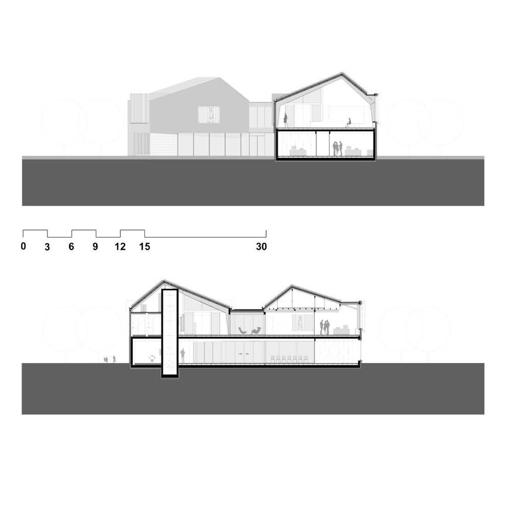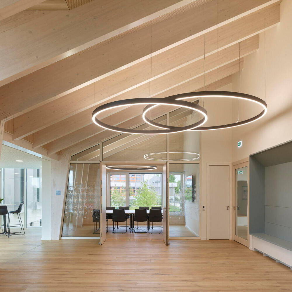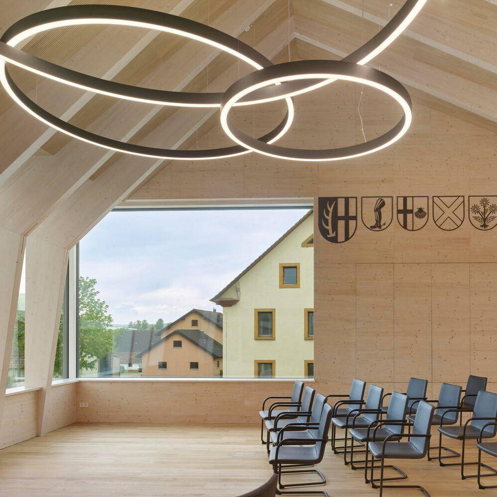 Das Gebäude ist als Zweibund organisiert und ermöglicht eine effiziente wie flexible Flächenaufteilung. Im Zentrum, das als Verteiler- und Kommunikationszone fungiert – befindet sich der Eingangsbereich mit Foyer, Wartezone und Information. Die Besprechungsräume im Erd- und 1. Obergeschoss sind so angeordnet, dass sie zu den Foyerflächen zugeschaltet werden können. Auf diese Weise lassen sich größere zusammenhängende Flächen für Empfänge, kleinere Ausstellungen und sonstige Veranstaltungen schaffen. Unter dem geneigten Dach im 1. Obergeschoss mit dem Bürgersaal entstehen großzügige Raumhöhen. Die Gauben bieten spannende Ausblicke und versorgen die Räume optimal mit Tageslicht. Dies reduziert den Einsatz künstlicher Beleuchtung sowie den Energieaufwand des Gebäudes deutlich. Während die tragenden und erdberührenden Bauteile aus Stahlbeton gefertigt sind, sind die transparenten Flächen als Holzbau konstruiert und erhielten einen außenliegenden, textilen Sonnenschutz.